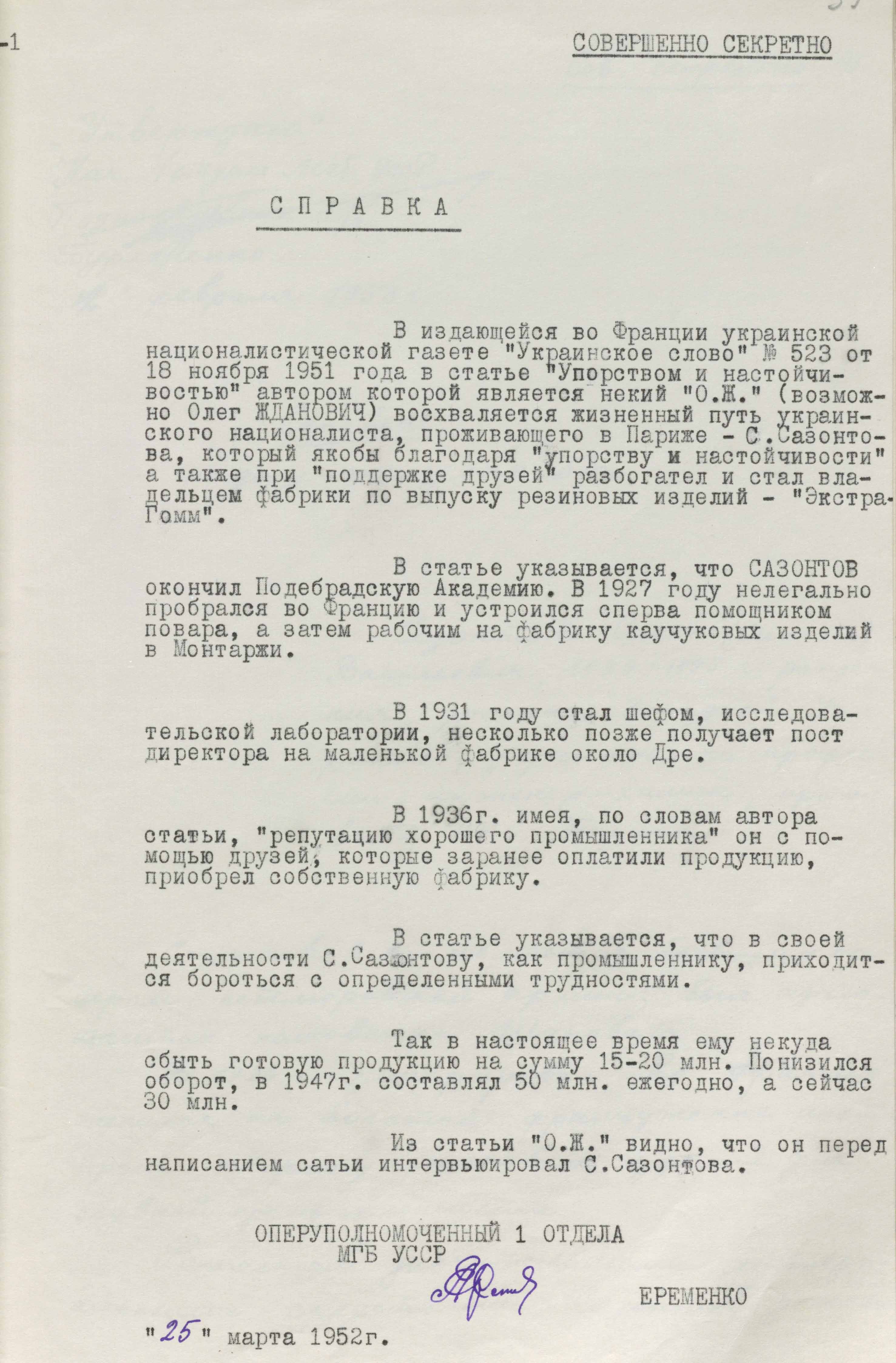 In the 1950s, the ussr kgb residentura in Paris obtained some technological secrets of rubber production for aircraft tyres through its agents. That was considered a significant achievement for soviet intelligence. So, when one of the residentura’s employees involved in the case noticed the director of a rubber products factory, they wanted to pursue the matter further. But they quickly realized that the products were unlikely to be of any interest. The factory was small. Since the 1920s, it had been manufacturing rubber soles for shoes, bicycle parts, and other products for civilian use. Among other local enterprises, the factory stood out because all of its employees were Ukrainians, as was the owner. It was Symon Vasyliovych Sozontiv who drew the attention of the kgb agents. He was of greater interest to them than any scientific or technical secrets.