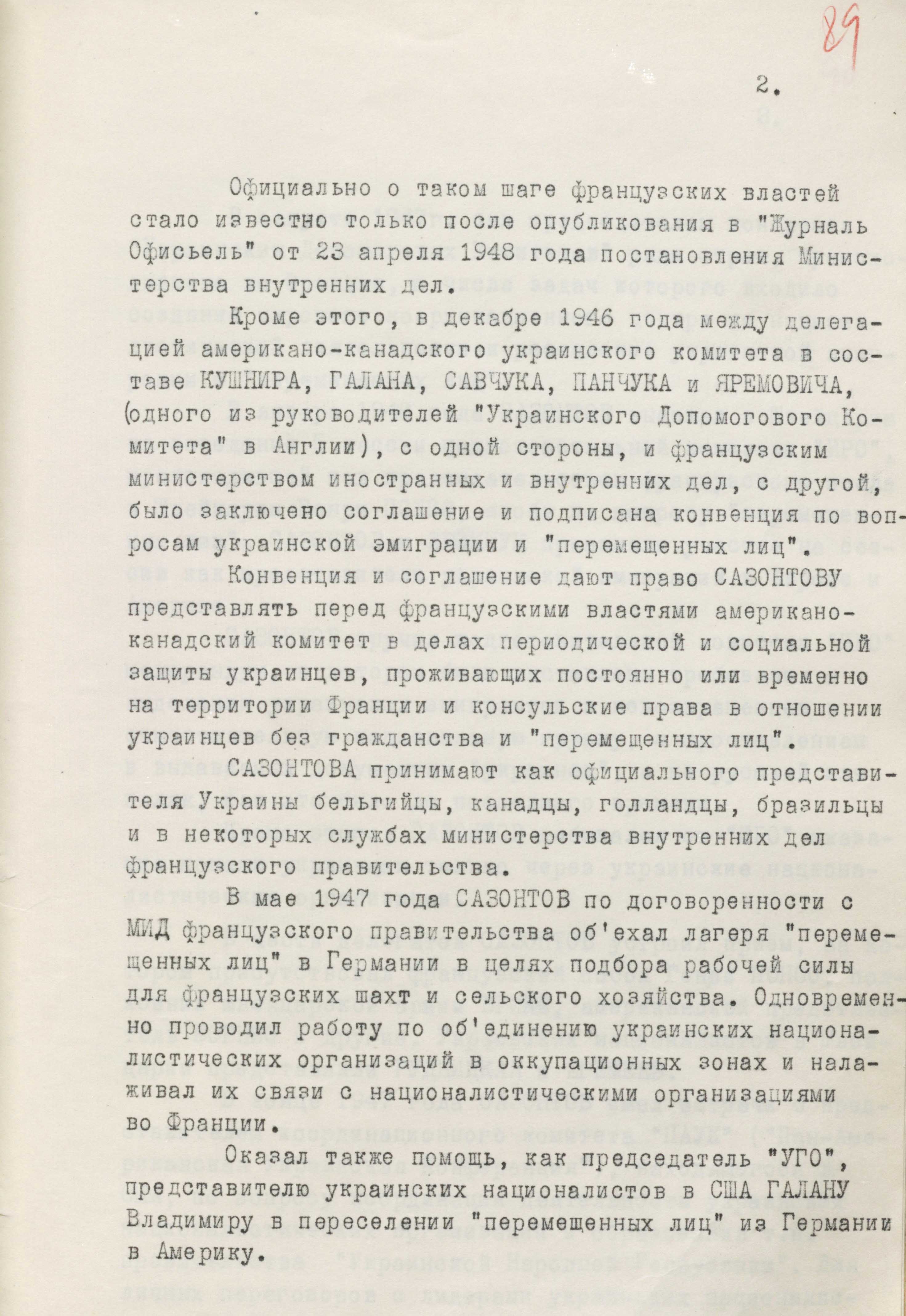 “At the end of 1946, Sozontiv created a charitable organization “Ukrainska Hromadska Opika” (“Ukrainian Public Care”– Transl.) – reads one of the kgb documents – “which, with the assistance of the American-Canadian Ukrainian Committee, was soon recognized by the French Ministry of Foreign Affairs and the Ministry of the Interior as a Ukrainian ‘office’ with consular functions, and Sozontiv then began to act as ‘Ukrainian consul’ before foreigners,” (FISU. – F. 1. – Case 10800. – Vol. 2. – P. 84).