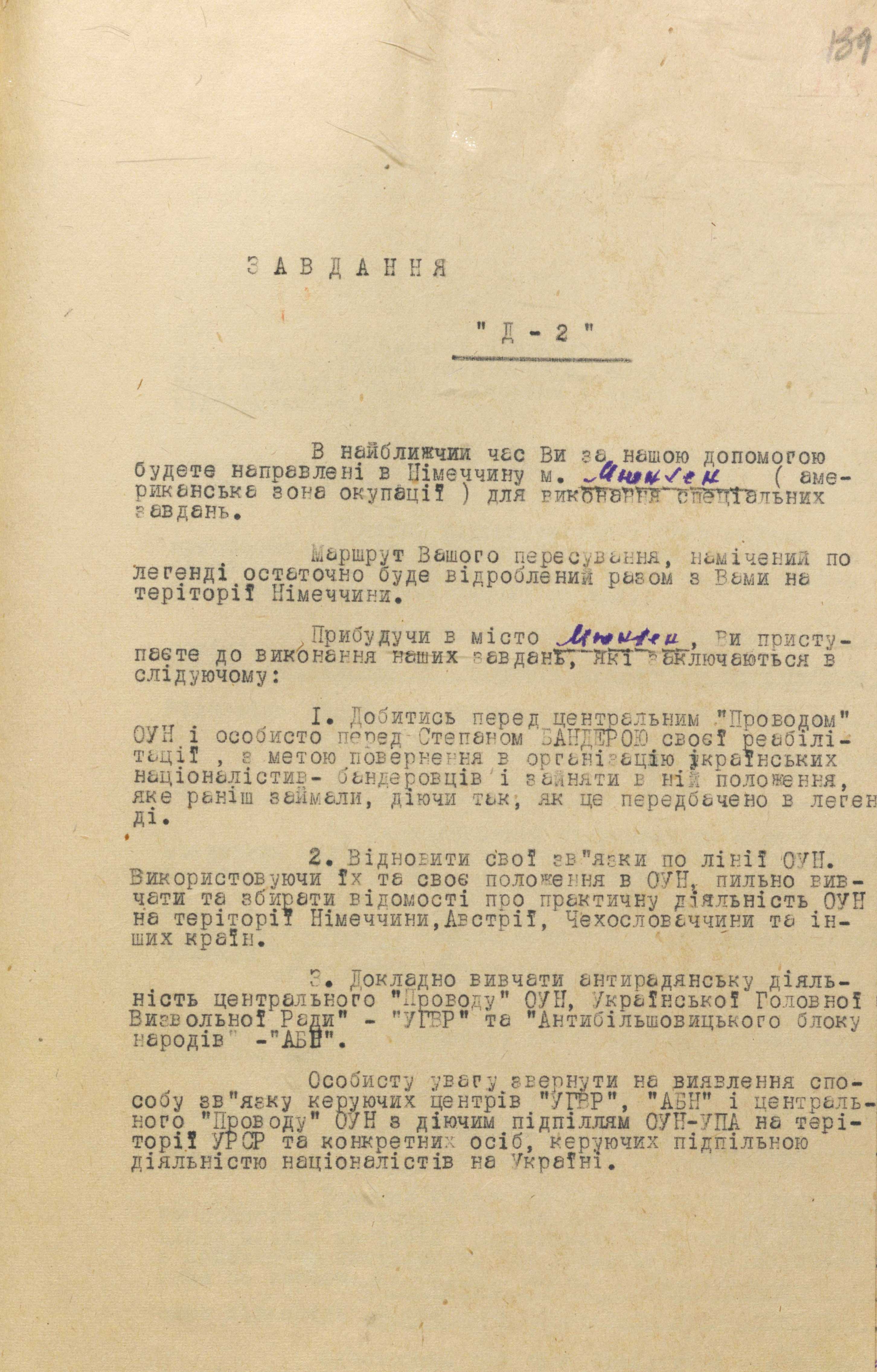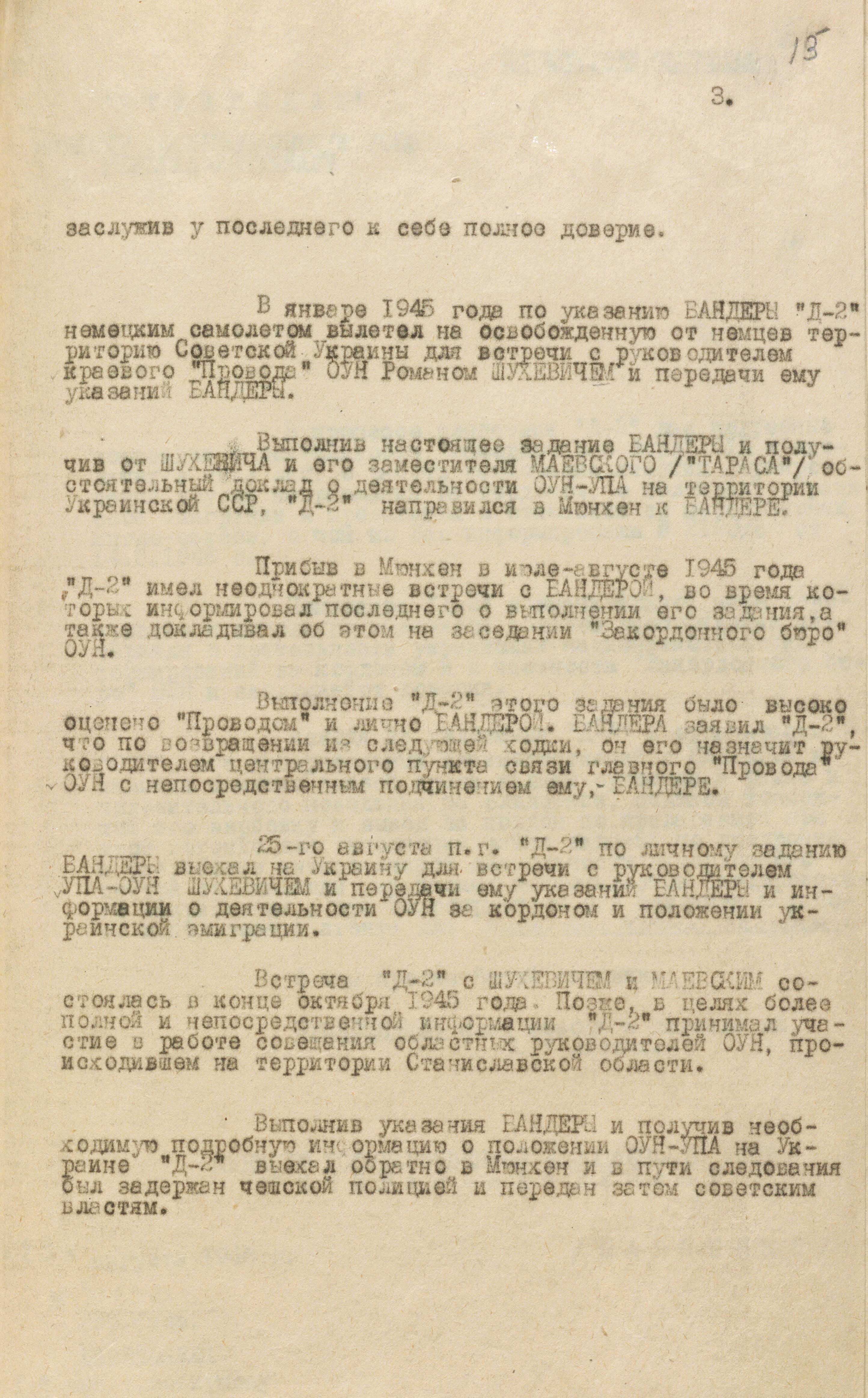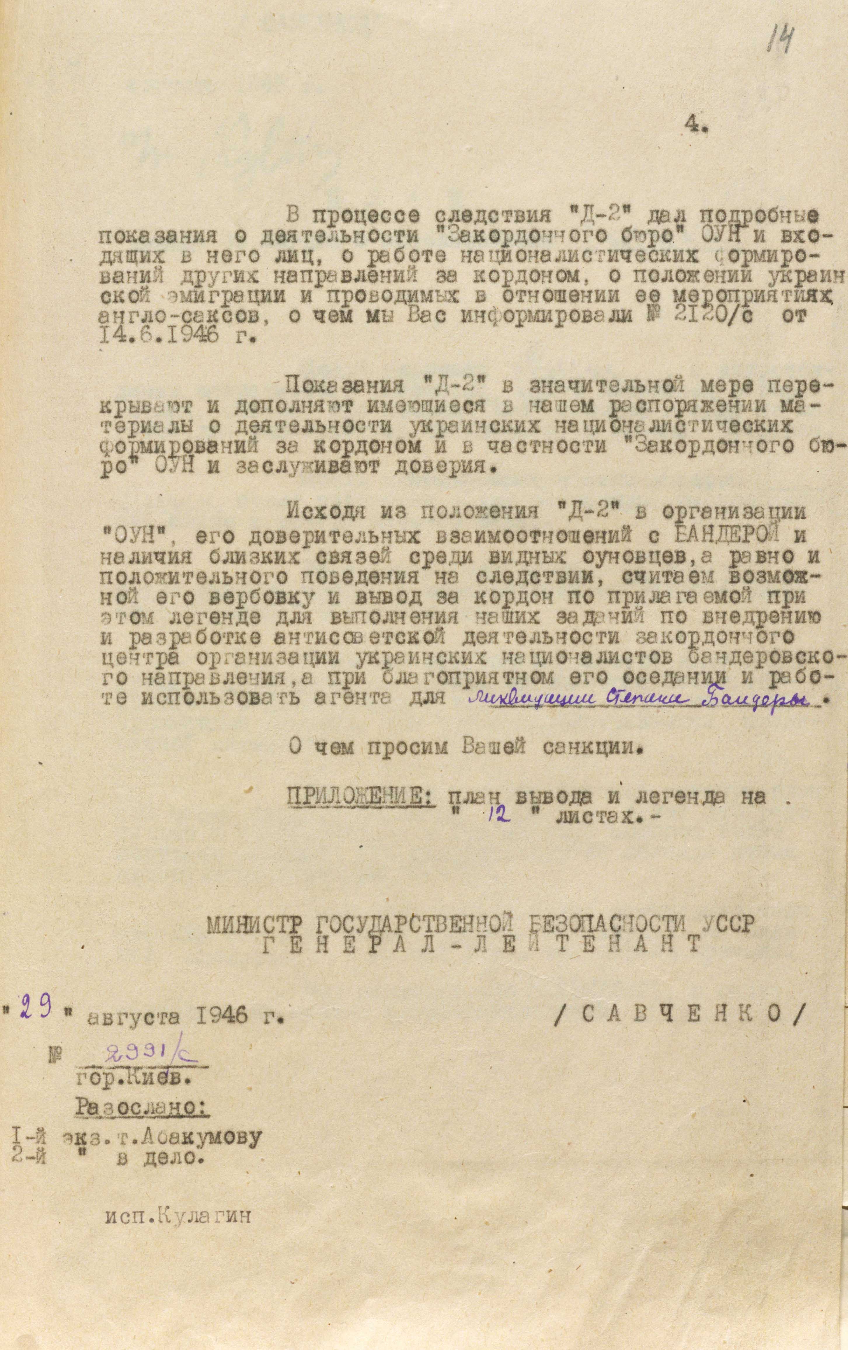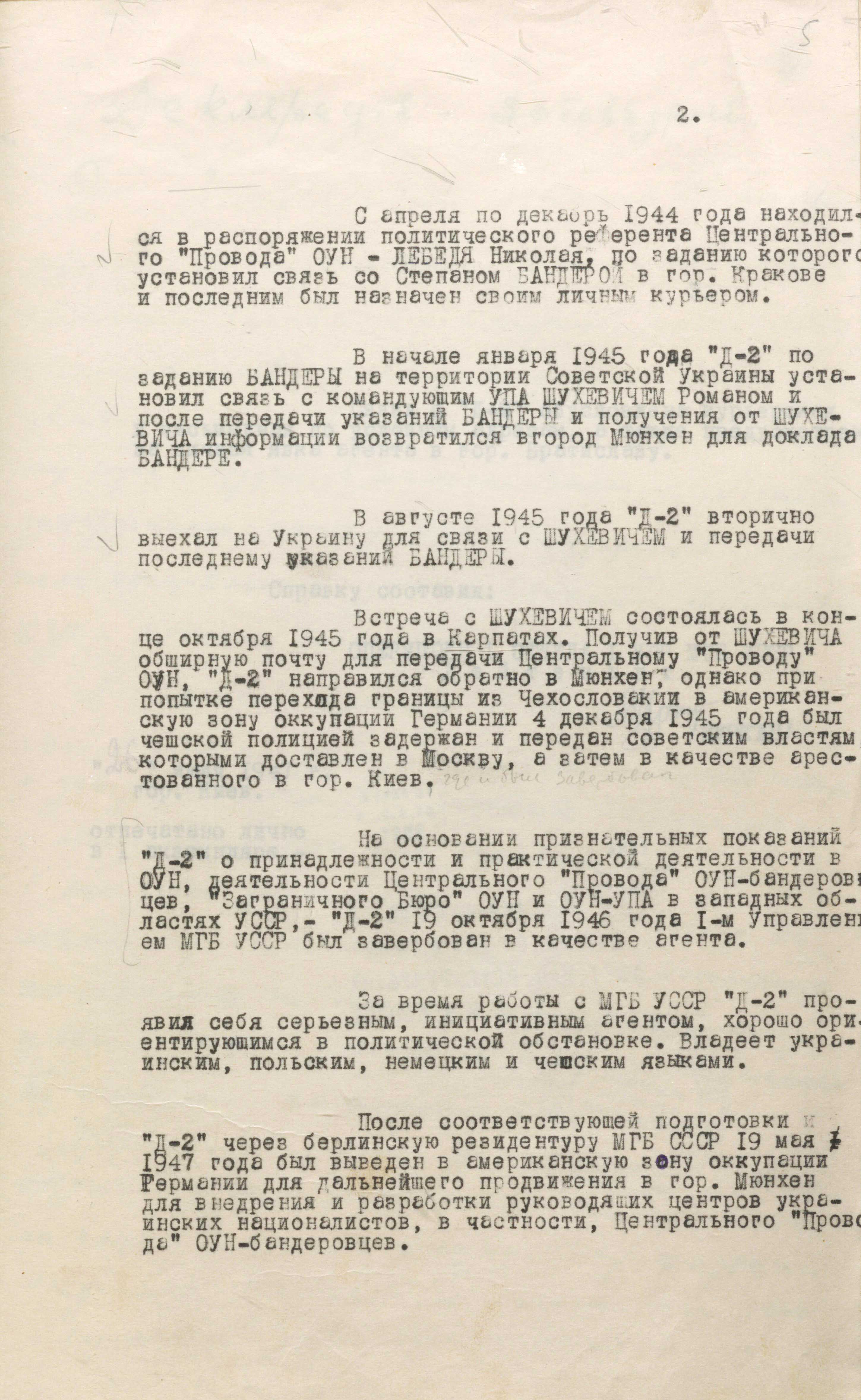 29 серпня 1946 року з Києва до москви на ім’я міністра держбезпеки В. Абакумова надіслали спецповідомлення, в якому зазначалося таке: «З урахуванням становища “Д-2” в організації ОУН, його довірчих взаємостосунків із Бандерою та наявності близьких зв’язків із визначними оунівцями, а також його позитивної поведінки під час слідства вважаємо можливим його вербування і виведення за кордон за “легендою”, що додається, для виконання наших завдань із впровадження до Закордонного центру організації українських націоналістів бандерівського спрямування і розробки їх антирадянської діяльності, а за сприятливого осідання й роботи використати агента для ліквідації Степана Бандери» (ГДА СЗРУ. – Ф. 1. – Спр. 30. – Т. 4. – Арк. 14).