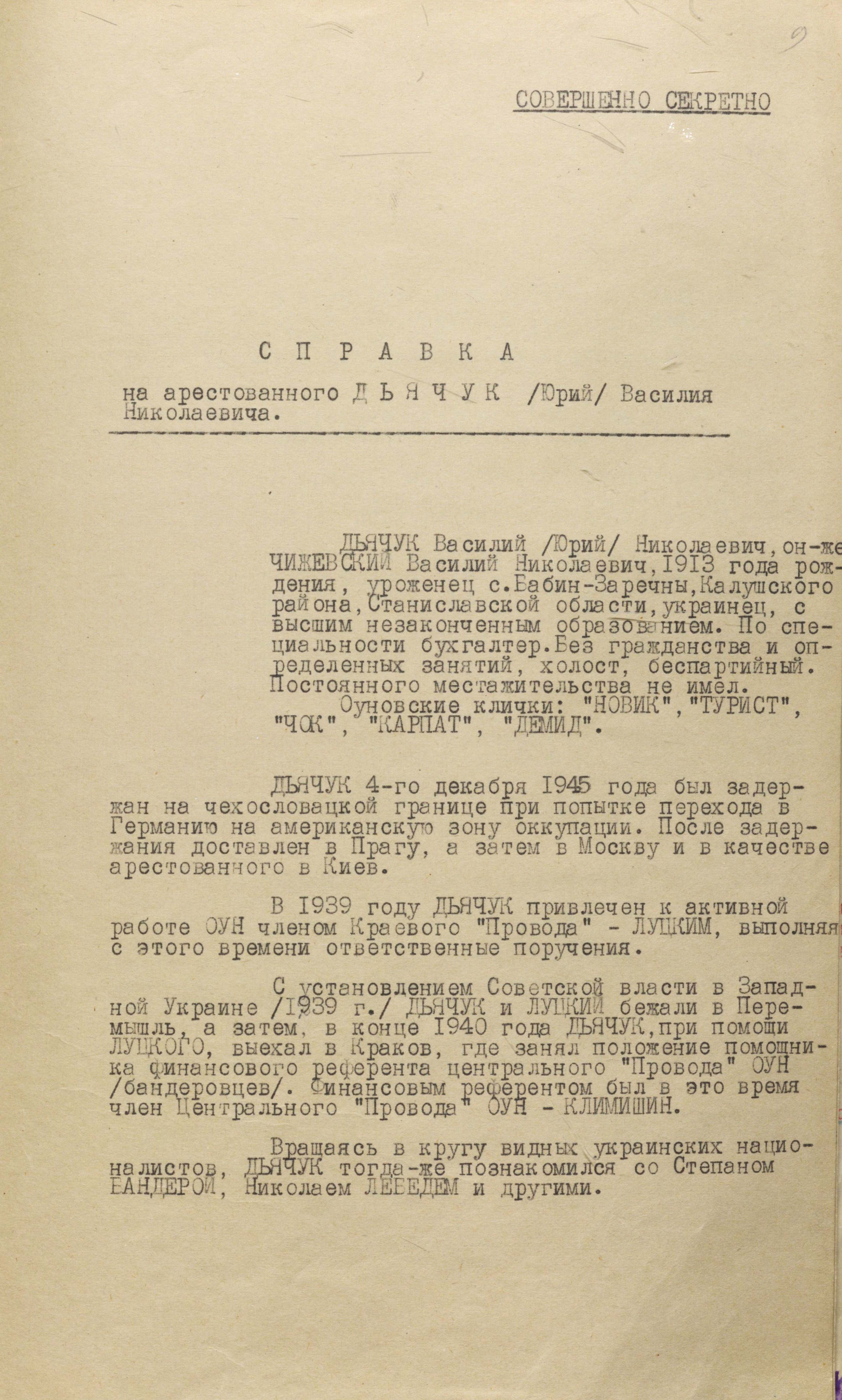 Згідно з цими документами, Василь Миколайович Чижевський народився у 1913 році в селі Бабин-Зарічний Калуського повіту (нині – Івано-Франківська область). До лав ОУН його залучив у 1930 році однокашник Олександр Луцький під час навчання в гімназії. У різні періоди в ОУН мав псевдо «Артим», «Денис», «Дячук», «Демид». Неодноразово заарештовувався польською поліцією за підпільну націоналістичну діяльність. У 1939 році після встановлення радянської влади на Західній Україні втік до Кракова. Працював в Українському допомоговому комітеті і водночас помічником фінансового референта Центрального Проводу ОУН. Навчався у старшинській школі. Тоді ж познайомився зі С. Бандерою, М. Лебедем та іншими провідними діячами.