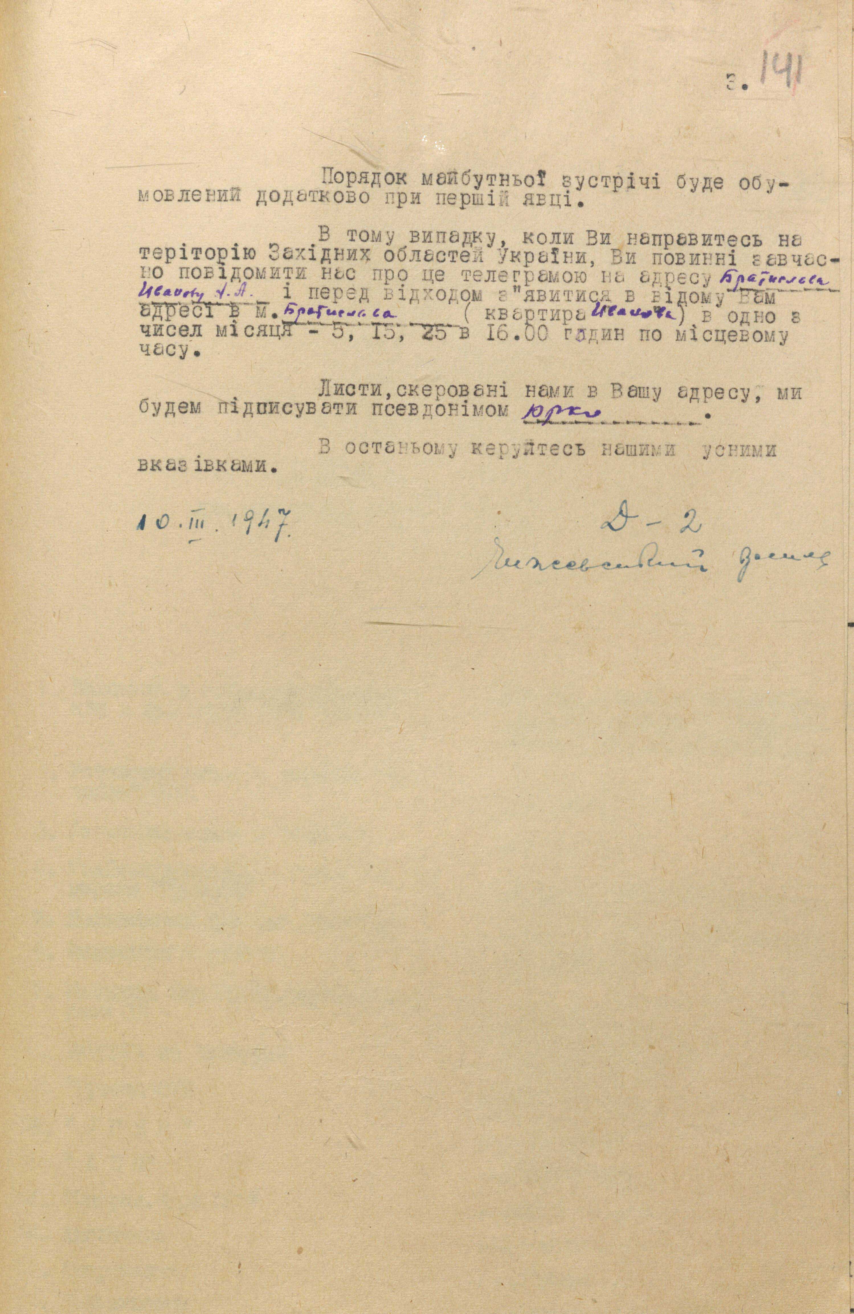 Із такою «легендою» «Д-2» відрядили до москви. Звідти передали берлінській резидентурі мдб срср, співробітники якої через свої канали переправили його 19 травня 1947 року до Західної Німеччини.