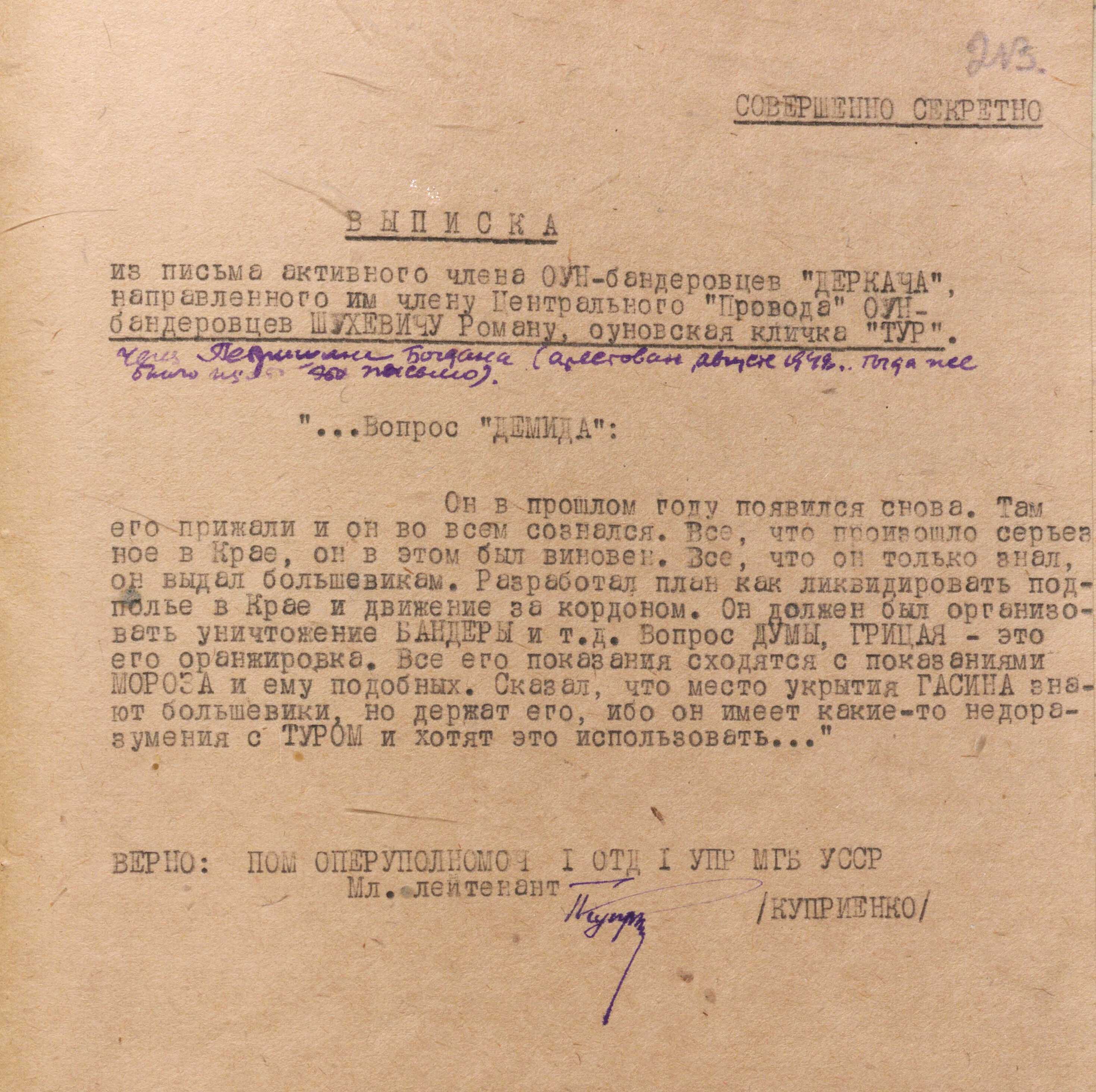 «…Там його притиснули, – йшлося в листі від “Деркача” до Р. Шухевича, – і він у всьому зізнався. Все, що відбулося важливе в Краю, в цьому він був винен. Все, що знав, він виказав більшовикам. Розробив план, як ліквідувати підпілля в Краю і рух за кордоном. Він повинен був організувати знищення Бандери і т. п.» (ГДА СЗРУ. – Ф. 1. – Спр. 30. – Т. 4. – Арк. 213).