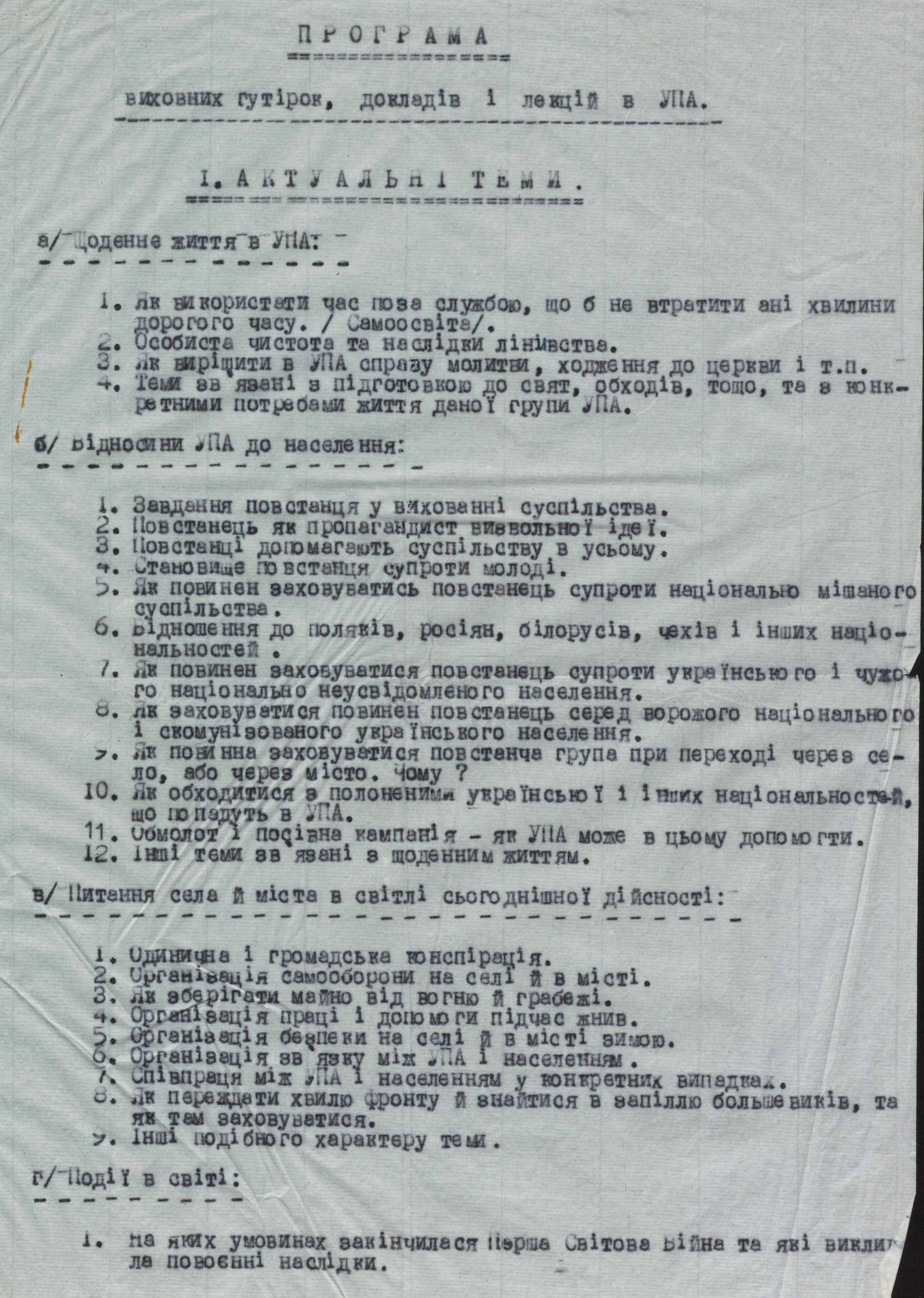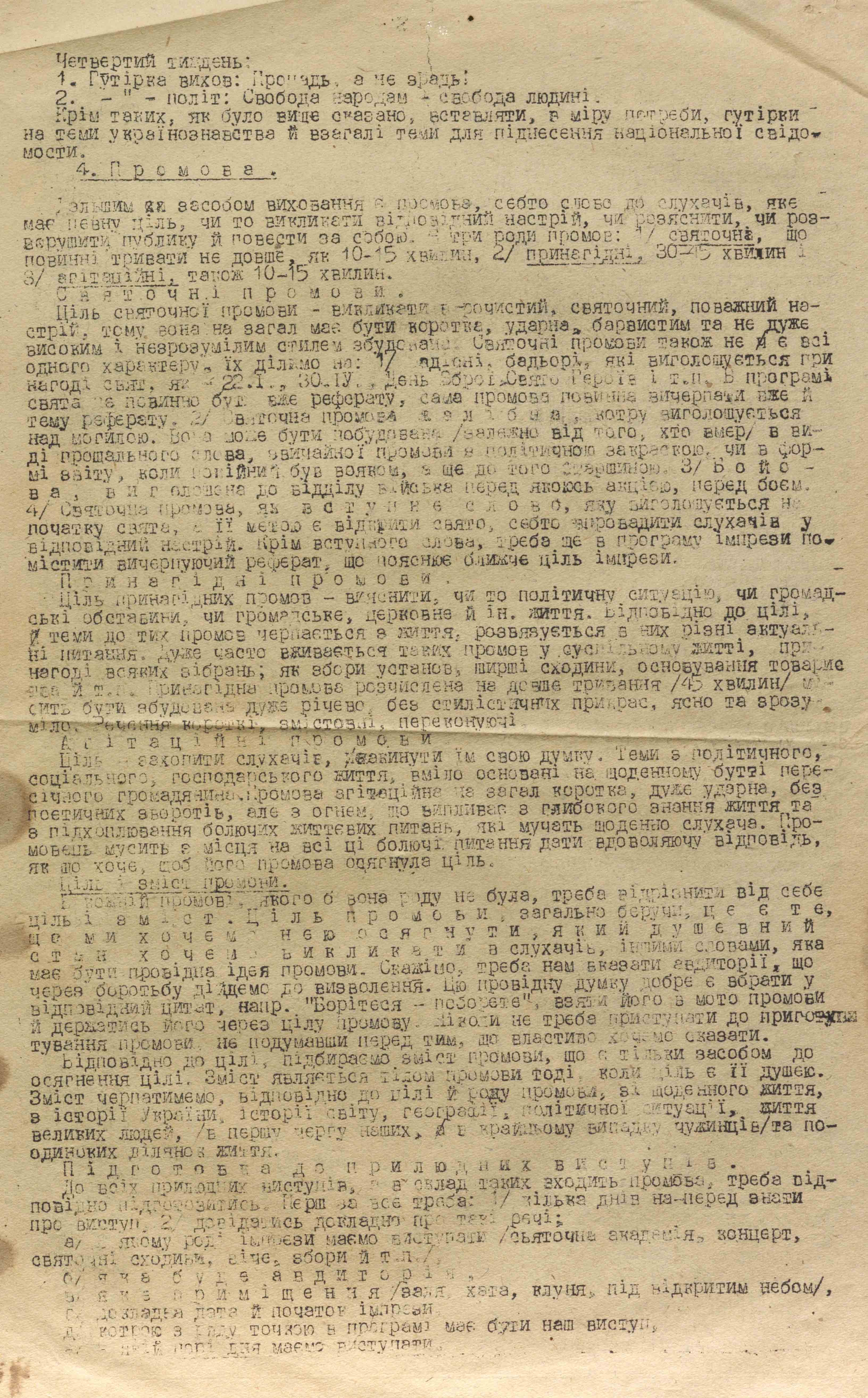 Більшість матеріалів датована другою половиною 1943 року. У них – методичні рекомендації з проведення політико-виховної роботи, інструкції, накази, конспекти, листівки і власноруч зроблені нотатки. Один із перших наказів зобов’язує політвиховників УПА сконтактуватися з політичними референтами ОУН на тих теренах, де перебуває військо, і спільно вести роботу. Тобто обговорювати назрілі питання, проводити різні заходи для населення, зокрема до свят, обмінюватися літературою.