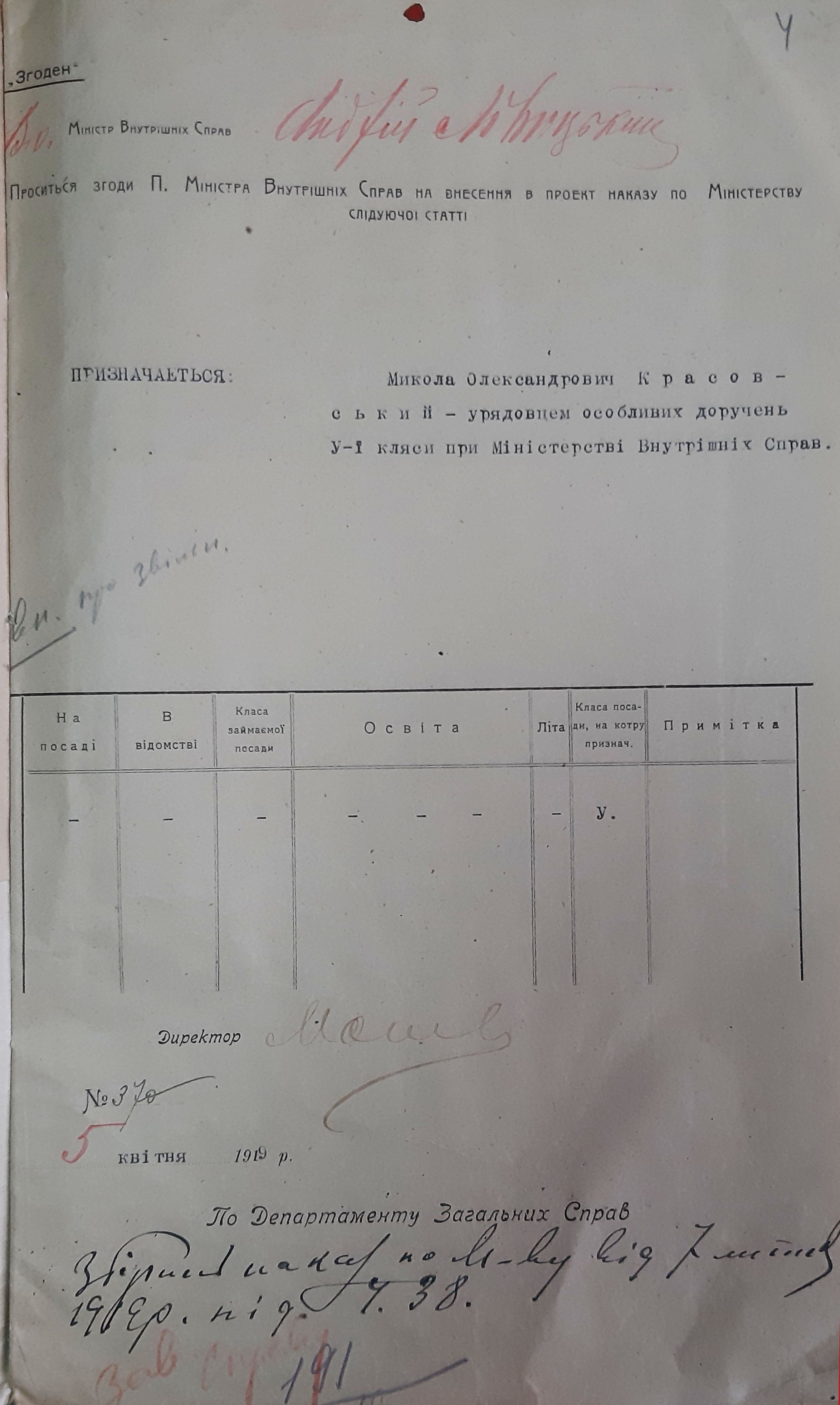 В архіві збереглася його рукописна заява про призначення на роботу на ім’я міністра внутрішніх справ УНР, датована 2 квітня 1919 року. Спершу в ранзі урядовця з особливих доручень він долучався до формування й розгортання діяльності відділів внутрішньої та закордонної інформації. У квітні 1920 року в Кам’янці, де тоді розташовувалися урядові установи, від військового міністра отримав вказівку розробити структуру і штат нового розвідувального органу. Підготовлені документи були затверджені 19 травня того самого року у Вінниці Головним Отаманом військ і флоту УНР Симоном Петлюрою.