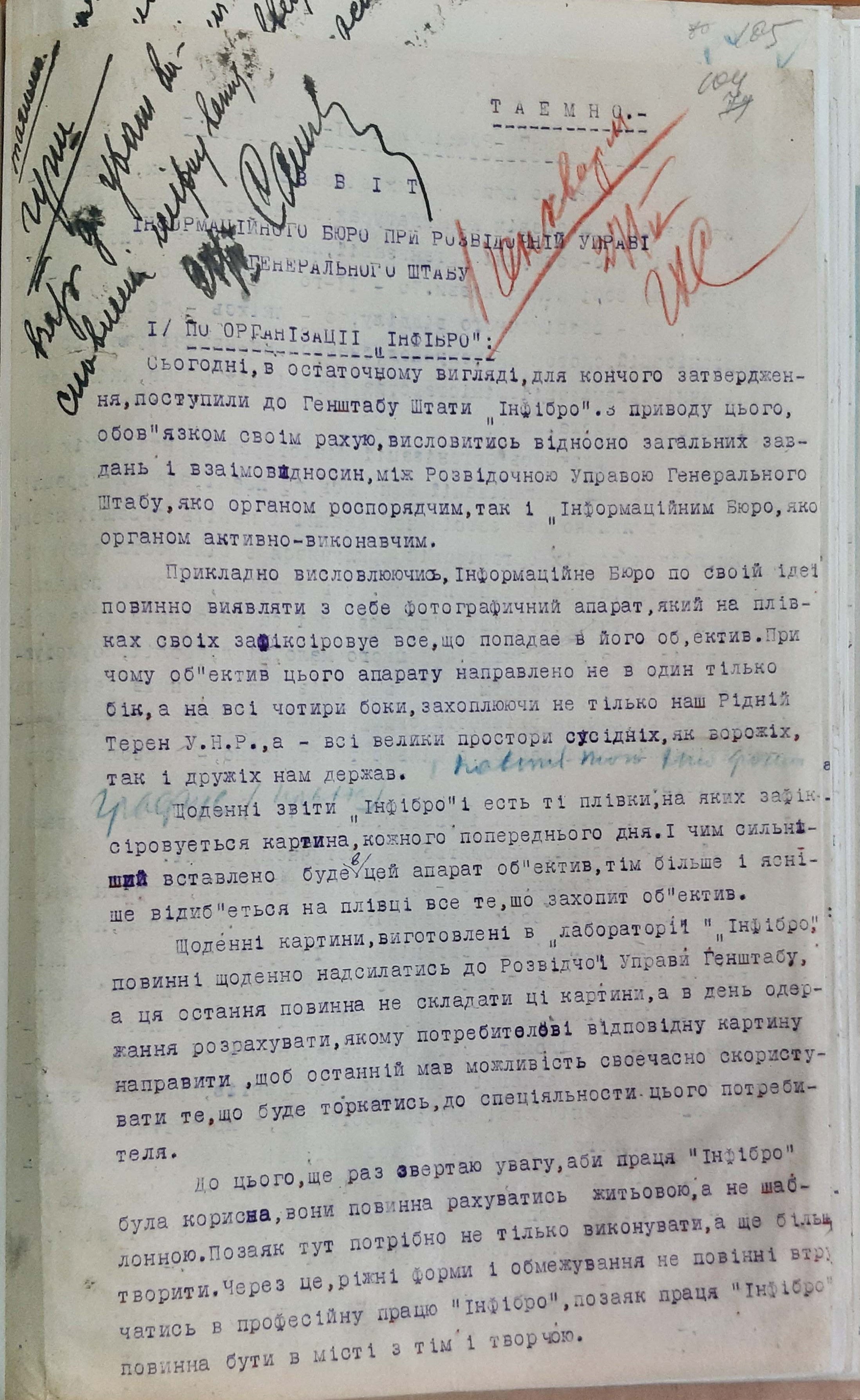 Щоденні картини, виготовлені в “лабораторії” “Інфібро”, повинні надсилатись до Розвідочної управи Генштабу, а ця остання не повинна складати ці картини, а в день одержання розрахувати, якому потребителеві відповідну картину направити, щоб останній мав можливість скористувати те, що буде торкатись до спеціальности цього потребителя»