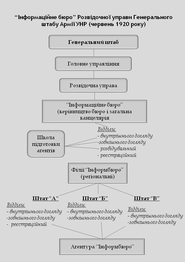 Водночас для вдосконалення структури центрального апарату військової розвідки і створення регіональних органів із широкомасштабним планом дій у травні 1920 року при Генштабі було створене Інформаційне бюро. Структурно воно входило до складу Розвідочної управи Генштабу. Але фактично діяло як самостійний головний робочий орган військової розвідки та контррозвідки Збройних сил республіки і стало, по суті, окремою спецслужбою, хоч це і зумовлювало певні дублювання в роботі Розвідочної управи.