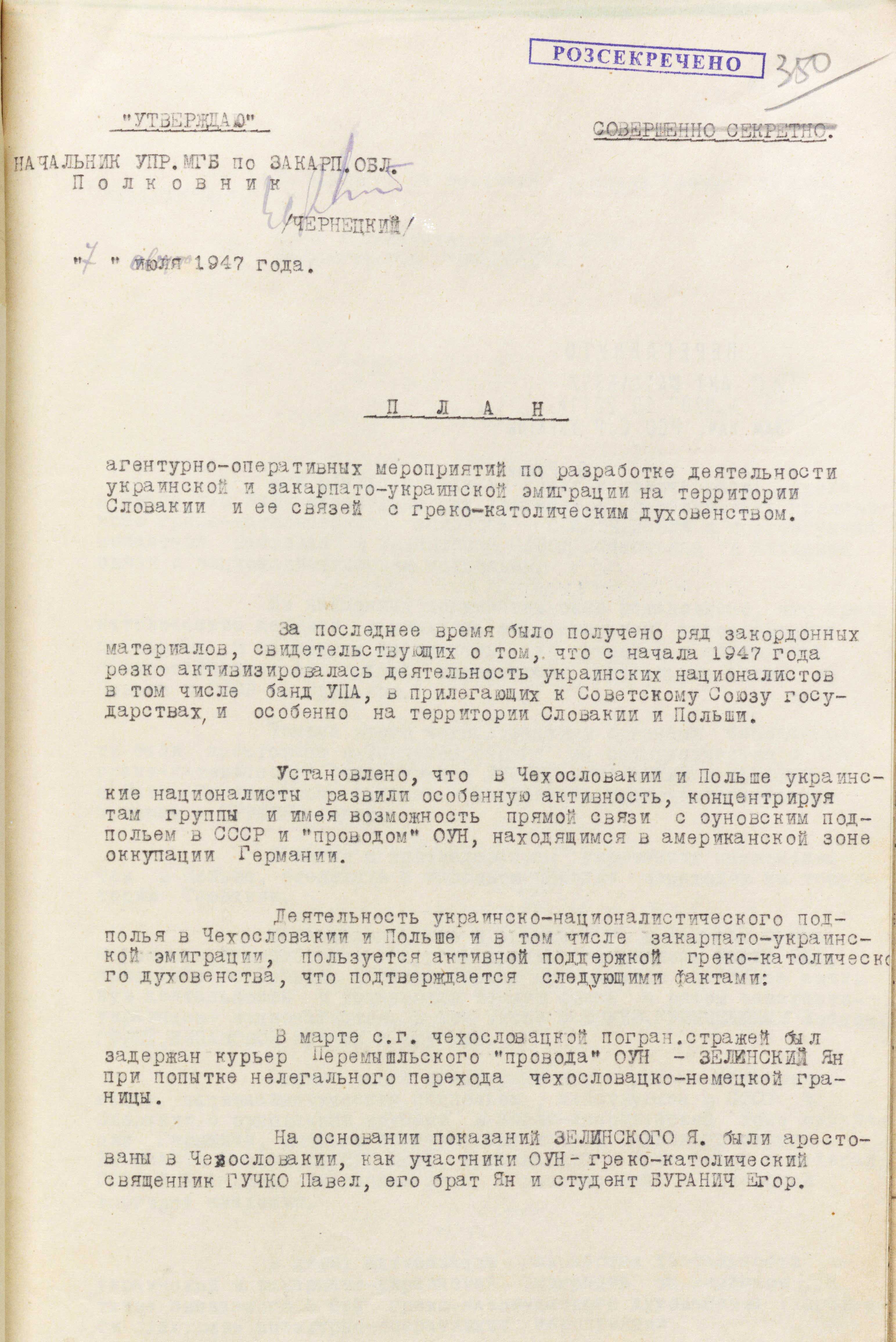 Інші матеріали справи свідчать про те, що в подальшому цілеспрямовано збиралася інформація про ГКЦ і нібито якусь незаконну діяльність українських священників. Зазначалося, що загальна кількість вірних – приблизно 250 000 осіб. Керівництво церкви на чолі з єпископом Гойдичем знаходиться в Пряшеві. Кістяк вірних становлять українці, які мешкають у Словаччині, а також ті, що емігрували з Польщі і радянської України, зокрема Закарпаття.