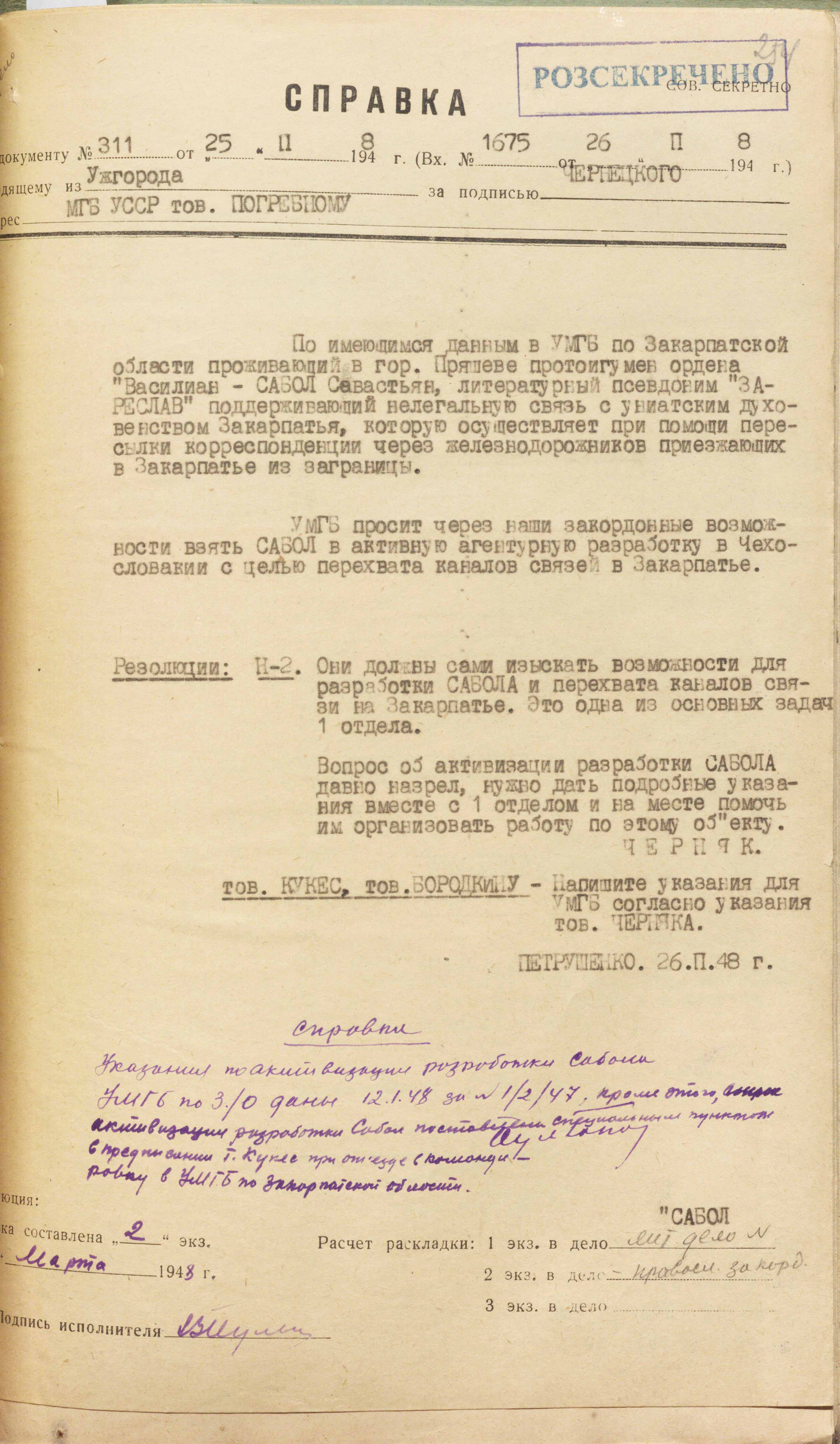 Також встановлено, що значну роль в антирадянській українській націоналістичній діяльності греко-католицького духовенства в Чехословаччині відіграє настоятель монастиря монашого ордену “Василіан” у м. Требишеві протоігумен Севастіян Сабол, який має велику підтримку у Ватикана. Сабол – один із ідеологів українського націоналізму, в Закарпатті відомий як поет (літературний псевдонім Зореслав), непримиренний ненависник Радянського Союзу. Він брав активну участь в українському націоналістичному русі на Закарпатті у період волошинщини. Після окупації угорцями Закарпатської України емігрував до Словаччини. Підтримує нелегальний зв’язок із греко-католицьким духовенством Закарпатської області і єпископом Ромжею, якому пересилає листи і директивні вказівки з Ватикану. У своєму монастирі він переховує бандерівців, забезпечує їх документами і переправляє за межі Чехословаччини в різні країни, зокрема до Америки»