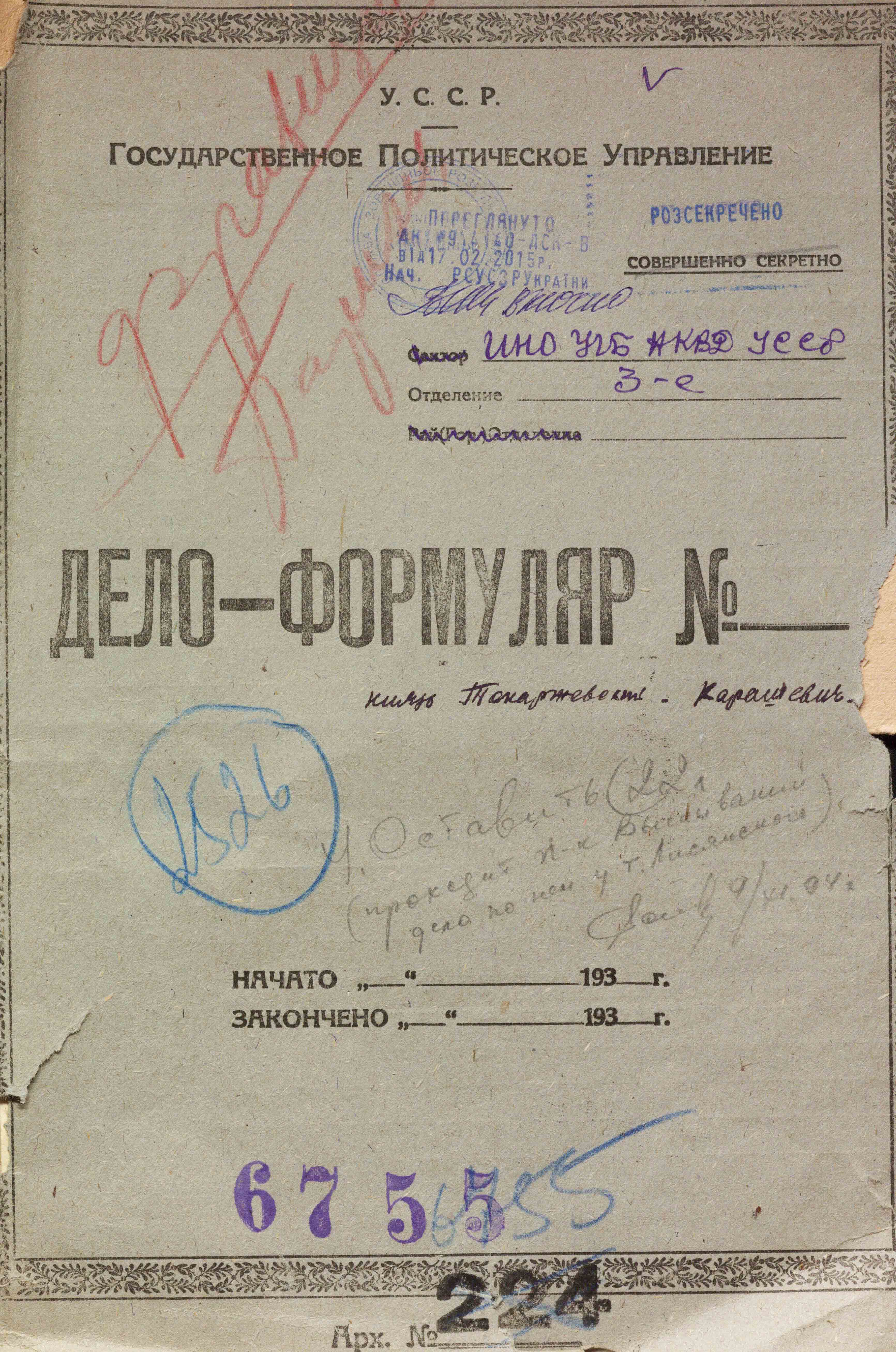 The case file on I. Tokarzhevskyi- Karashevych was opened by the nkvd in the mid-1930s. At that time, he lived in France (from 1924 to 1936) and tried to be useful to the Ukrainian cause. He was a member of the France-East Committee, and an editor of the La France et l'Ukraine bulletin, Secretary General of the French Society of Ukrainian Studies. He wrote for various journals, and lectured on historical topics.