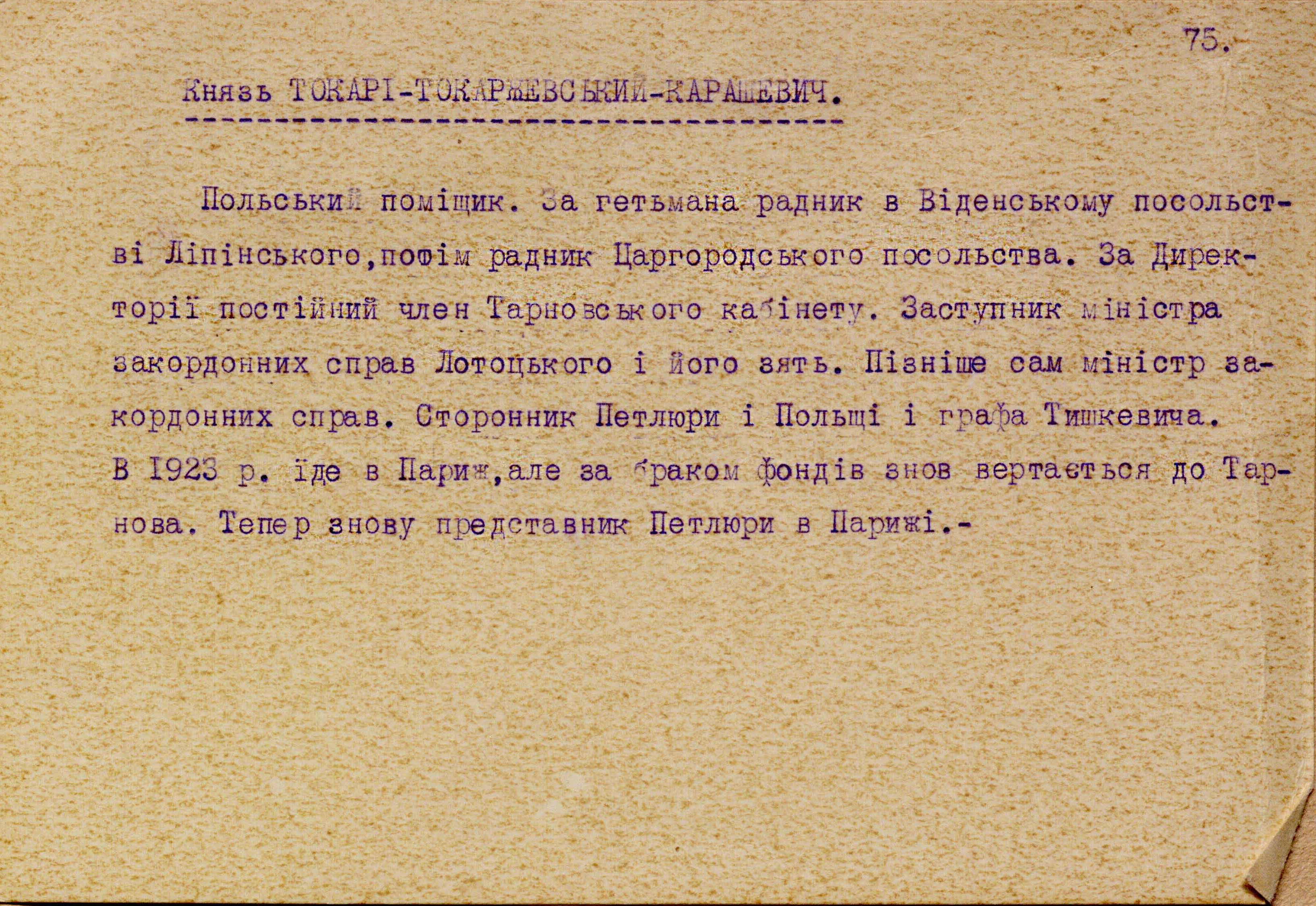 The chekists never managed to compile a more or less detailed biographical profile on him. His case file contains only brief information of the following content: “Kniaz Tokari-Tokarzhevskyi. Polish landowner. Under the Hetman, he was an Advisor to Lypynskyi’s Embassy in Vienna, then an Advisor to the Embassy in Constantinople. Under the Directory, he was a permanent member of the Tarnov Cabinet. Foreign Minister Lototskyi’s Deputy and son-in-law. Later he himself was the Minister of Foreign Affairs. A supporter of Petliura, Poland, and Count Tyshkevych. In 1923, he went to Paris, but due to lack of funds, he returned to Tarnov. Now he is again Petliura's representative in Paris” (BSA of the SZR of Ukraine. - F. 1. – Case 6755. - P. 2).