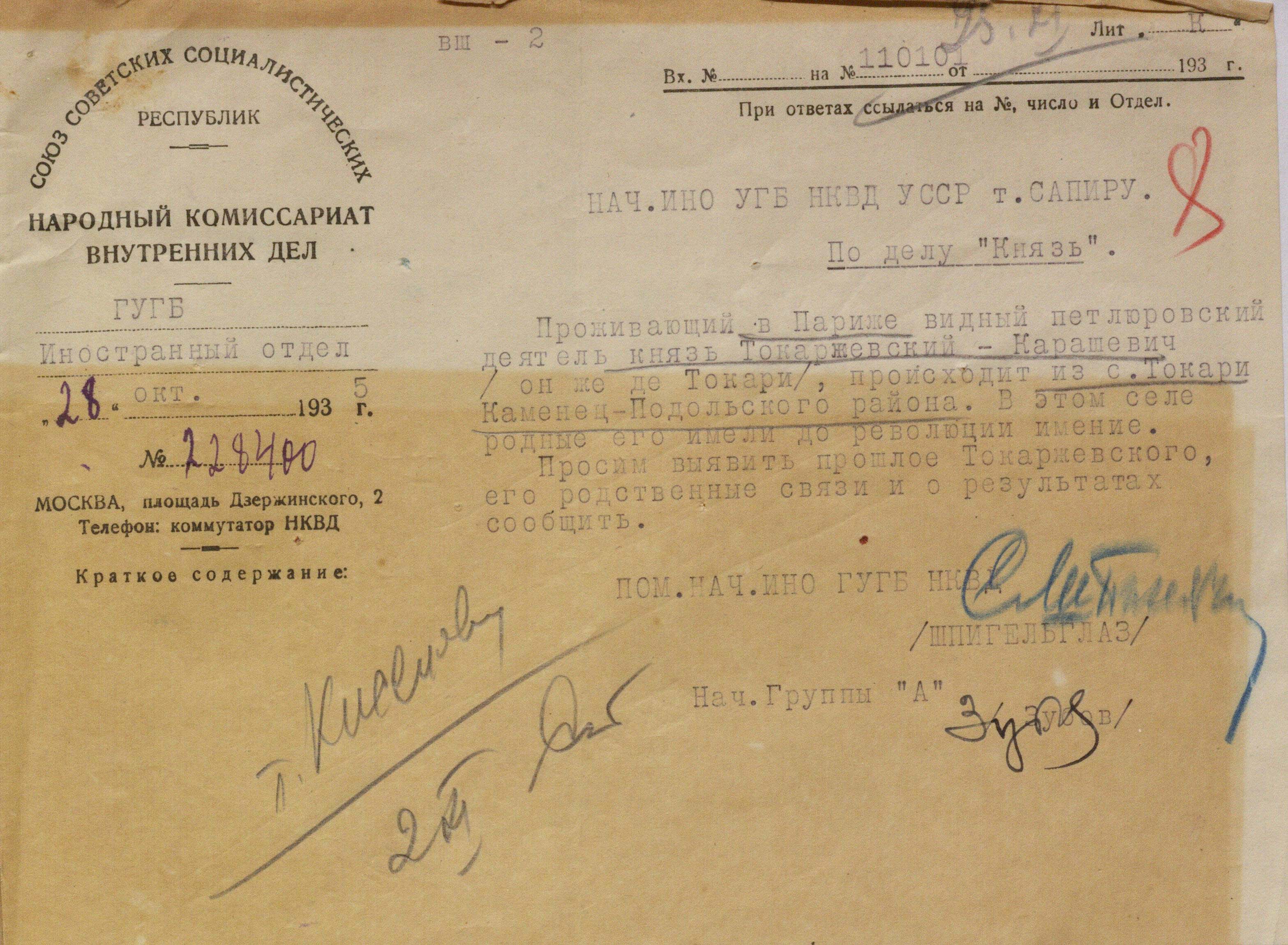 Ivan Tokarzhevskyi-Karashevych’s name appears in various case-files from the archives of the Foreign Intelligence Service of Ukraine, including those of diplomat Oleksandr Shulhyn, Ukrainian emigrants in France, Italy, England, and some others. In chekists’ documents, he appears as “Kniaz” (“Prince”- Transl.) Yan Tokarzhevskyi- Karashevych, Tokar-Tokarzhevskyi, de Tokari, and so on. The rare surname and several names given at birth caused some confusion in the cultivation. And constant moving from one country to another also posed significant obstacles to thorough tracking of his activities. At the same time, scattered documents allow us to understand, at least in fragments, what the stalinist secret services’ operational interest in him was based on.