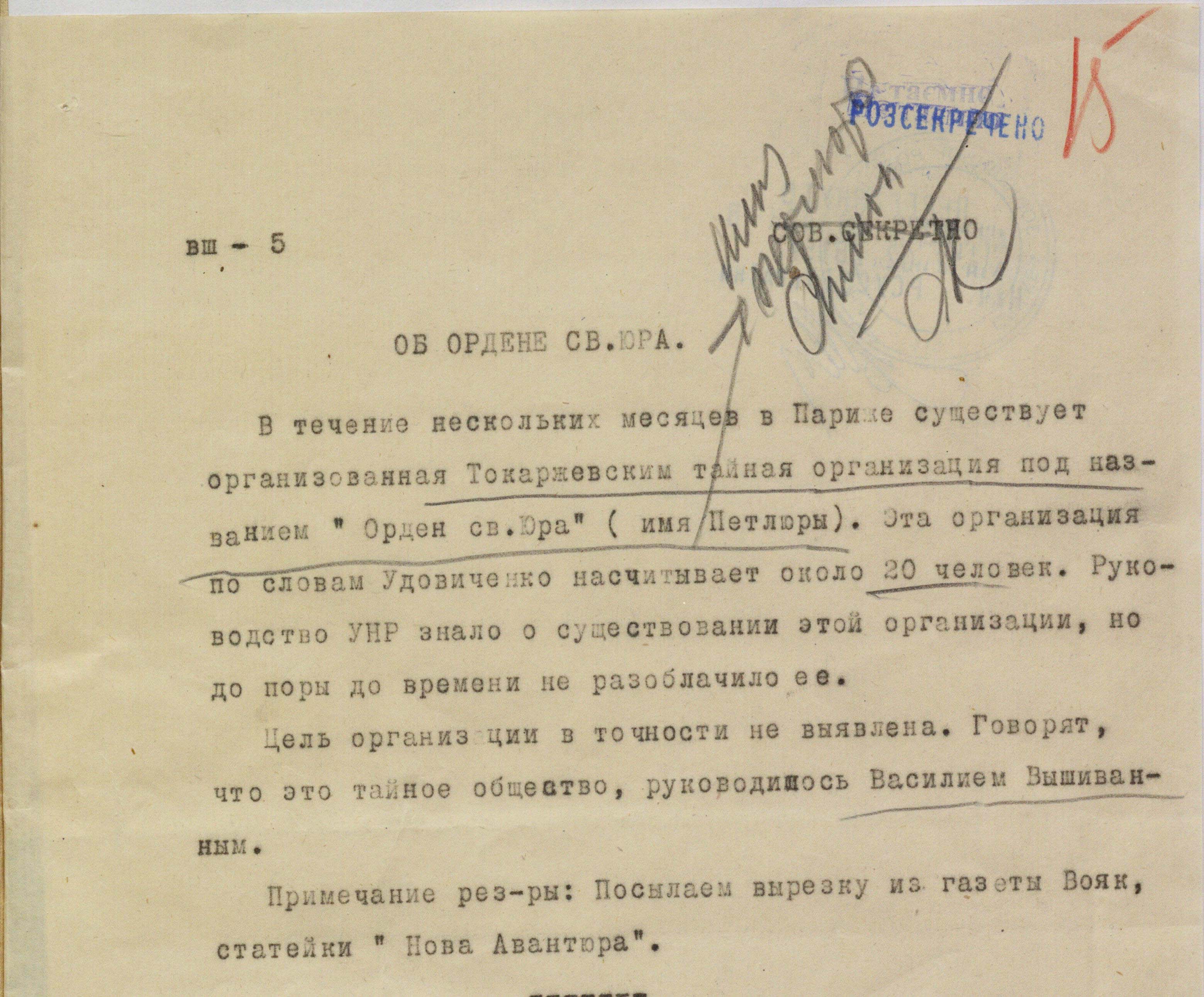 “For several months”, reads one of the documents, “a secret organization created by Tokarzhevskyi and called the Order of St. Yuriy (Petliura's name) has been operating in Paris. This organization... has about 20 members... The aim of the organization is not clear. This secret society is said to be led by Vasyl Vyshyvanyi” (BSA of the SZR of Ukraine. - Vol. 1. - Case 6755. - P. 15).