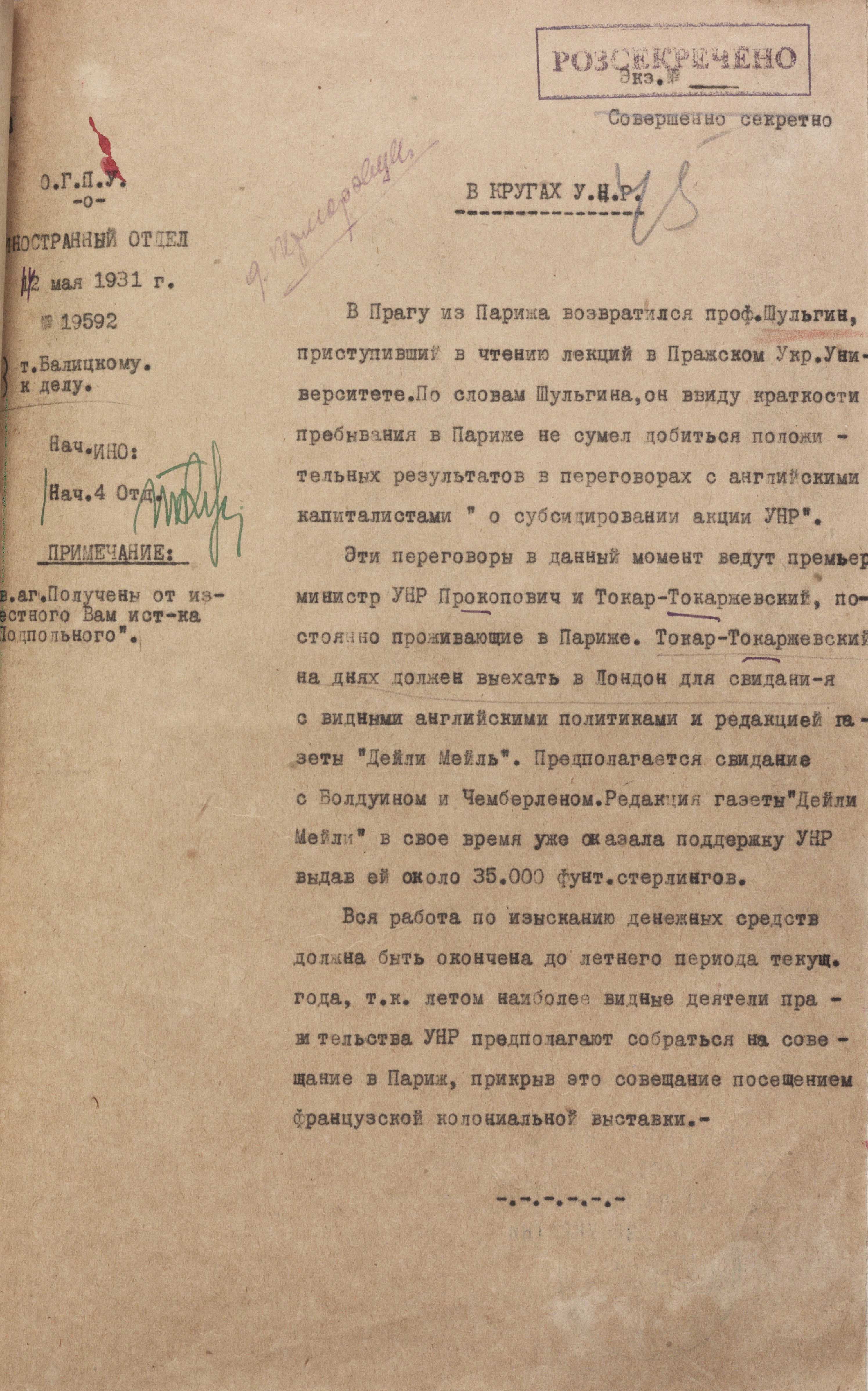 Another document states that Prime Minister of the UPR Viacheslav Prokopovych and former Minister of Foreign Affairs of the emigrant government, Yan Tokarzhevskyi-Karashevych, “are negotiating with English capitalists to subsidize UPR shares”. To this end, Tokarzhevskyi-Karashevych is to “travel to London to meet with prominent English politicians and the editorial board of the Daily Mail. He is supposed to meet with Baldwin and Chamberlain. The editorial board of the Daily Mail newspaper has already supported the UPR by donating about 35,000 pounds sterling” (BSA of the SZR of Ukraine. - F. 1. – Case 6687. - Vol. 1. – P. 45).