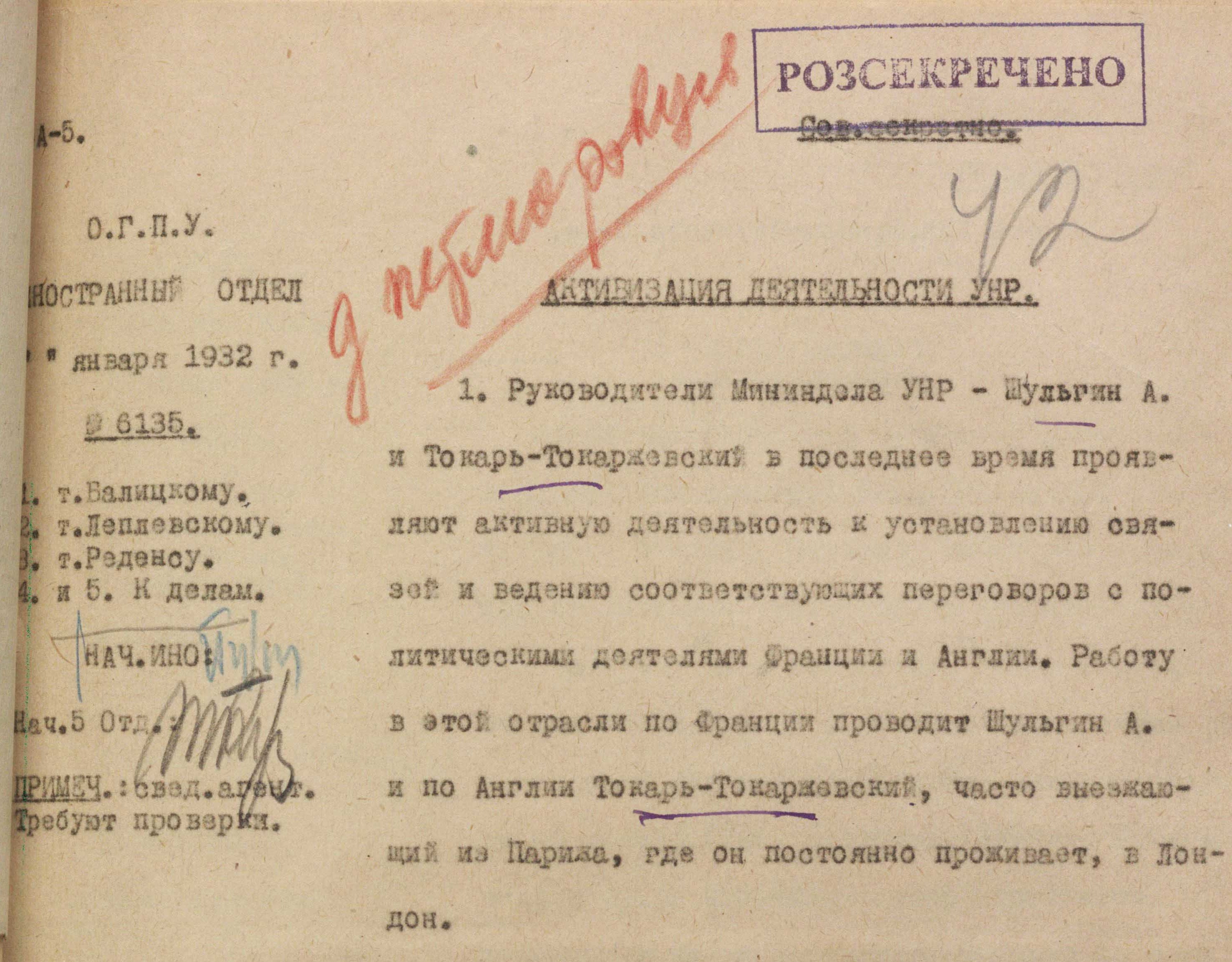 The ogpu of the ussr’s document dated January 1932, entitled “Activation of the UPR's Activities”, states that O. Shulhyn, together with I. Tokarzhevskyi-Karashevych, became more active in establishing contacts with representatives of leading European countries in the issue of providing assistance to the Ukrainian liberation movement. I. Tokarzhevskyi-Karashevych, in particular, directed his efforts to England.