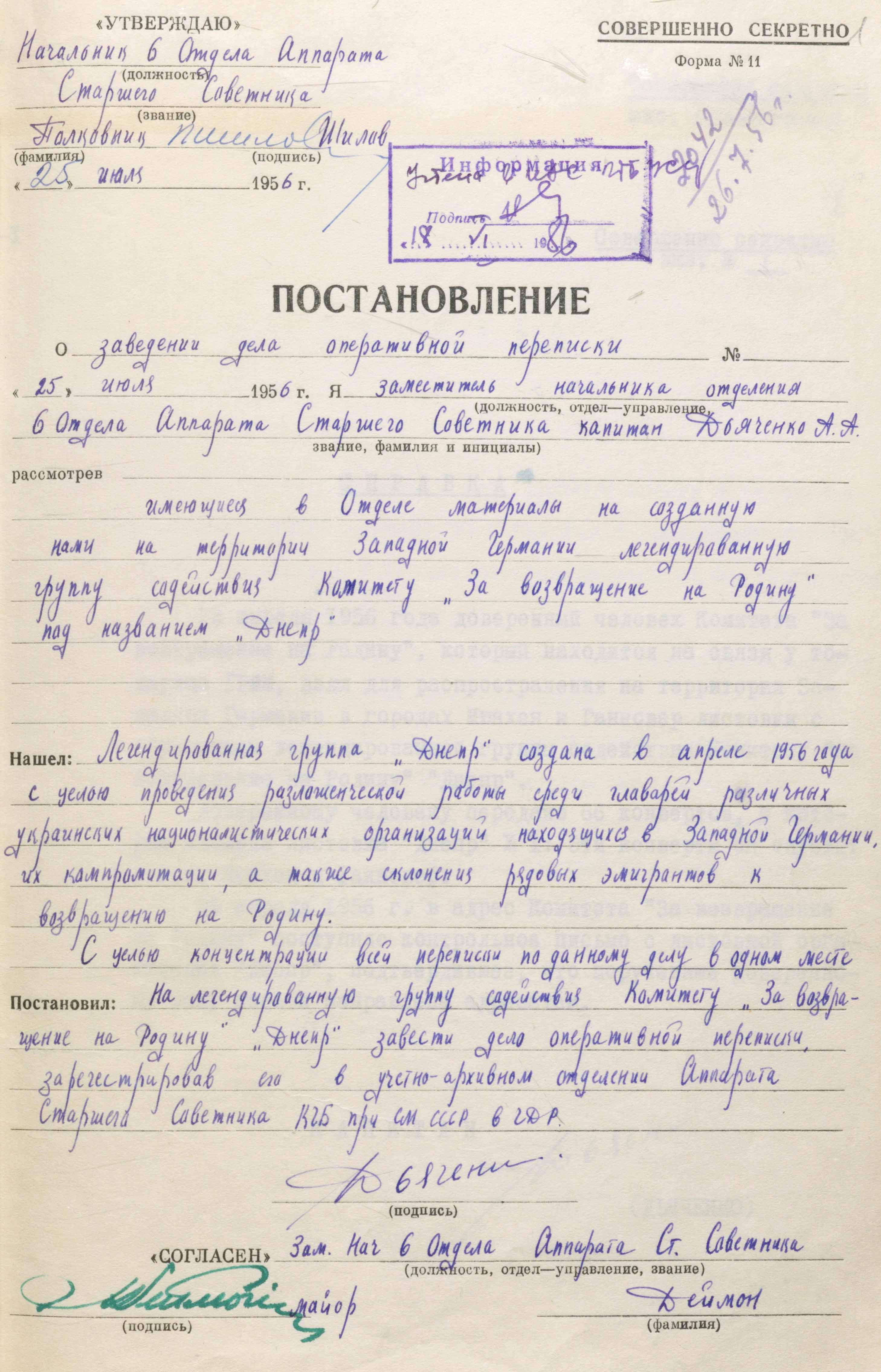 The idea of creating a fictitious group of Ukrainian emigrants called “Dnipro” was born in the 6th department of the apparatus. In the resolution to open the case, it appears as a legendary group assisting the committee “For the Return to the Motherland”. It was a soviet propaganda structure created in the early 1950s to work with emigrants, first of all political ones. The committee formally positioned itself as a public organization, but in fact it was an instrument of special services and operated under the full control of the mgb/kgb. Its main activity was to persuade former forced laborers, prisoners of war, and political refugees, including members of anti-soviet organizations, to return to the ussr, as well as to work against those organizations.