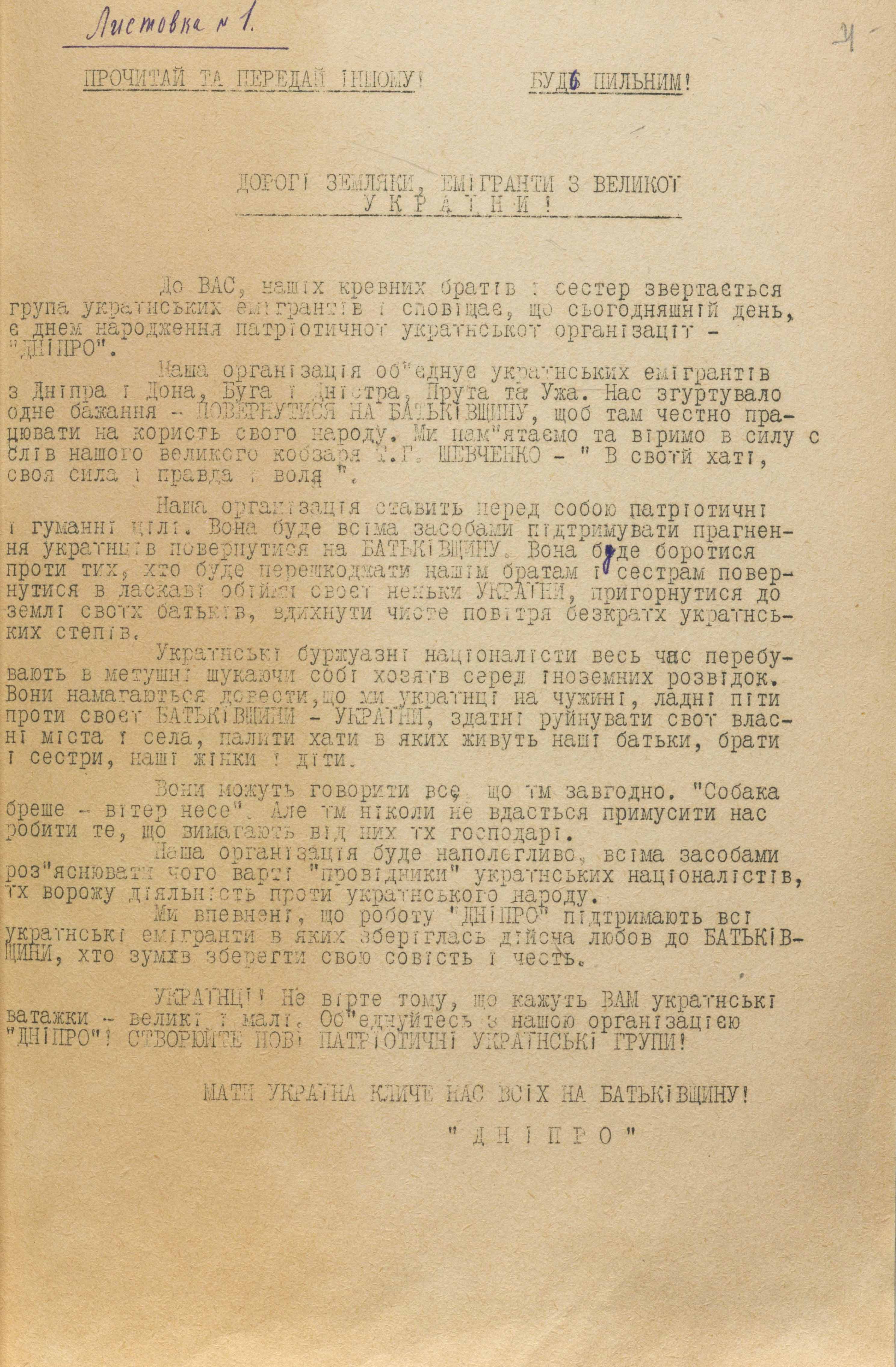 A group of Ukrainian emigrants is addressing you, our blood brothers and sisters, to announce that today is the day of birth of the patriotic Ukrainian organization “Dnipro”.