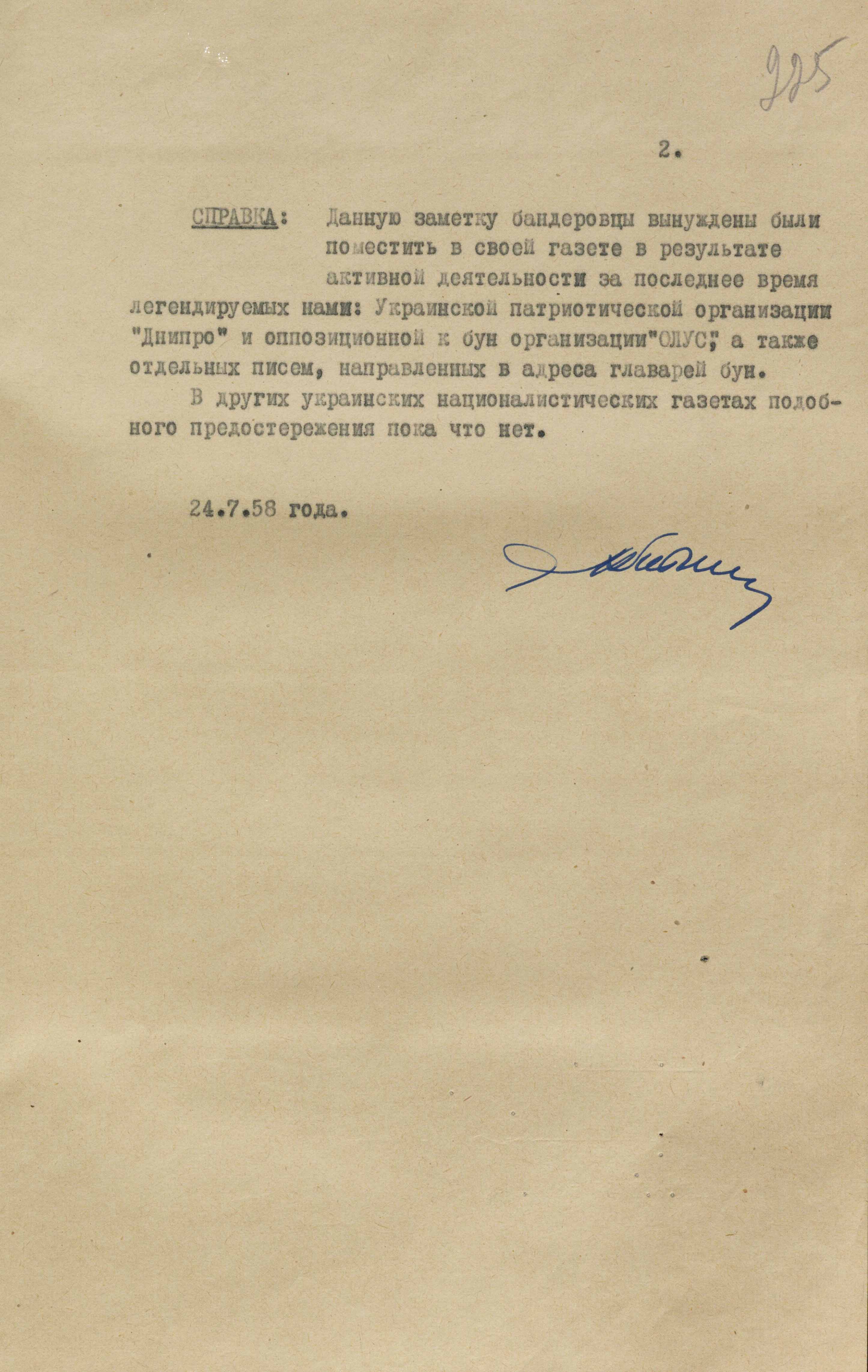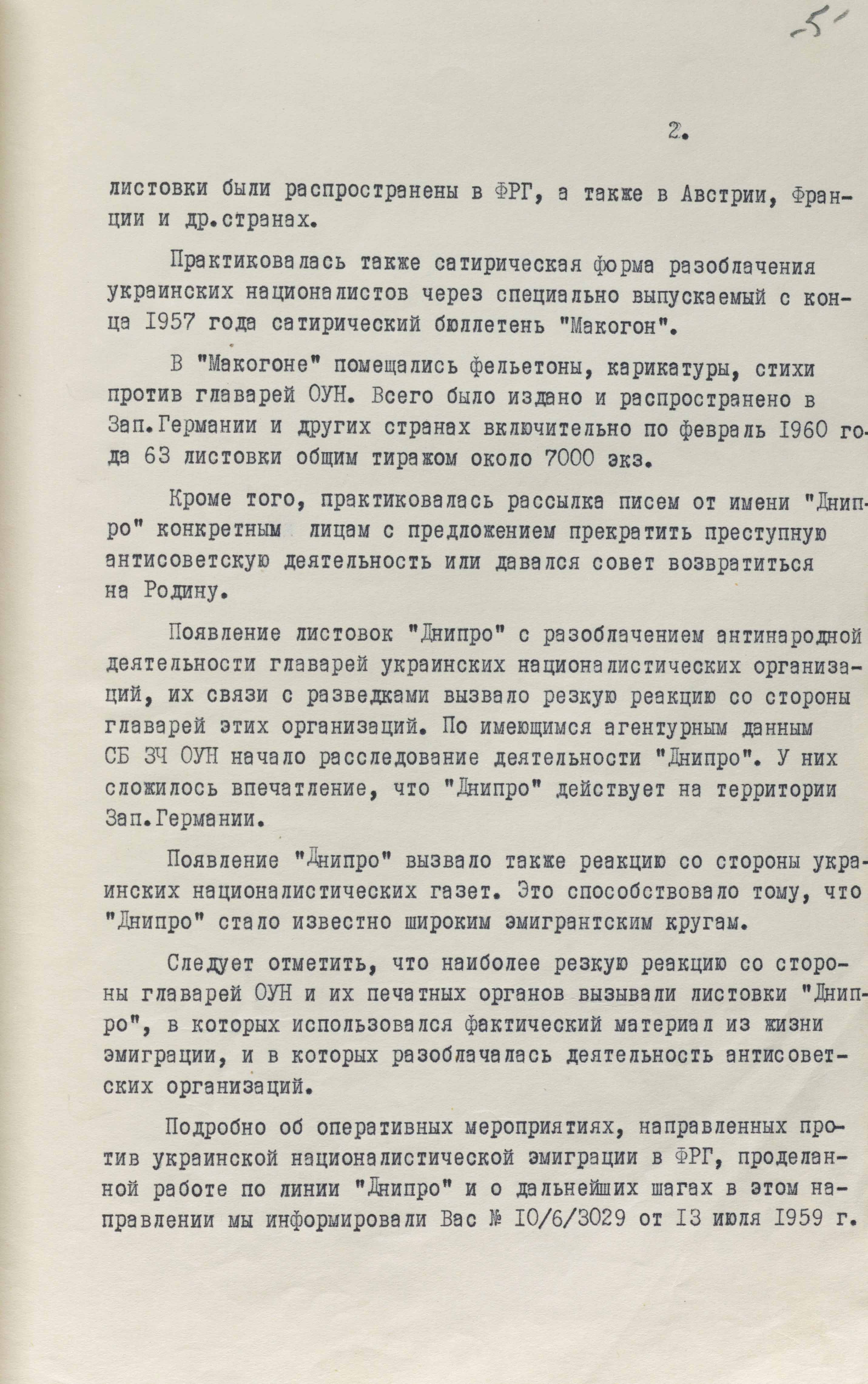 According to archive documents, within 6 years, about 60 leaflets were prepared on behalf of the “Dnipro” group, along with a bunch of different bulletins. In December 1962, the kgb issued a resolution stating: “In connection with the change in the operational situation in the FRG, the continued existence of the legendary organization “Dnipro” is considered inappropriate, and a decision has been made to continue working to undermine emigration by other means.” (FISU – F. 1. – Case 10901. – Vol. 2. – P.114).