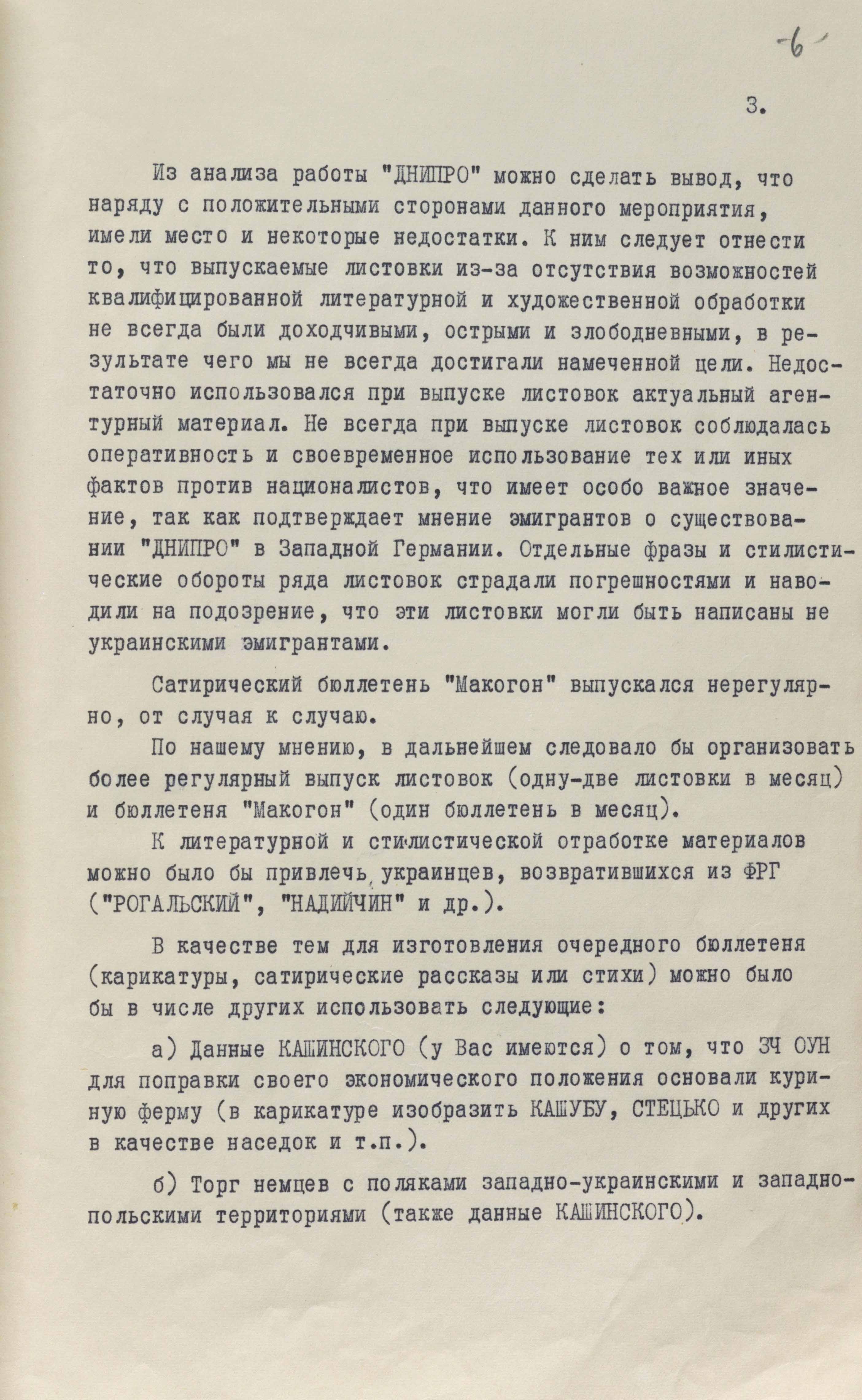 Similar letters were sent to other emigrants. However, the main emphasis was still placed on leaflets. During the first eight months, 13 leaflets with a total circulation of 1,000 copies were manufactured and distributed in West Germany. They described the allegedly difficult life of Ukrainian emigrants abroad, unemployment, and the lack of prospects for further stay there, and portrayed the role of the leaders of the OUN, UPRP, UNRada, and other organizations in a negative light. All this was presented in such a way as to turn some against others, arouse mutual suspicion, cause discord, and sow enmity.