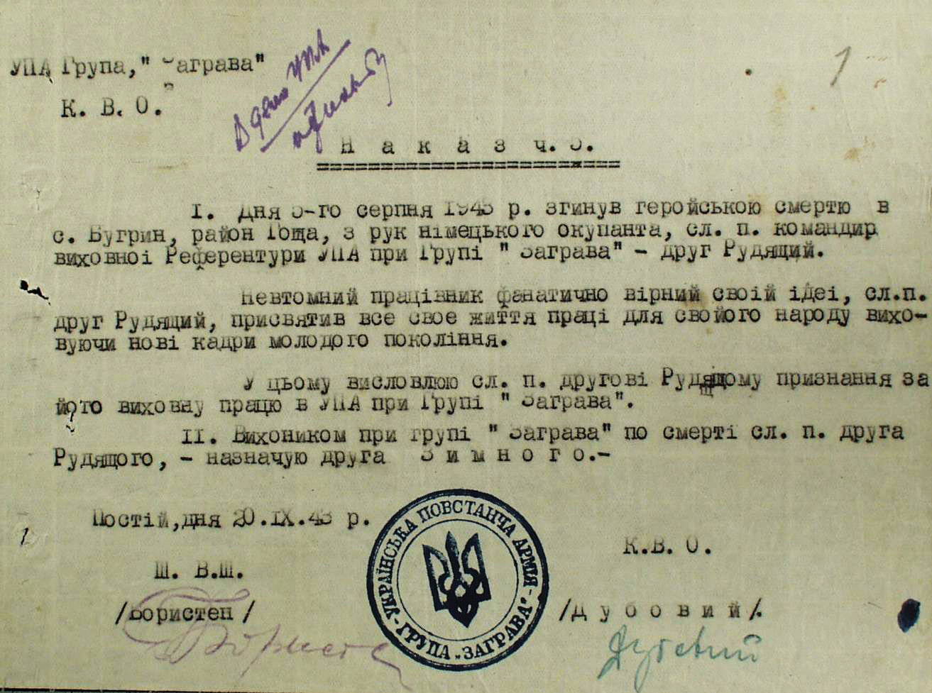 У цьому висловлюю сл. п. другові Рудящому признання за його виховну працю в УПА при Групі «Заграва».