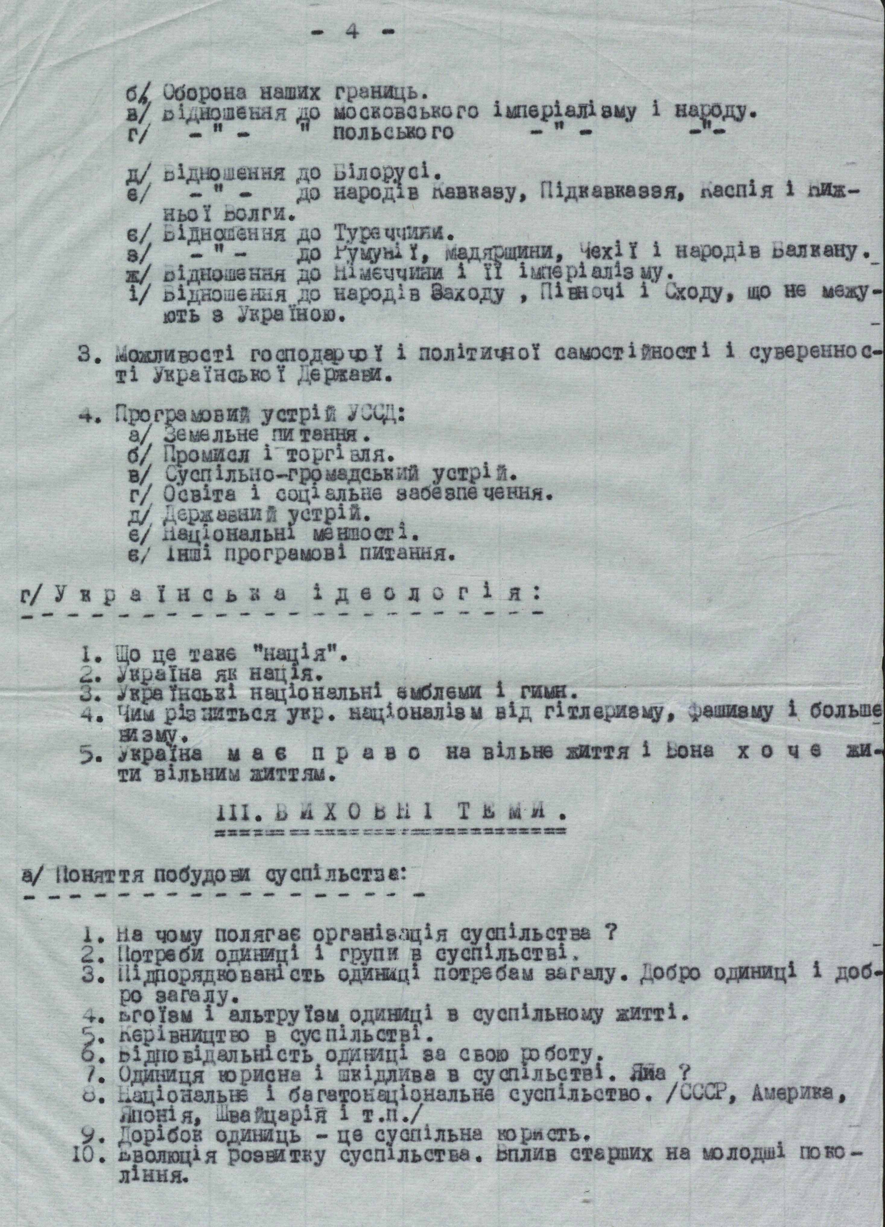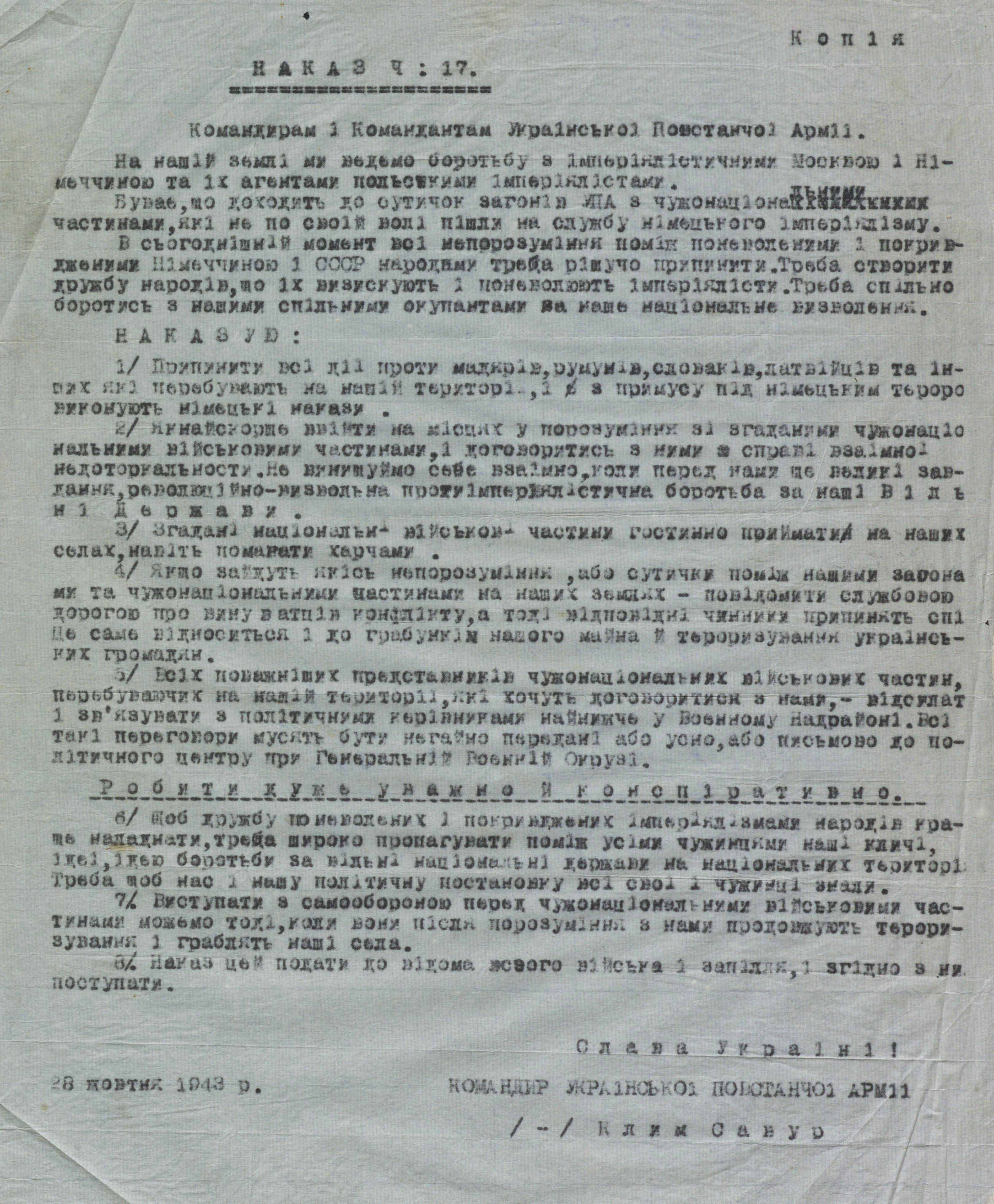 Що стосується останнього гасла – для політвиховників були особливі настанови. Серед документів з архіву «Зимного» є наказ Ч. 17 від 28 жовтня 1943 року, підписаний командиром УПА Климом Савуром (одне із псевд Дмитра Клячківського). У ньому йдеться про ставлення до чужонаціональних військових формувань. «Буває, що доходить до сутичок загонів УПА з чужонаціональними частинами, – йдеться в ньому, – які не по своїй волі пішли на службу німецькому імперіалізму. В сьогоднішній момент усі непорозуміння поміж поневоленими і покривдженими Німеччиною і срср народами треба рішуче припинити. Треба створити дружбу народів, що їх визискують і поневолюють імперіалісти. Треба спільно боротися з нашими спільними окупантами за наше національне визволення».