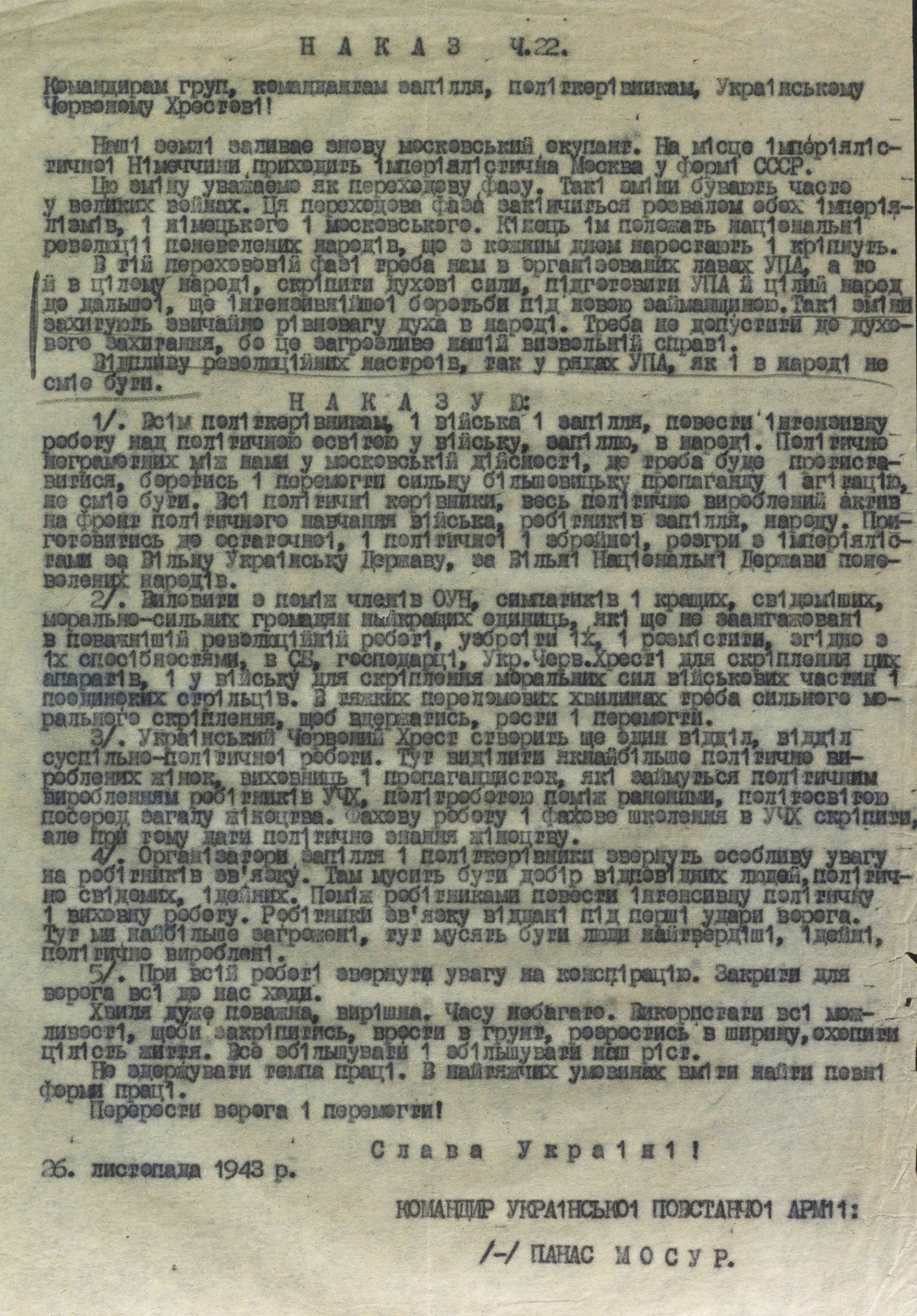 Визначальним і мотиваційним є наказ Ч. 22 від 26 листопада 1943 року, підписаний командиром УПА Панасом Мосуром (одне із псевд Дмитра Клячківського), і адресований командирам груп, командирам запілля, політкерівникам, Українському Червоному Хрестові. У ньому йдеться про зміни ситуації на фронті, про те, що на українські землі знову повертається нога московського окупанта – «на місце імперіалістичної Німеччини приходить імперіалістична москва у формі срср». Відтак доведеться боротися і проти одних, і проти інших. У нових умовах «треба нам в організованих лавах УПА, а то й в цілому народові скріпити духовні сили, підготувати УПА й цілий народ до дальшої, ще інтенсивнішої боротьби під новою займанщиною. Такі зміни захитують звичайно рівновагу духа в народі. Треба не допустити до духовного захитання, бо це загрозливо нашій визвольній справі».