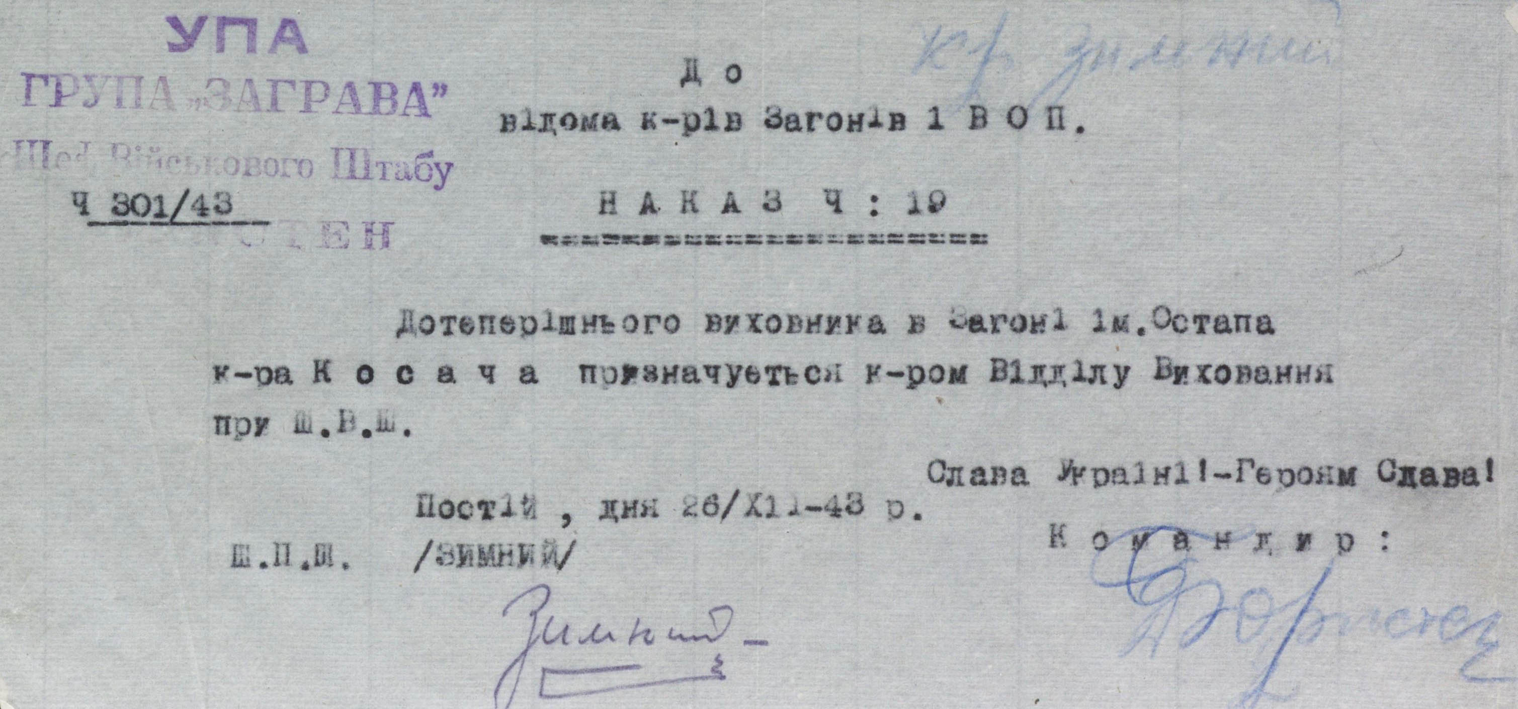 Постій, дня 20. ІХ. 43 р.