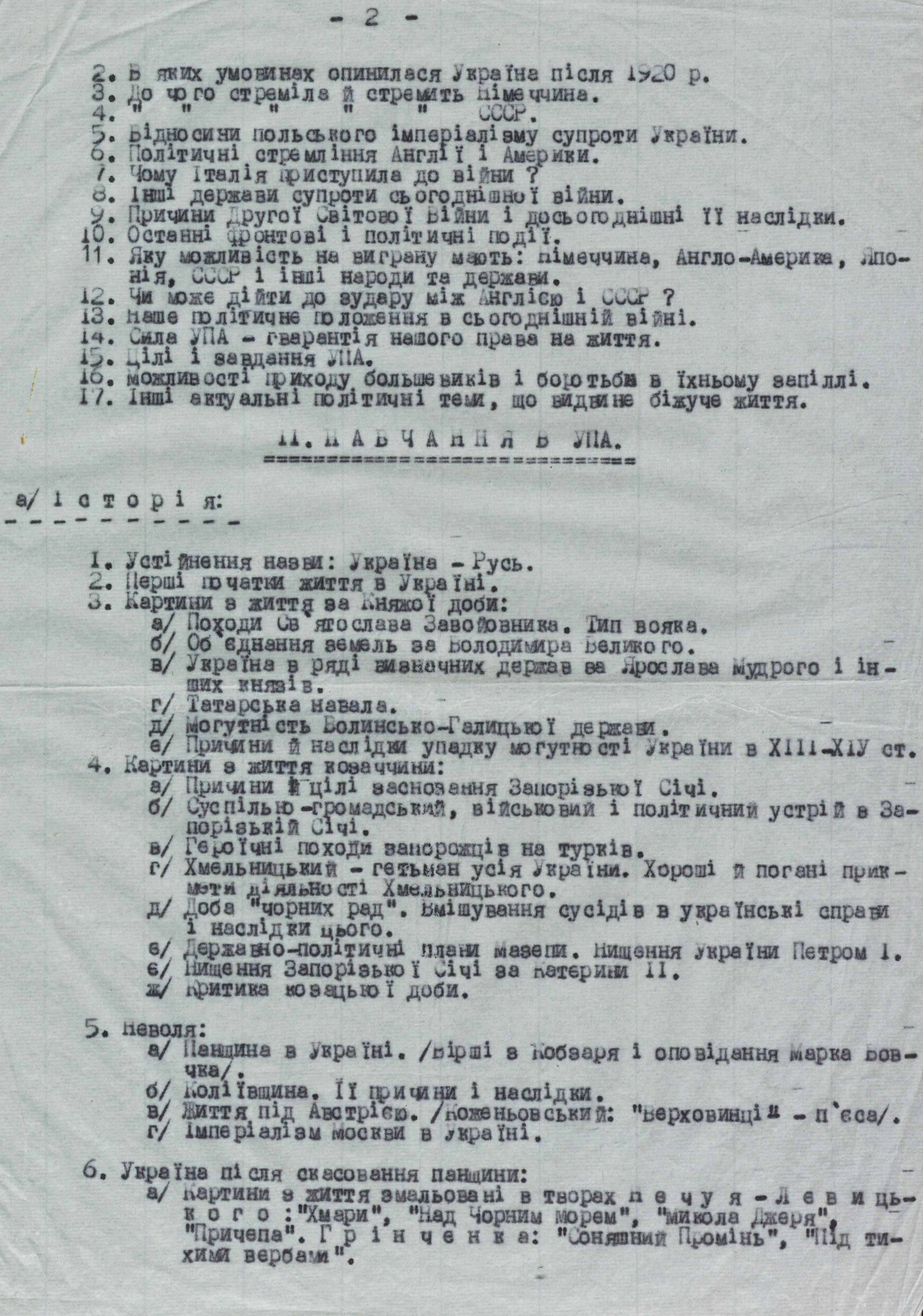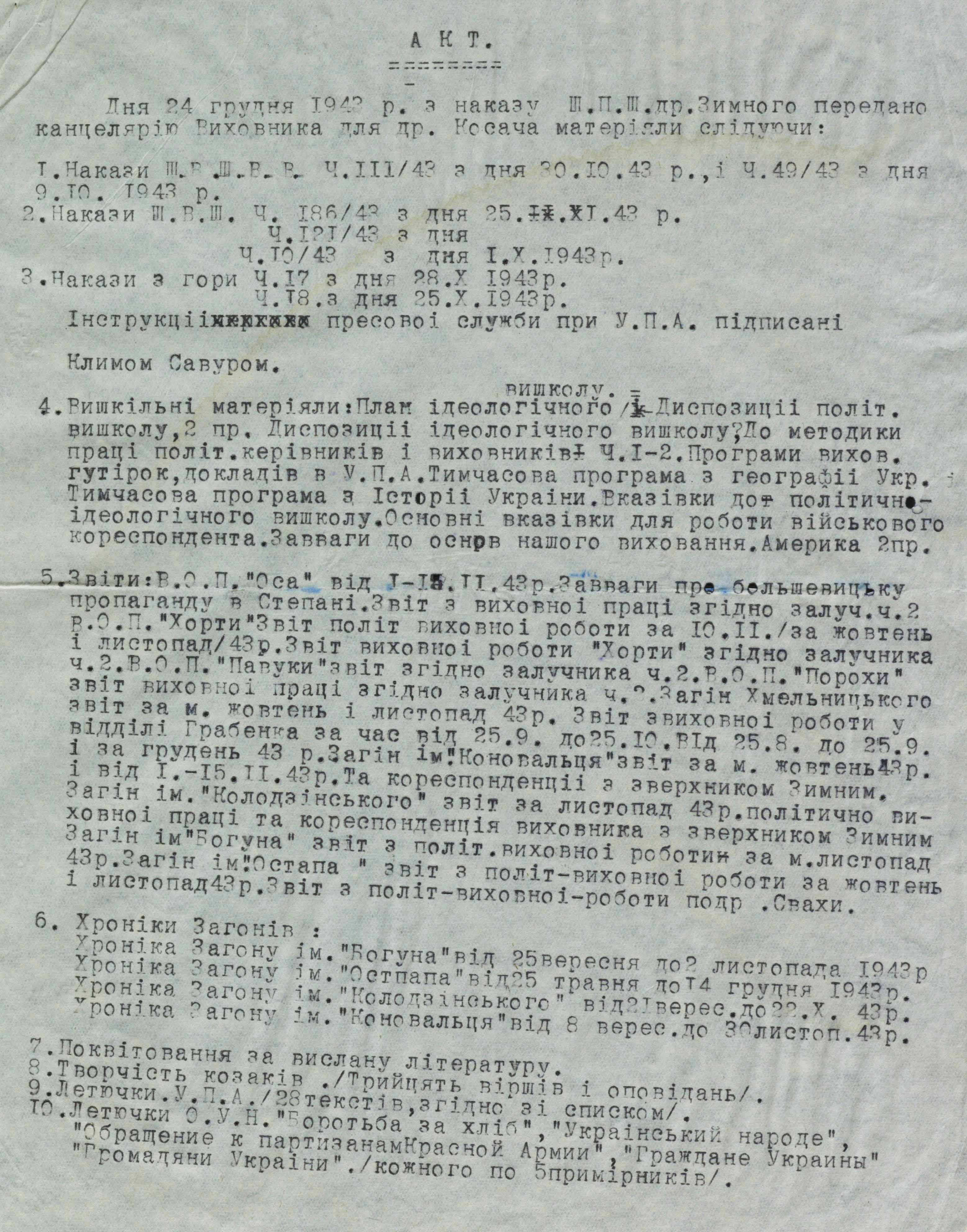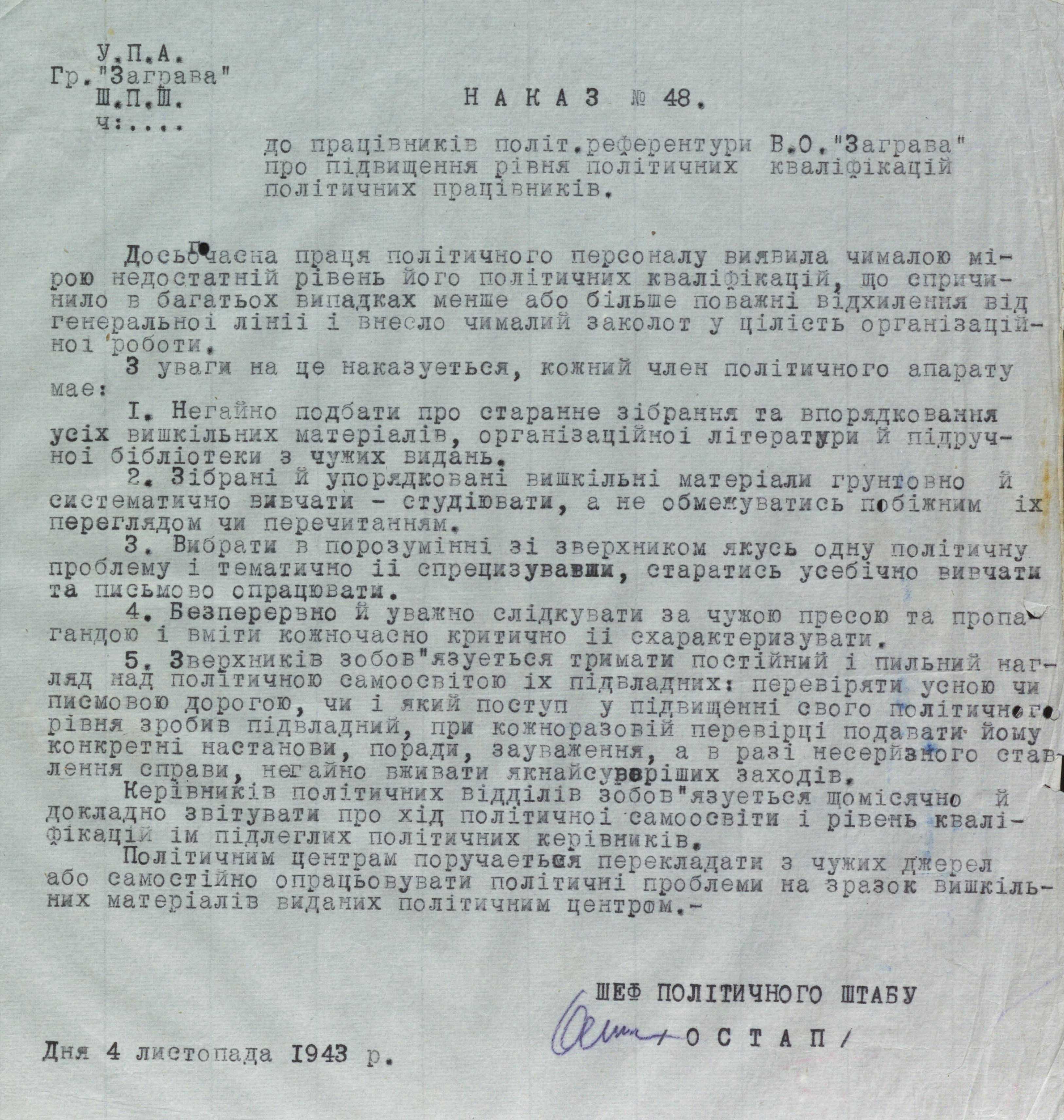 Більшість матеріалів датована другою половиною 1943 року. У них – методичні рекомендації з проведення політико-виховної роботи, інструкції, накази, конспекти, листівки і власноруч зроблені нотатки. Один із перших наказів зобов’язує політвиховників УПА сконтактуватися з політичними референтами ОУН на тих теренах, де перебуває військо, і спільно вести роботу. Тобто обговорювати назрілі питання, проводити різні заходи для населення, зокрема до свят, обмінюватися літературою.