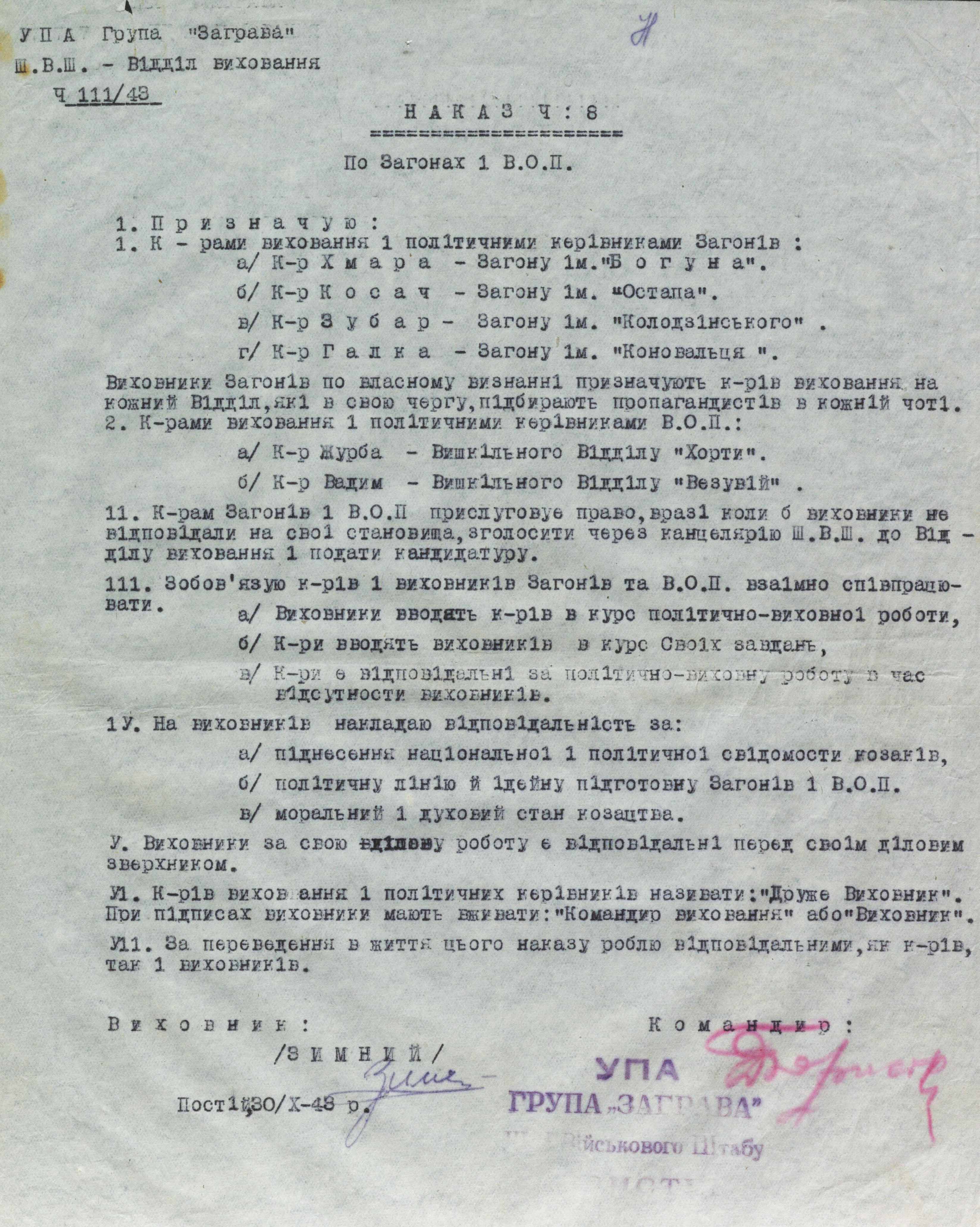 Серед повстанців культивувалося шанобливе ставлення до політвиховників. Рекомендувалося вживати звернення: «Друже виховник». При підписах документів – «Командир виховання» або «Виховник». Одним із таких наказів за підписами «Виховник «Зимний» і «ШВШ «Бористен» було призначено командирів виховання і політичних керівників загонів Військової округи «Заграва».