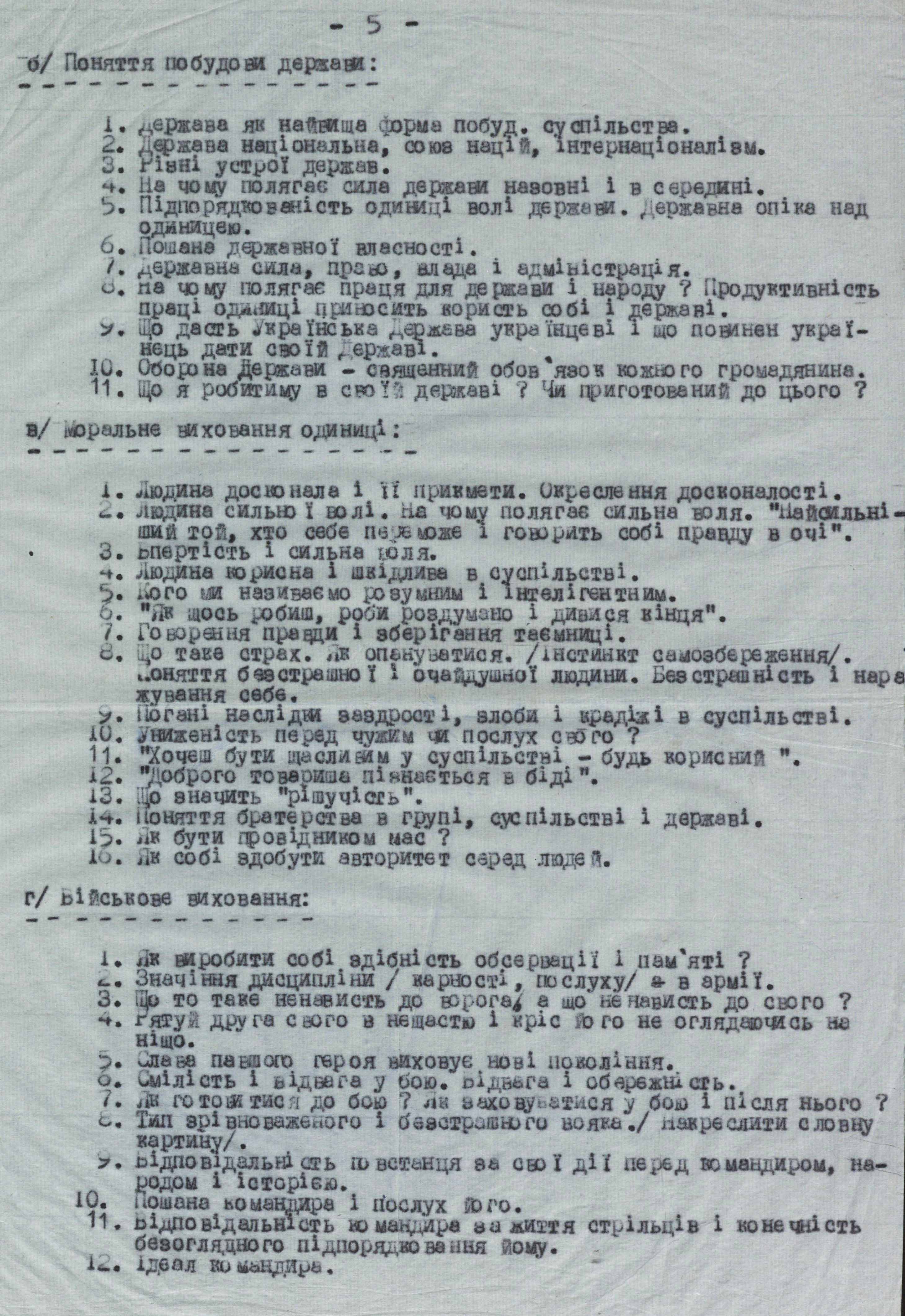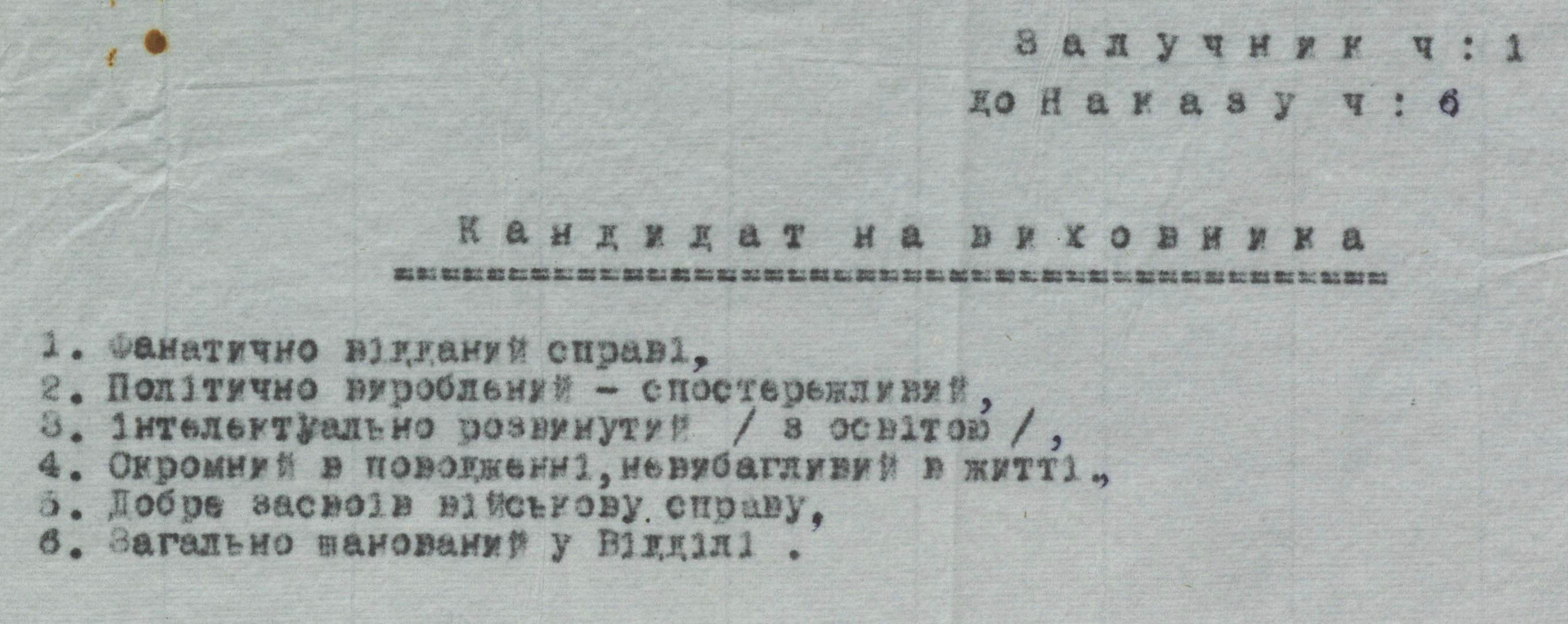В іншому документі зобов’язували прислати на навчання до підстаршинської школи всіх виховників. Зазначалося, що всі відділи обов’язково отримають підготовлених виховників військовиків. А якщо таких у підрозділі ще не було, пропонувалося відібрати кандидатів на цю роботу. Водночас зауважували, що ці особи повинні мати такі риси: бути фанатично відданими справі, політично виробленими і спостережливими, інтелектуально розвинутими (з освітою), скромними у поводженні і невибагливими в житті, добре розбиралися у військовій справі, були загальношанованими у підрозділі.