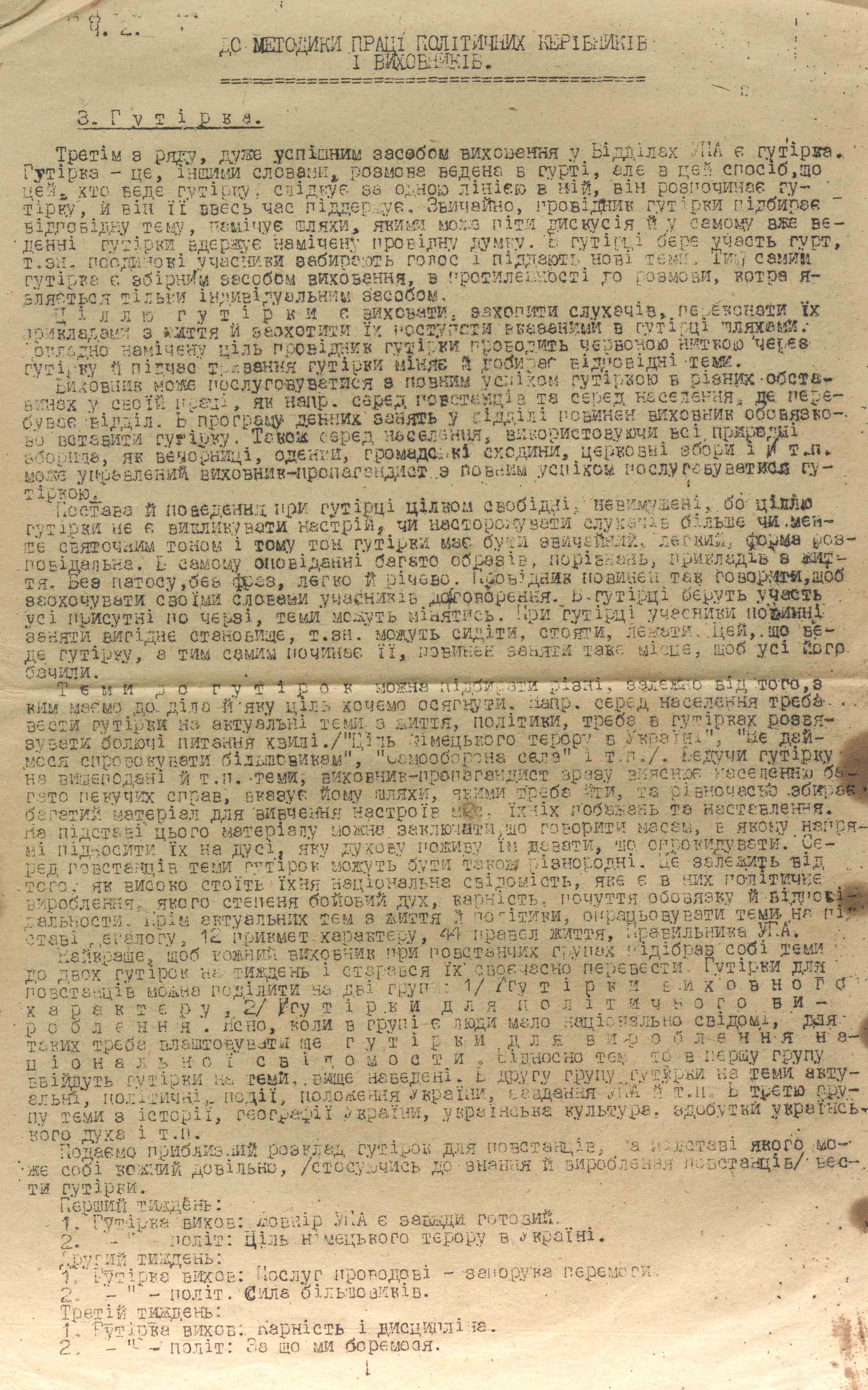 Активне обговорення певних тем, за якого в розмові брав участь не лише політвиховник, а усі слухачі, в матеріалах називалося гутіркою. Це вважалося дієвою формою політико-виховної роботи, оскільки одразу ставало зрозуміло, хто і як розбирається у конкретній темі. Серед тем, які рекомендувалося виносити на гутірки, такі: «Мета німецького терору в Україні», «Причини Другої світової війни і її сьогоднішні наслідки», «Що дасть Українська Держава українцеві і що повинен дати українець Державі», «За що ми боремося?», «Чим різниться український націоналізм від гітлеризму, фашизму і більшовизму», «Пропадь, а не зрадь!», «Свобода народам – свобода людині!» та інші.