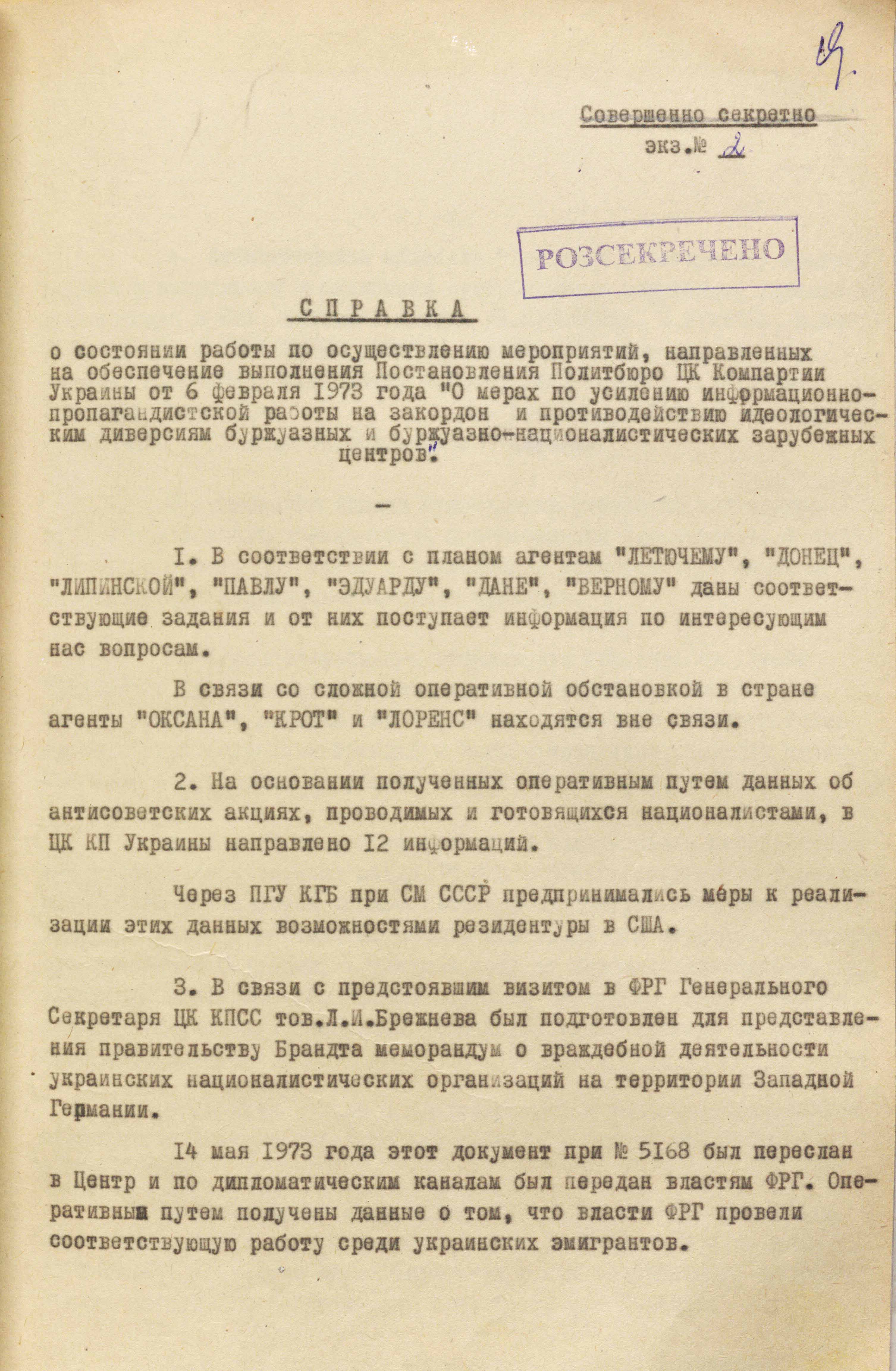 У лютому 1973 року на засіданні політбюро цк компартії України прийняли постанову «Про заходи щодо посилення інформаційно-пропагандистської роботи за кордоном і протидії ідеологічним диверсіям буржуазних і буржуазно-націоналістичних закордонних центрів». Окремими пунктами цієї постанови прописувалася «компрометація антирадянського зібрання – 2-го СКВУ і локалізація запланованих у зв’язку з цим ворожих акцій». На виконання цієї постанови в кдб урср розробили план спеціальних заходів.