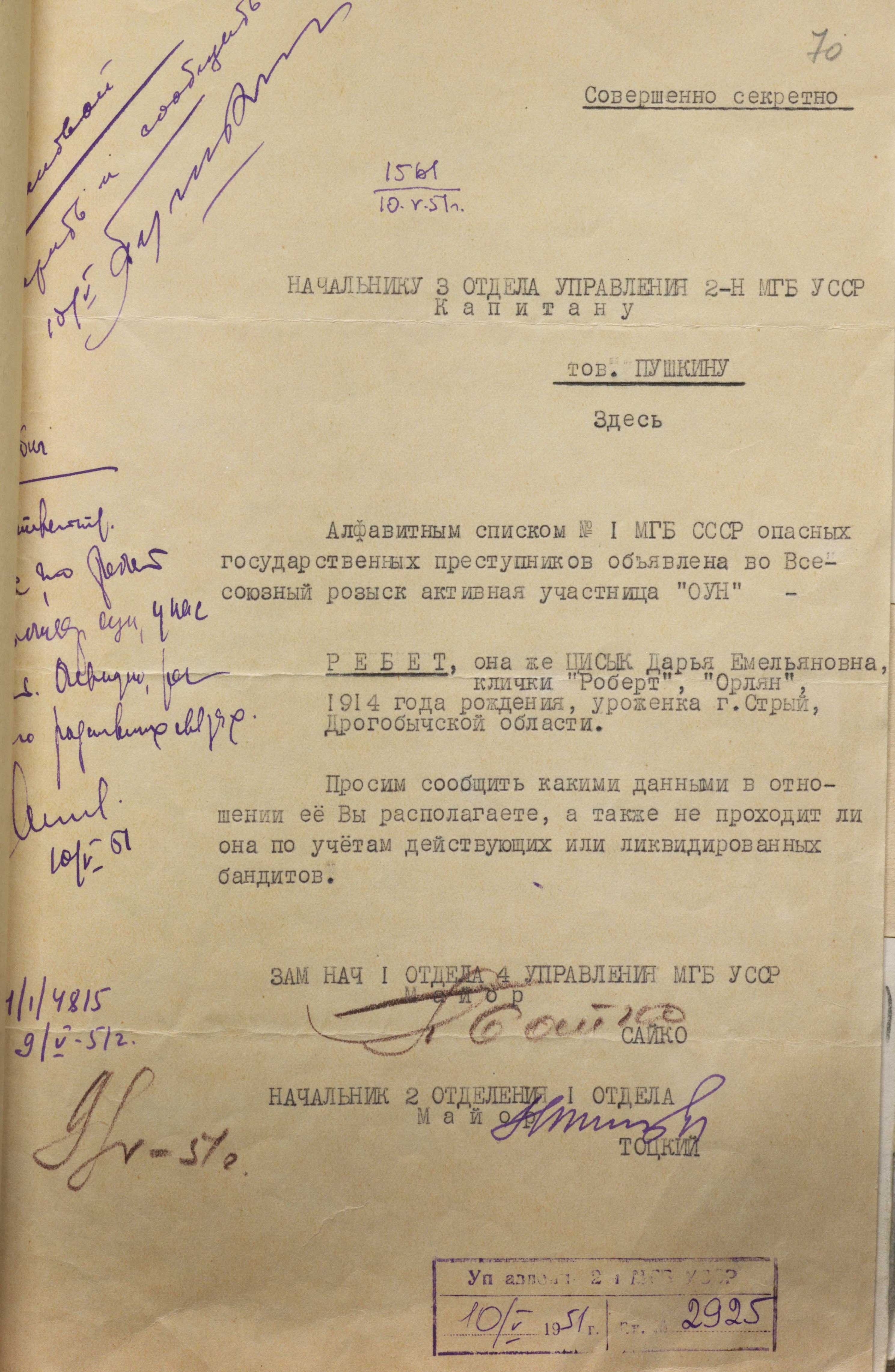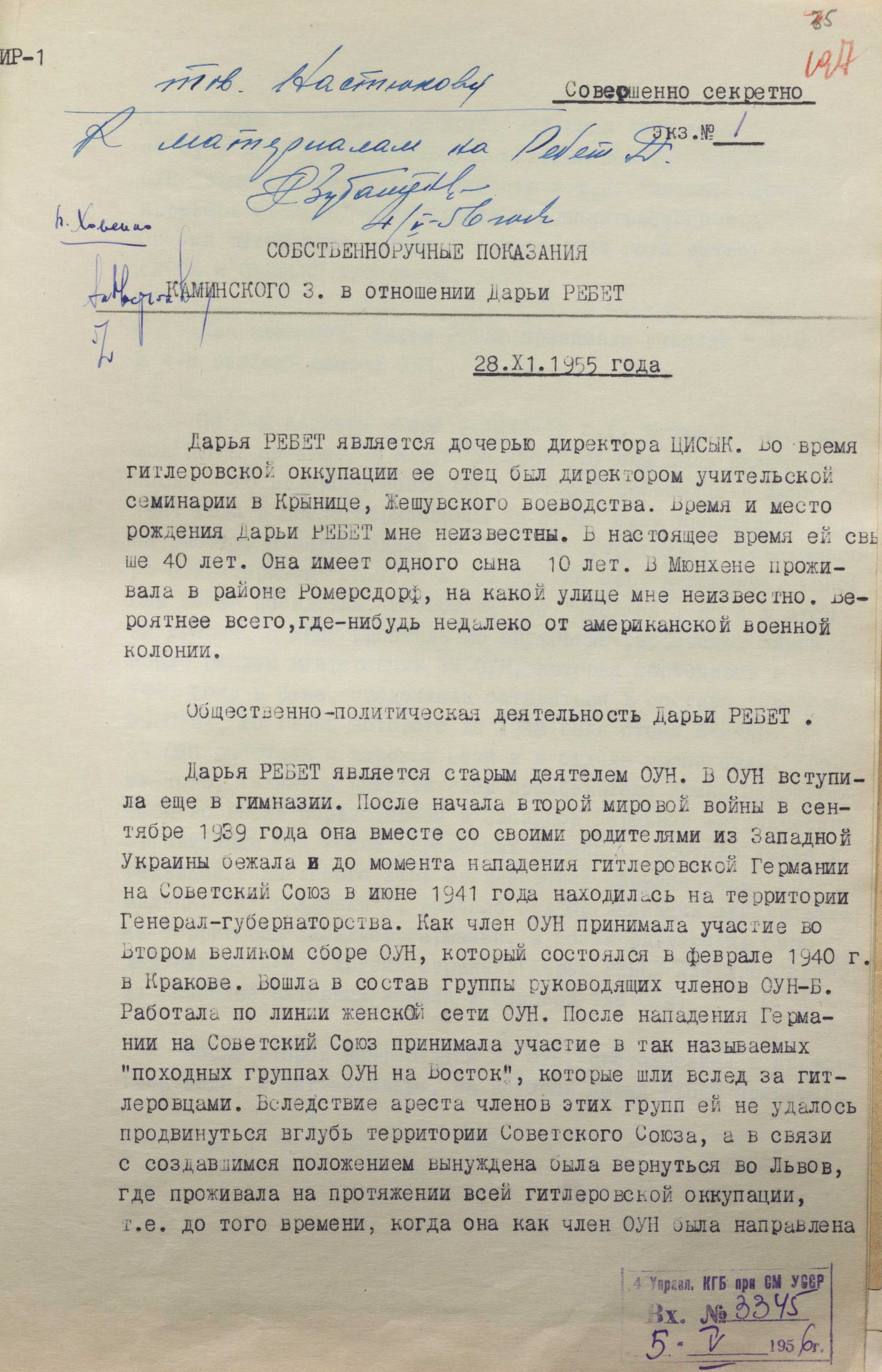 «Із розповідей членів ОУН-бандерівців і особисто Бандери Степана мені відомо, що Ребет Дарія має великий авторитет у лідерів оунівського підпілля в Україні і, зокрема, у Шухевича Романа.