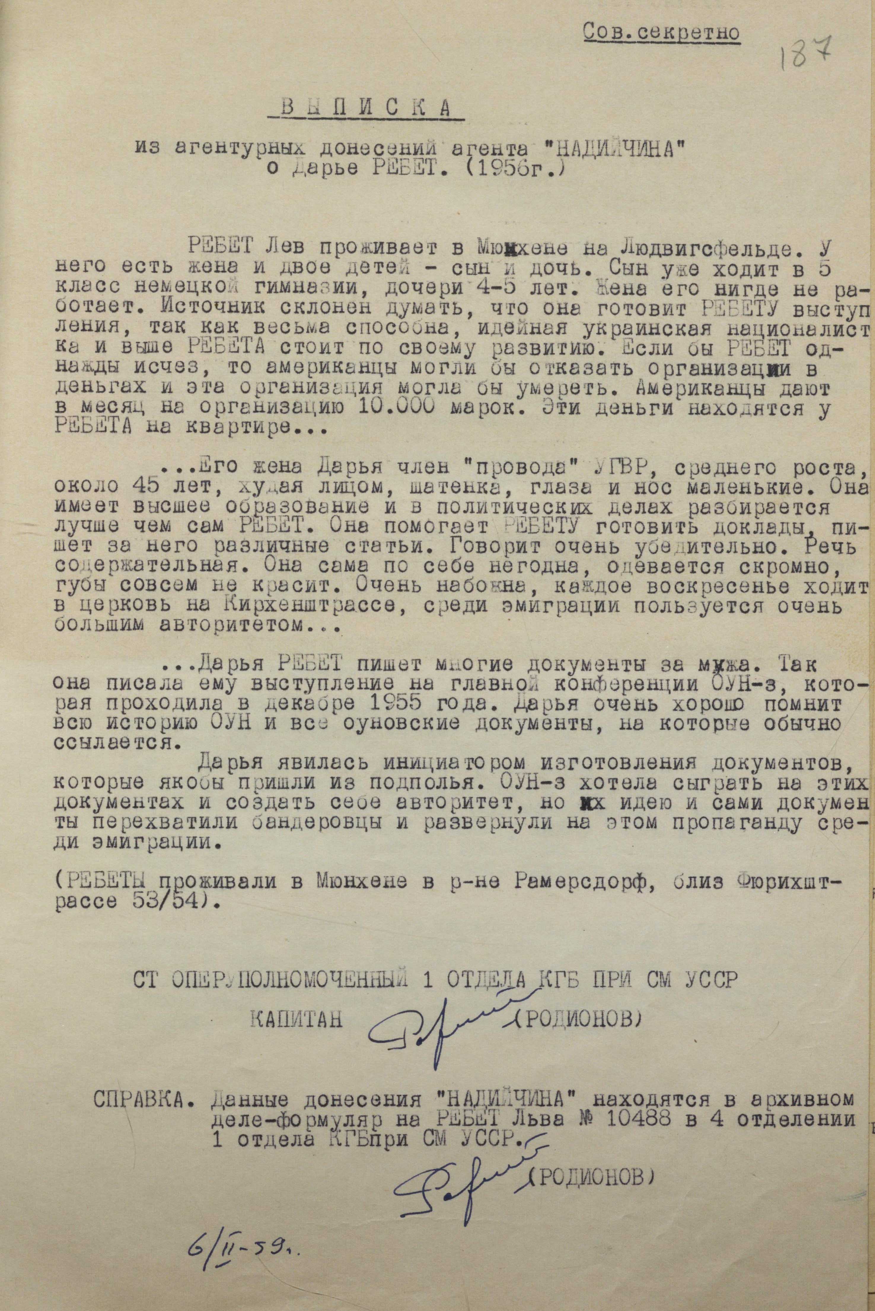 В іншому документі, який надійшов у резидентуру мдб срср у Відні в березні 1947 року, йшлося про таке: «Надаючи надзвичайно важливого значення арешту Ребет Д. та її чоловіка, тов. Погрібний просить особисто “Юрія” вжити всіх можливих заходів для їх встановлення і подальшого арешту. Є підстави передбачати, що вони мешкають під вигаданими прізвищами. Для їх встановлення й арешту слід продумати комбінацію з сином. Додатково повідомляємо, що у вихідні з 9 до 12 години їх можна зустріти в костелі Альзеркірхе» (ГДА СЗР України. – Ф. 1. – Спр. 13089. – Арк. 17).