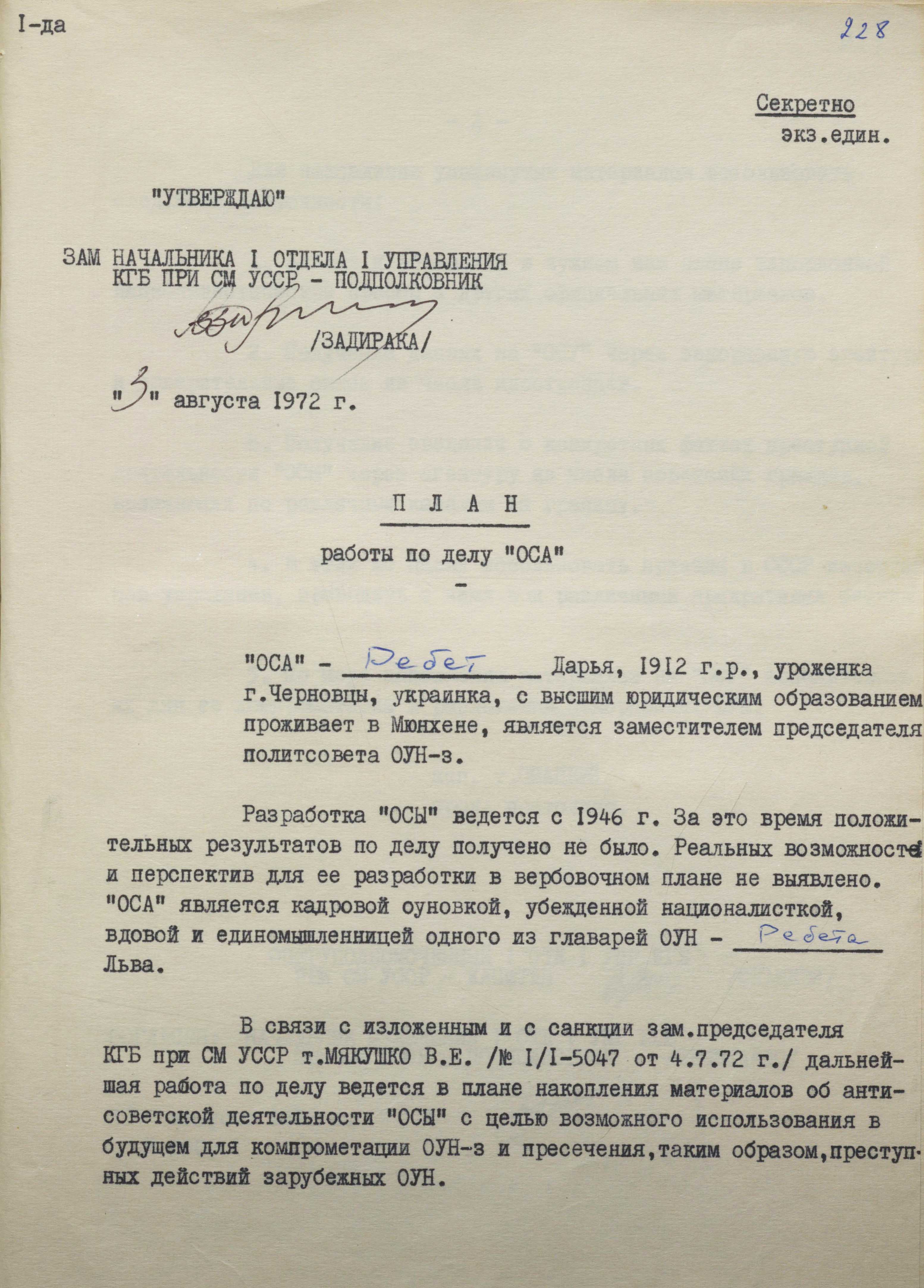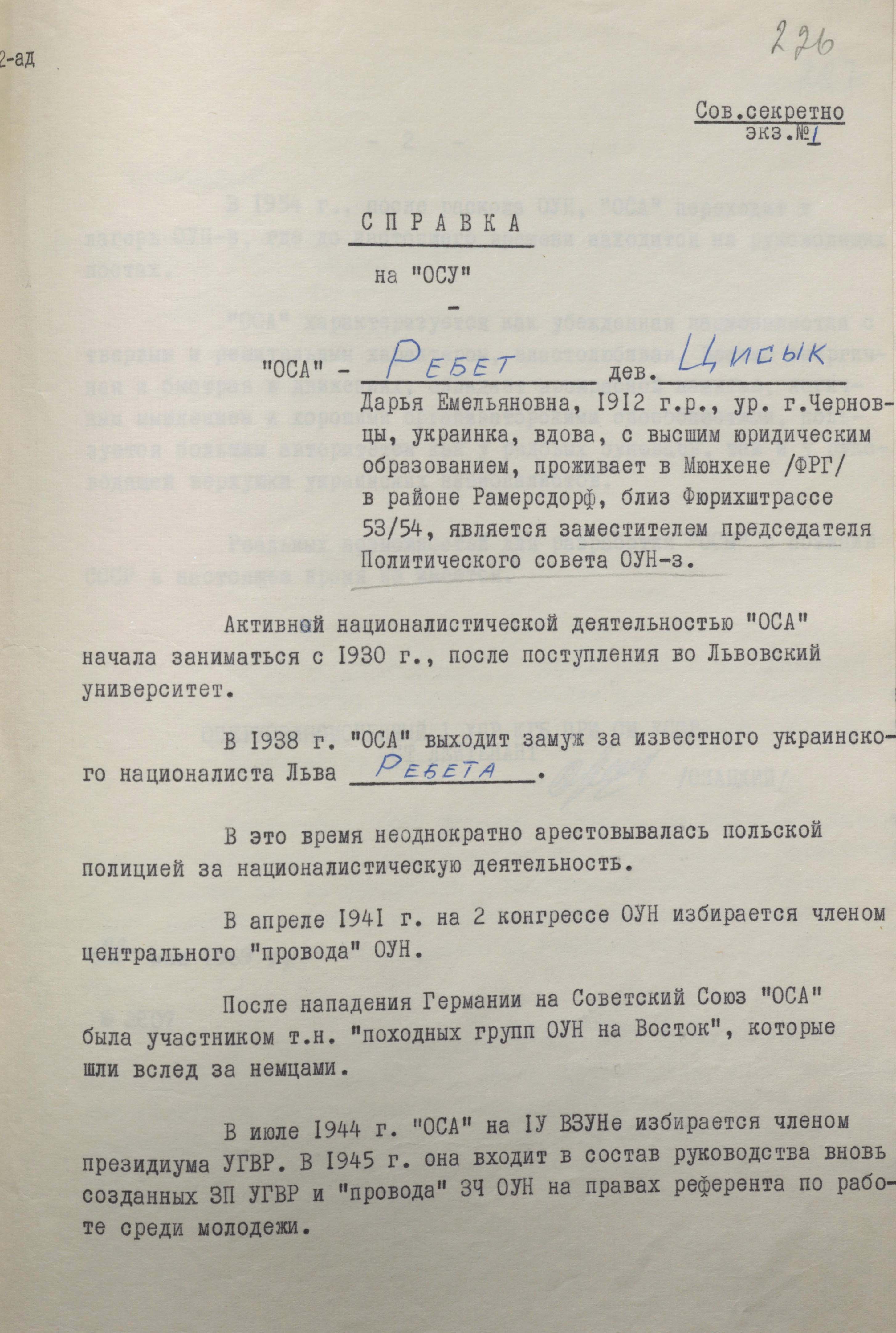 «”Оса” характеризується як переконана націоналістка з твердим і рішучим характером, владолюбна. Доволі енергійна і швидка в рухах, має чудову пам’ять, логічне мислення і хороші організаторські здібності, великий авторитет і серед рядових оунівців, і керівної верхівки українських націоналістів» (ГДА СЗР України. – Ф. 1. – Спр. 13089. – Арк. 227).