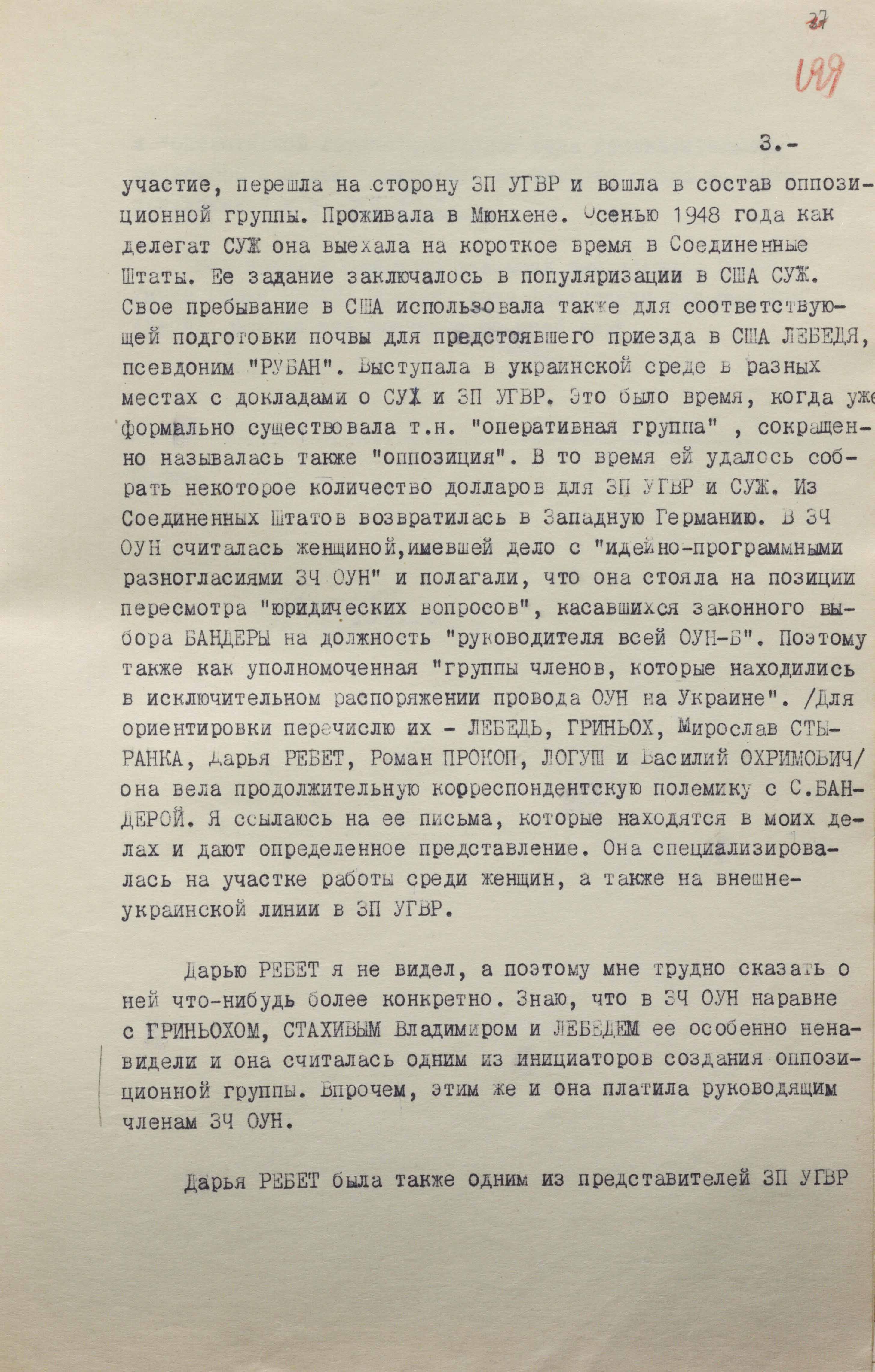 Про це в матеріалах справи зазначається таке: «У період перебування Бандери, Стецька, Ребета Л. та інших лідерів ОУН в ув’язненні (середина 1941 – листопад 1944 р.) Ребет Дарія спільно з Лебедем М., а потім Шухевичем Р. керувала антирадянською діяльністю центрального “проводу” ОУН і була одним із організаторів УГВР… За рішенням президії УГВР серед інших лідерів ОУН-УГВР виїздить до Братислави, а потім до Відня, одержавши від Шухевича Р. повноваження керувати всією організаційною роботою ОУН за кордоном» (ГДА СЗР України. – Ф. 1. – Спр. 13089. – Арк. 221).