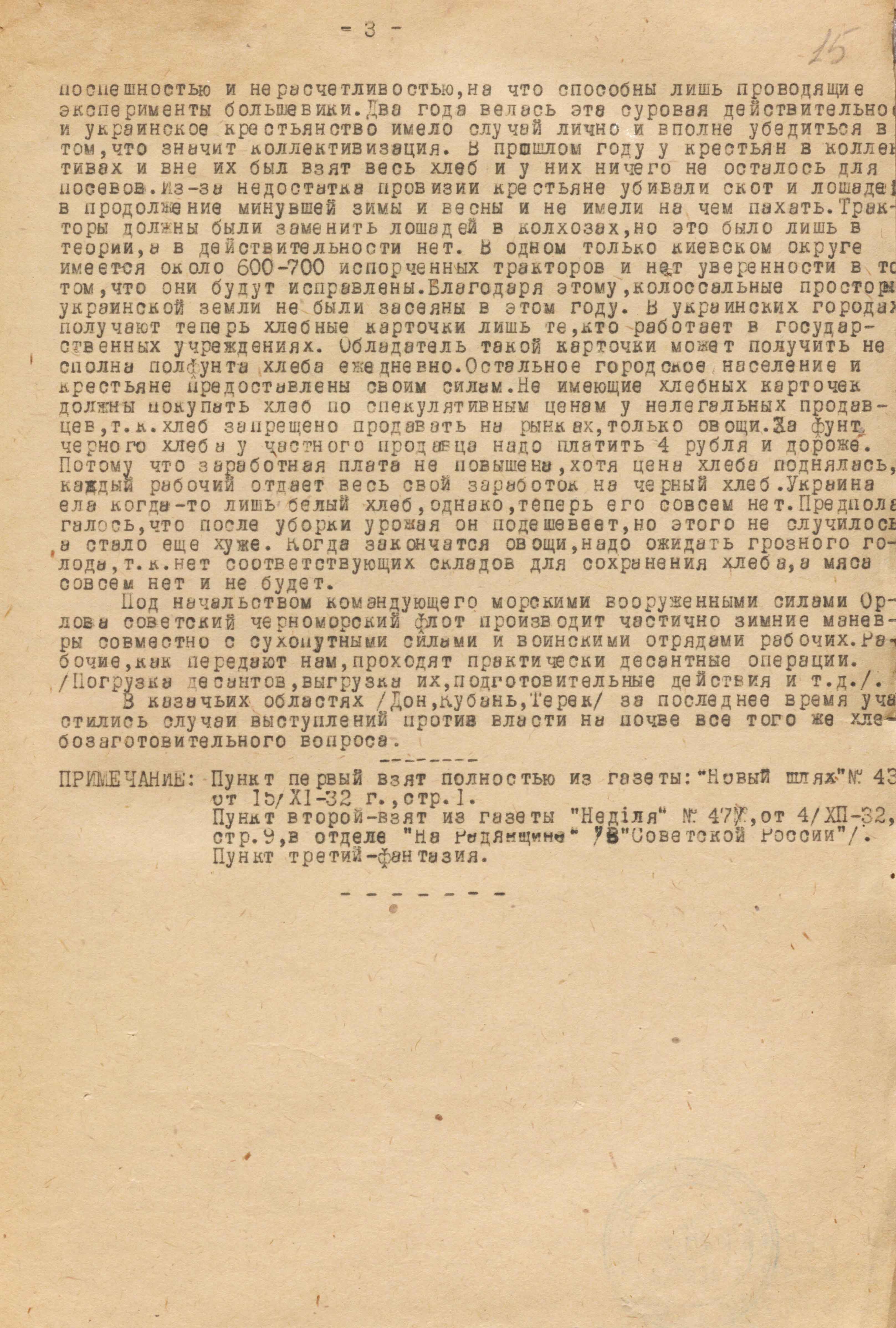 Із України повідомляють, що міське і сільське населення України відчуває дедалі більшу й більшу нестачу хліба. Люди віддають меблі та інші домашні речі, одяг і т. п. за чорний хліб. Водночас хліб дістати дуже важко навіть за найвищу ціну. Україна більше, ніж будь-який край в срср платить за надто поспішну колективізацію. Українських селян, зрозуміло, що проти їхньої волі, втягнули в колективи з такою поспішністю і нерозбірливістю, на що здатні лише більшовики, які проводять експерименти. Два роки тривала ця сувора дійсність, і українське селянство мало нагоду особисто переконатися в тому, що означає колективізація. У минулому році у селян в колективах було забрано увесь хліб і в них нічого не залишилося для посіву. Через нестачу провізії селяни різали худобу і коней упродовж минулої зими й весни і не мали на чому орати. Трактори мали замінити коней у колгоспах, але то було лише в теорії, а в дійсності не так. В одній лише київській окрузі є близько 600–700 поламаних тракторів і немає впевненості в тому, що їх полагодять…