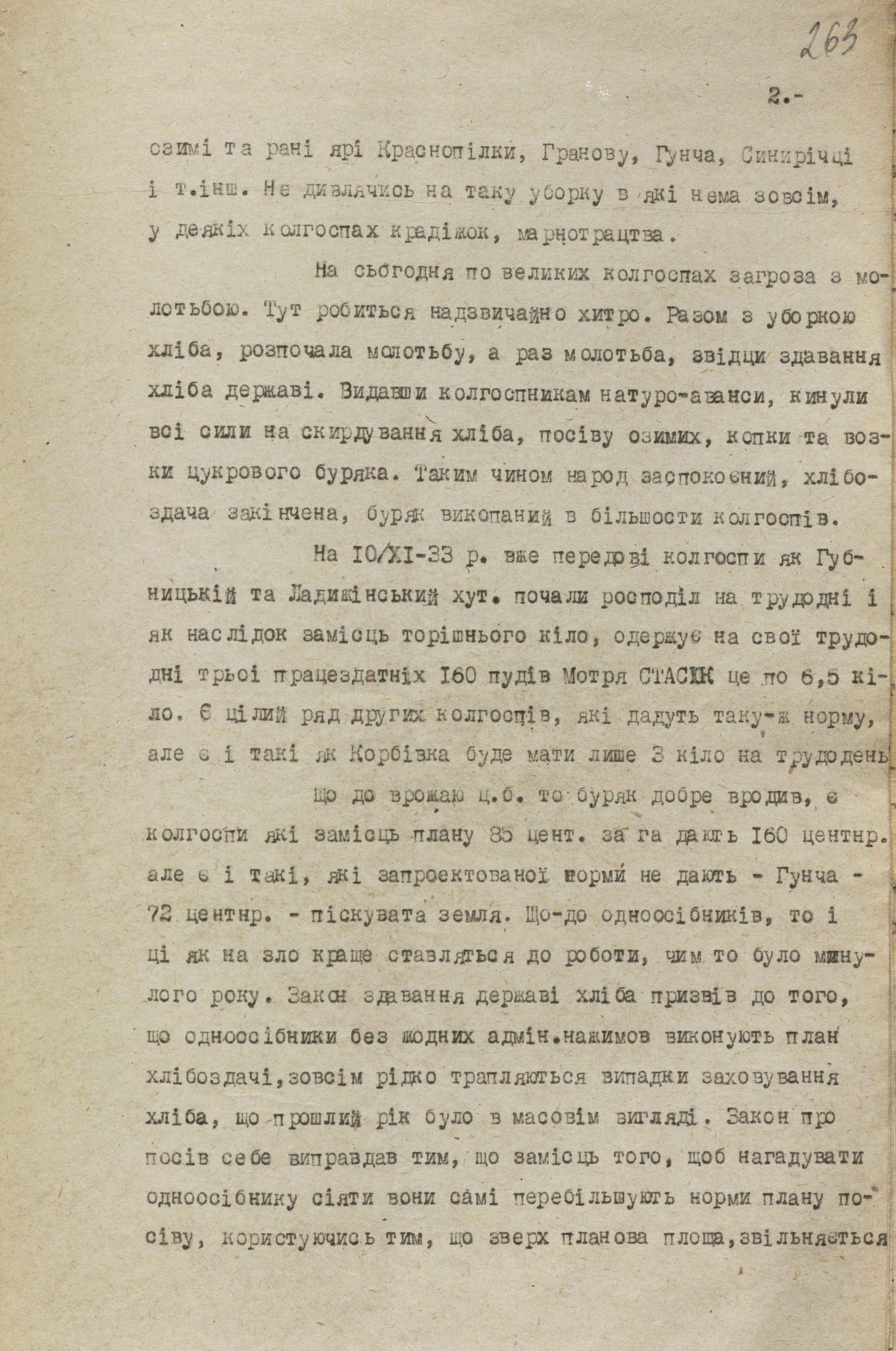 «Весна 1933 р. далась взнаки Гайсинському району, – йдеться в листі, підписаному ініціалами Л. Д. – Надзвичайно скрутне положення було під час обробітку обсіяних ланів як в колгоспах, так і в одноосібному секторах. Голодовка в деякіх селах довела б була до повного зриву весняних робіт, але тут було кинуто допомогу харчовими продуктами як колгоспникам, так і одноосібникам, і з положення вийшли навіть добре. …Уборочна по всьому району пройшла далеко краще, чим то надіялись не тільки ми, а й вони її провести. Приклад села Краснопілка, що об’єднує 850 господ., Губник, що об’єднує таку ж кількість – закінчили уборку головних культур раніш плану. Так як і цілий ряд других колгоспів, кинулись з машинами та людьми на прорив в ті колгоспи, де слабше була організована робота, і допомогли зібрати озимі та ярі…
