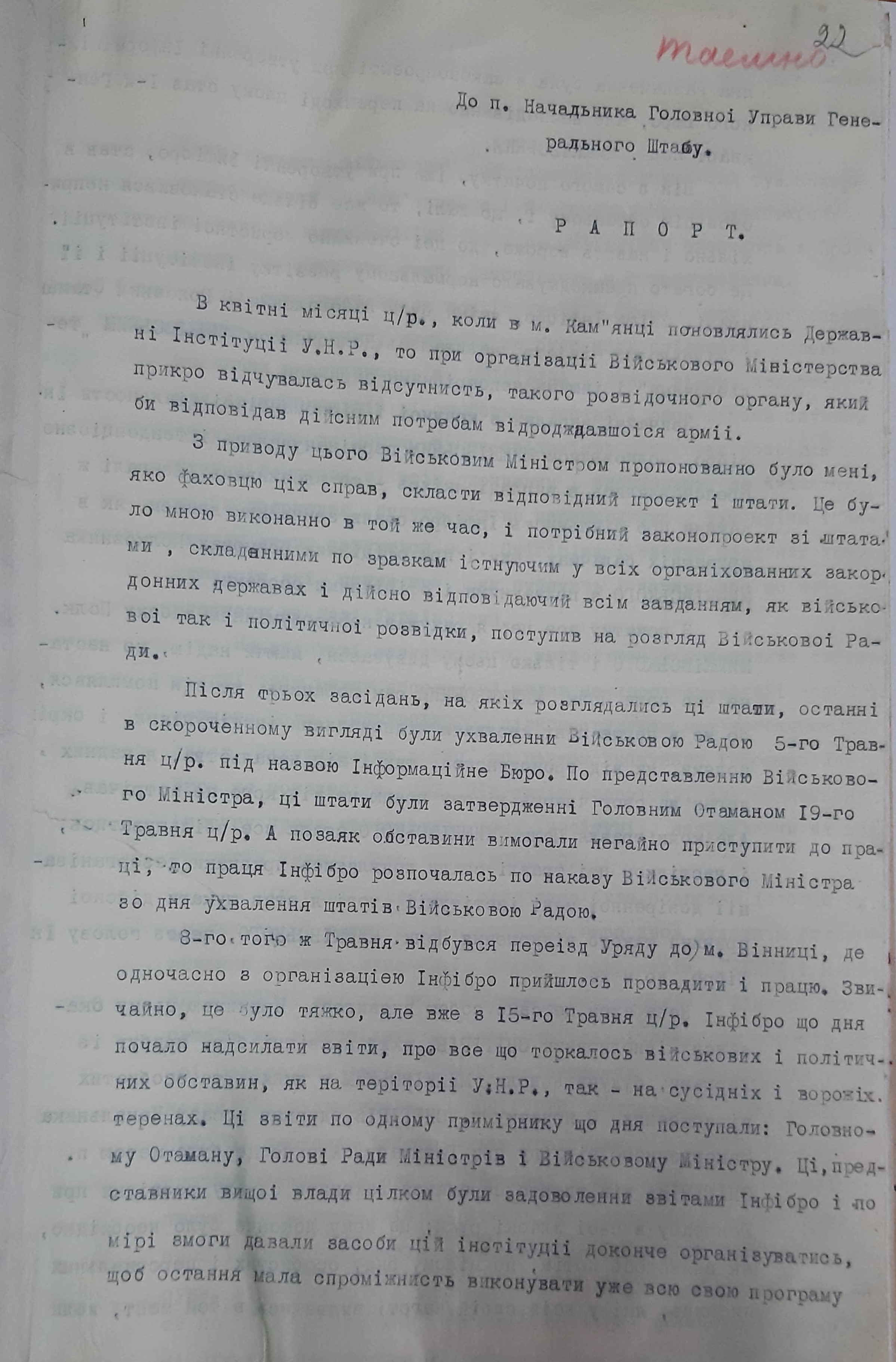 Щоденні картини, виготовлені в “лабораторії” “Інфібро”, повинні надсилатись до Розвідочної управи Генштабу, а ця остання не повинна складати ці картини, а в день одержання розрахувати, якому потребителеві відповідну картину направити, щоб останній мав можливість скористувати те, що буде торкатись до спеціальности цього потребителя»