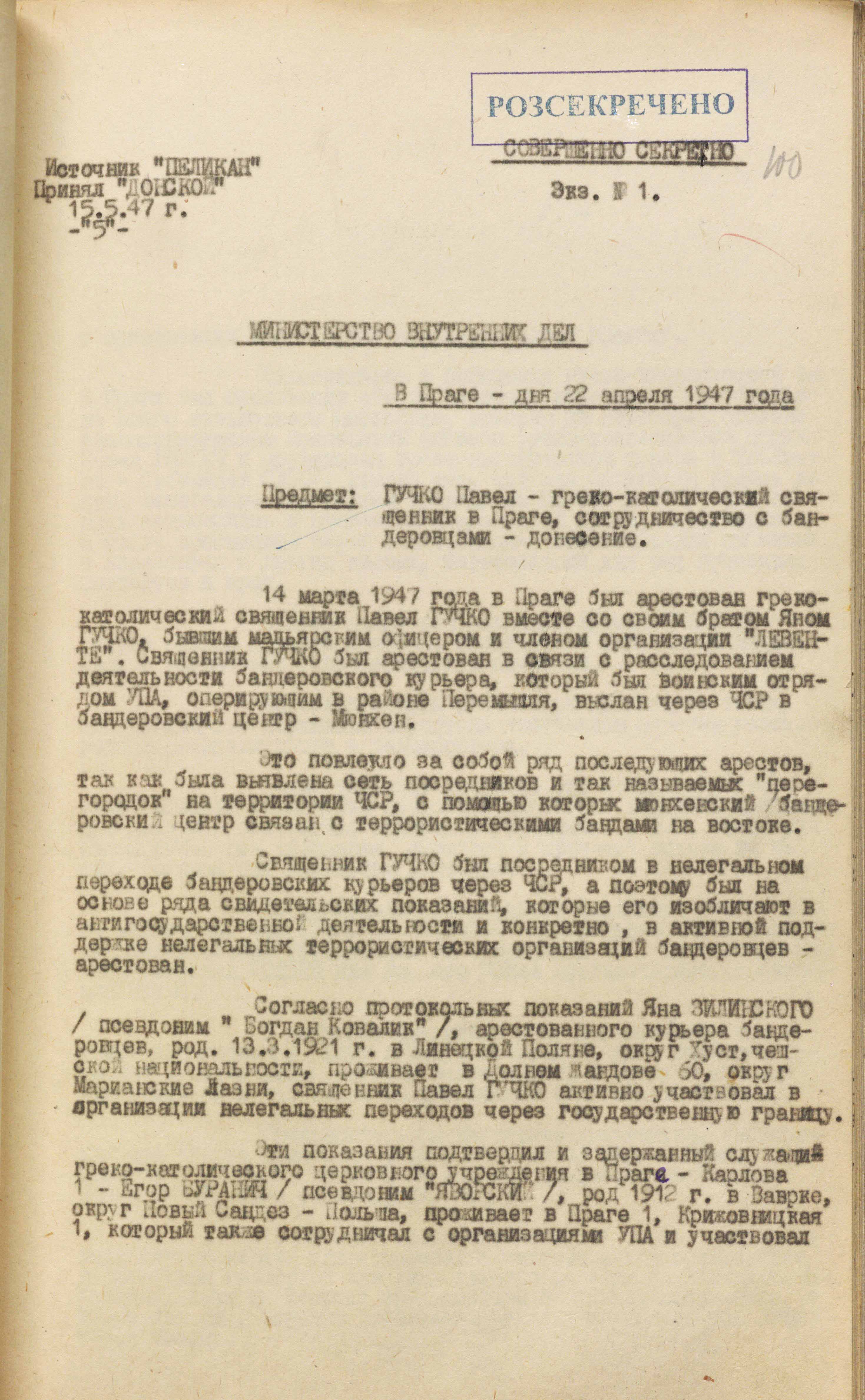 Починалося все з того, що в січні 1947 року органами безпеки Чехословаччини під час переходу кордону із Західною Німеччиною був затриманий кур’єр Проводу ОУН Ян Зелінський (псевдо – Богдан Ковалик). Слідство тривало упродовж чотирьох місяців, після чого суд виніс вирок – довічне ув’язнення. Водночас чекісти почали активно розкручувати іншу лінію справи. Вони з’ясували, що допомогу в переході кордону нібито надавав священник української греко-католицької церкви в Празі Павло Гучко. Його одразу заарештували разом зі священником Єгором Бураничем та іншими.