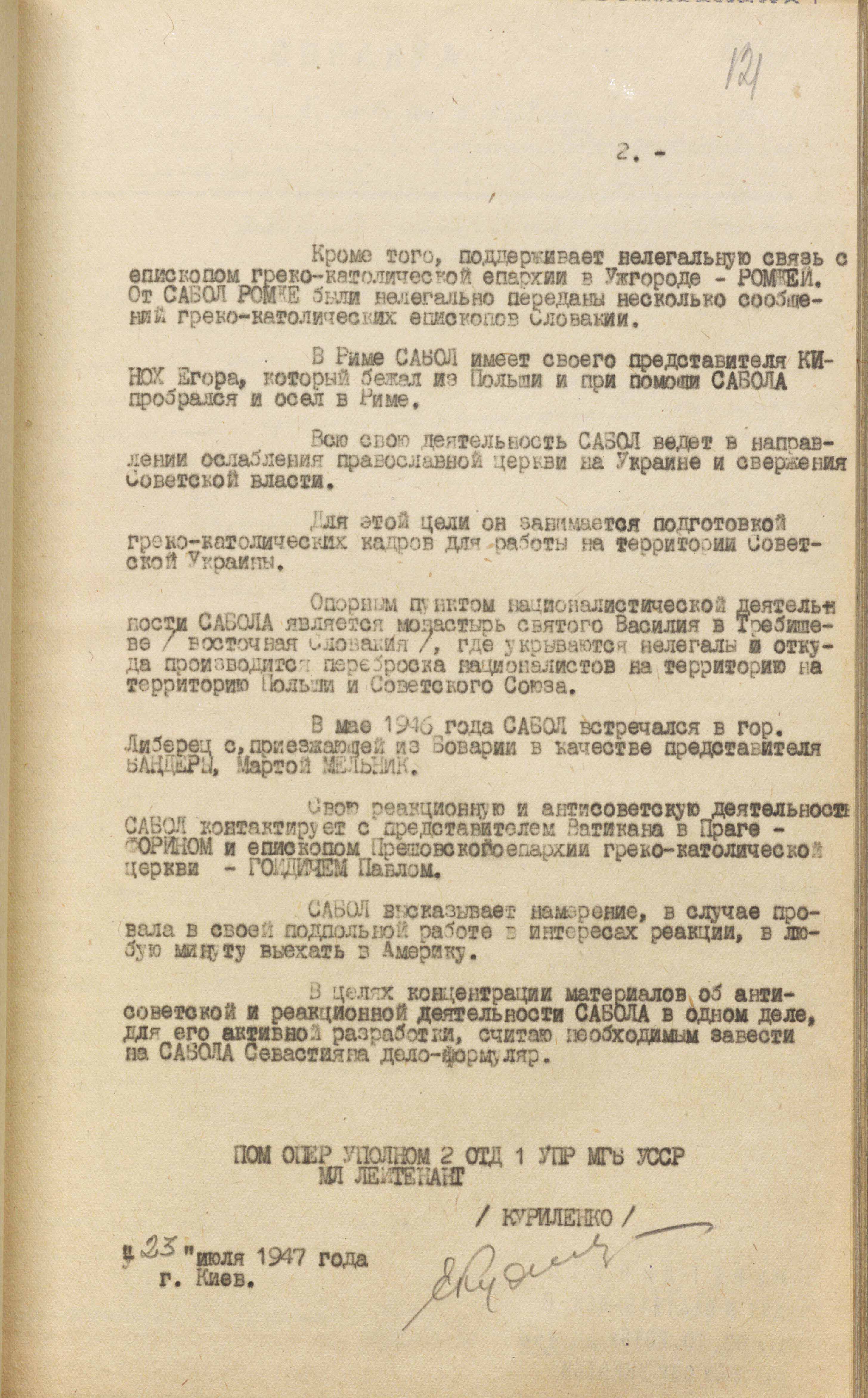 Також встановлено, що значну роль в антирадянській українській націоналістичній діяльності греко-католицького духовенства в Чехословаччині відіграє настоятель монастиря монашого ордену “Василіан” у м. Требишеві протоігумен Севастіян Сабол, який має велику підтримку у Ватикана. Сабол – один із ідеологів українського націоналізму, в Закарпатті відомий як поет (літературний псевдонім Зореслав), непримиренний ненависник Радянського Союзу. Він брав активну участь в українському націоналістичному русі на Закарпатті у період волошинщини. Після окупації угорцями Закарпатської України емігрував до Словаччини. Підтримує нелегальний зв’язок із греко-католицьким духовенством Закарпатської області і єпископом Ромжею, якому пересилає листи і директивні вказівки з Ватикану. У своєму монастирі він переховує бандерівців, забезпечує їх документами і переправляє за межі Чехословаччини в різні країни, зокрема до Америки»