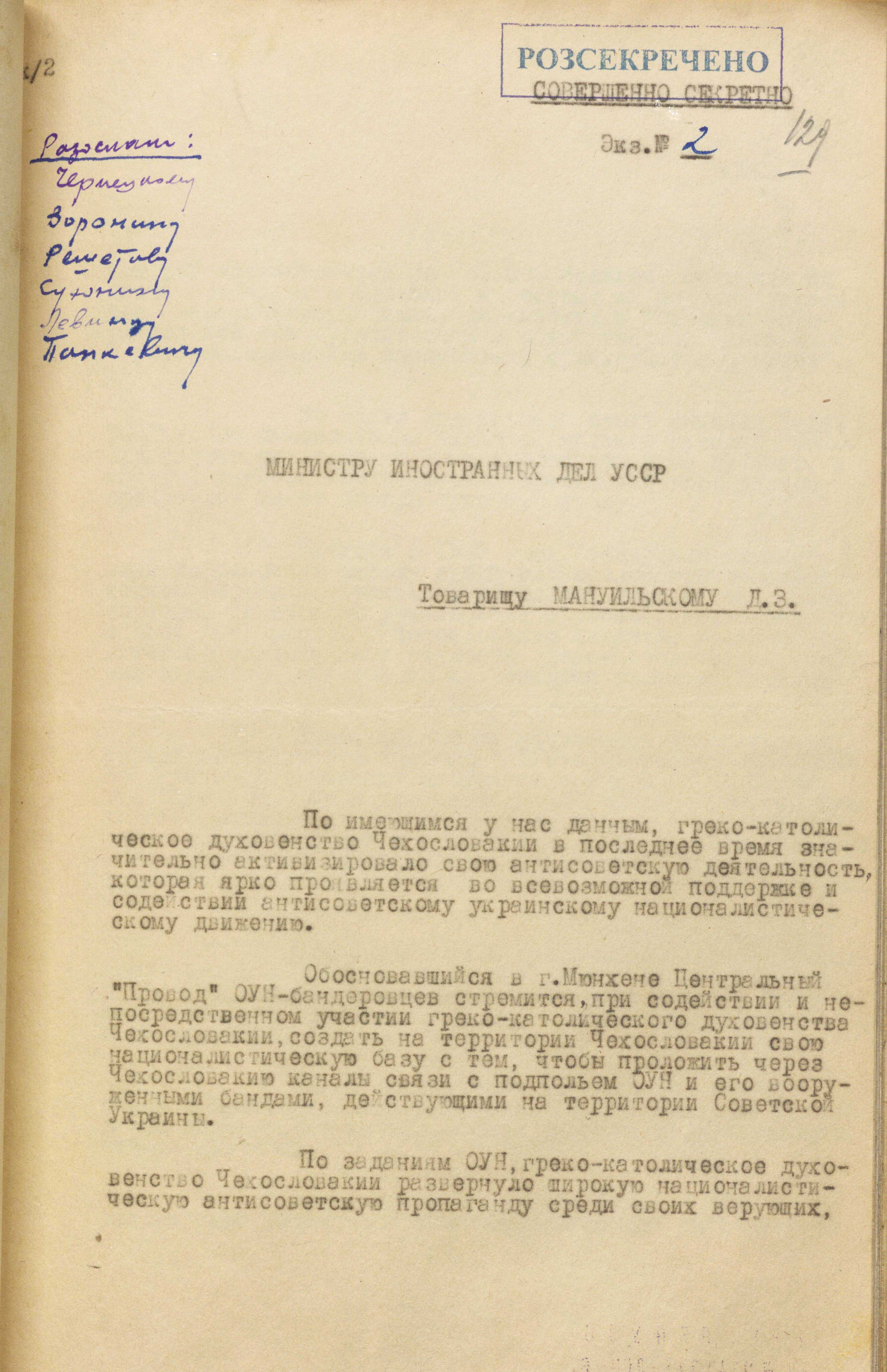 Служба зовнішньої розвідки України на підставі розсекречених документів органів мдб / кдб срср продовжує публікувати матеріали до 80-річчя Львівського псевдособору (8–10 березня 1946 року). Вони дають змогу глибше дізнатися про організацію сталінським режимом спецоперацій із ліквідації Української греко-католицької церкви (УГКЦ) і поглинання її російською православною церквою (РПЦ).
