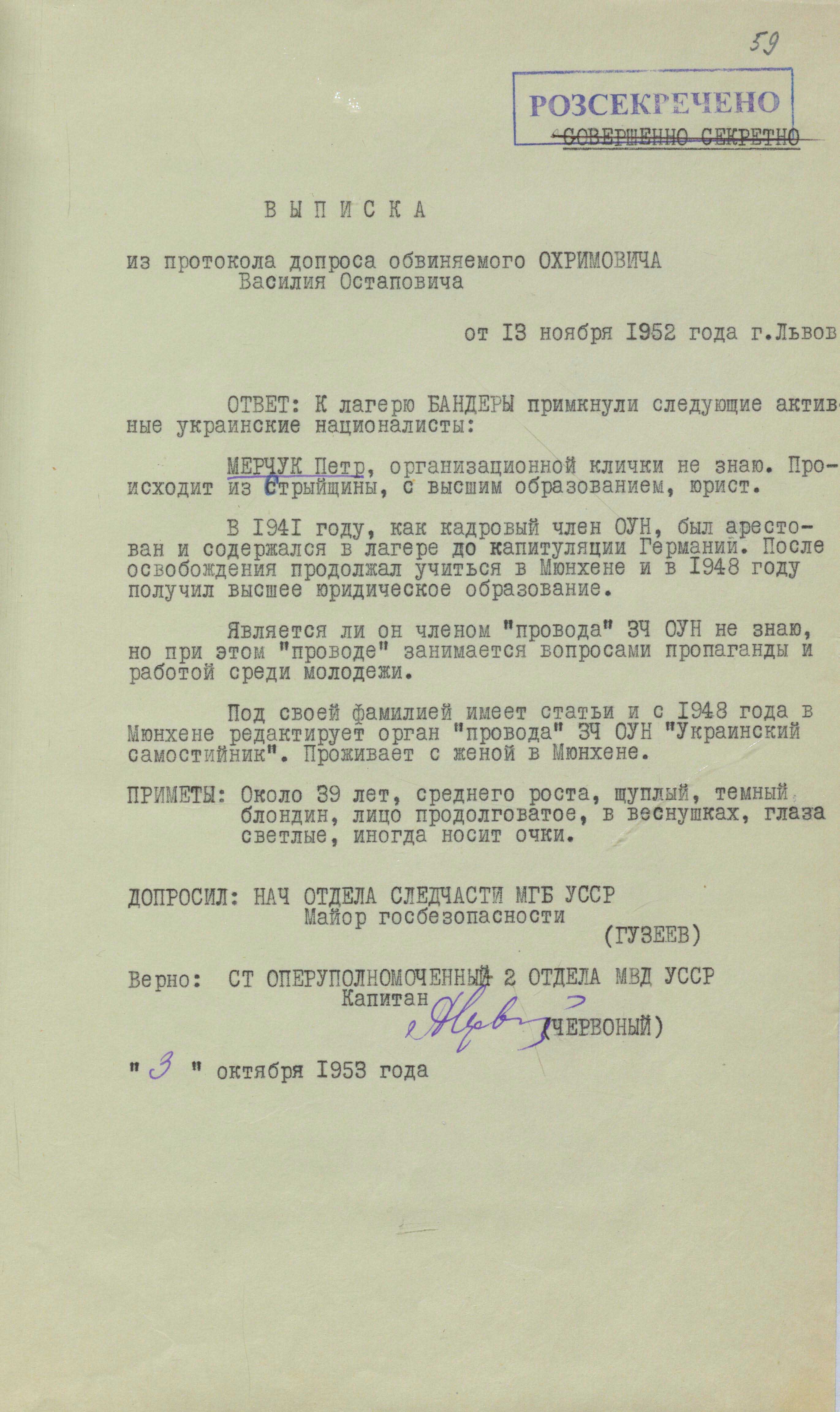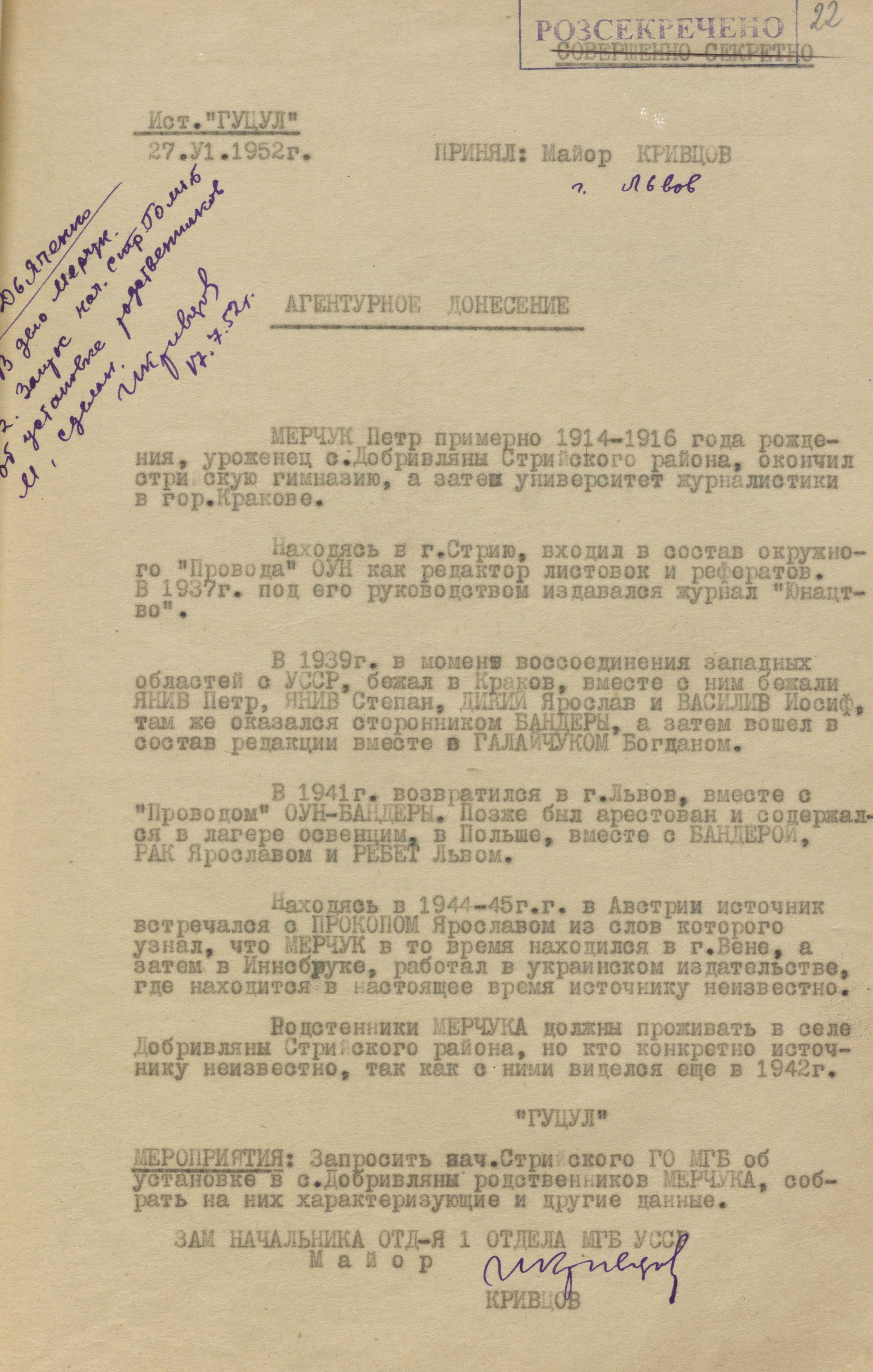 На цю думку наводить текст одного з перших агентурних повідомлень, яке знайшли серед свідчень Віктора Петрова («Іванова») після його таємничого зникнення з Німеччини у 1949 році, і долучили до справи одразу після її заведення. Характеризуючи на прохання чекістів усіх тих, з ким контактував за кордоном, В. Петров писав про П. Мірчука таке: