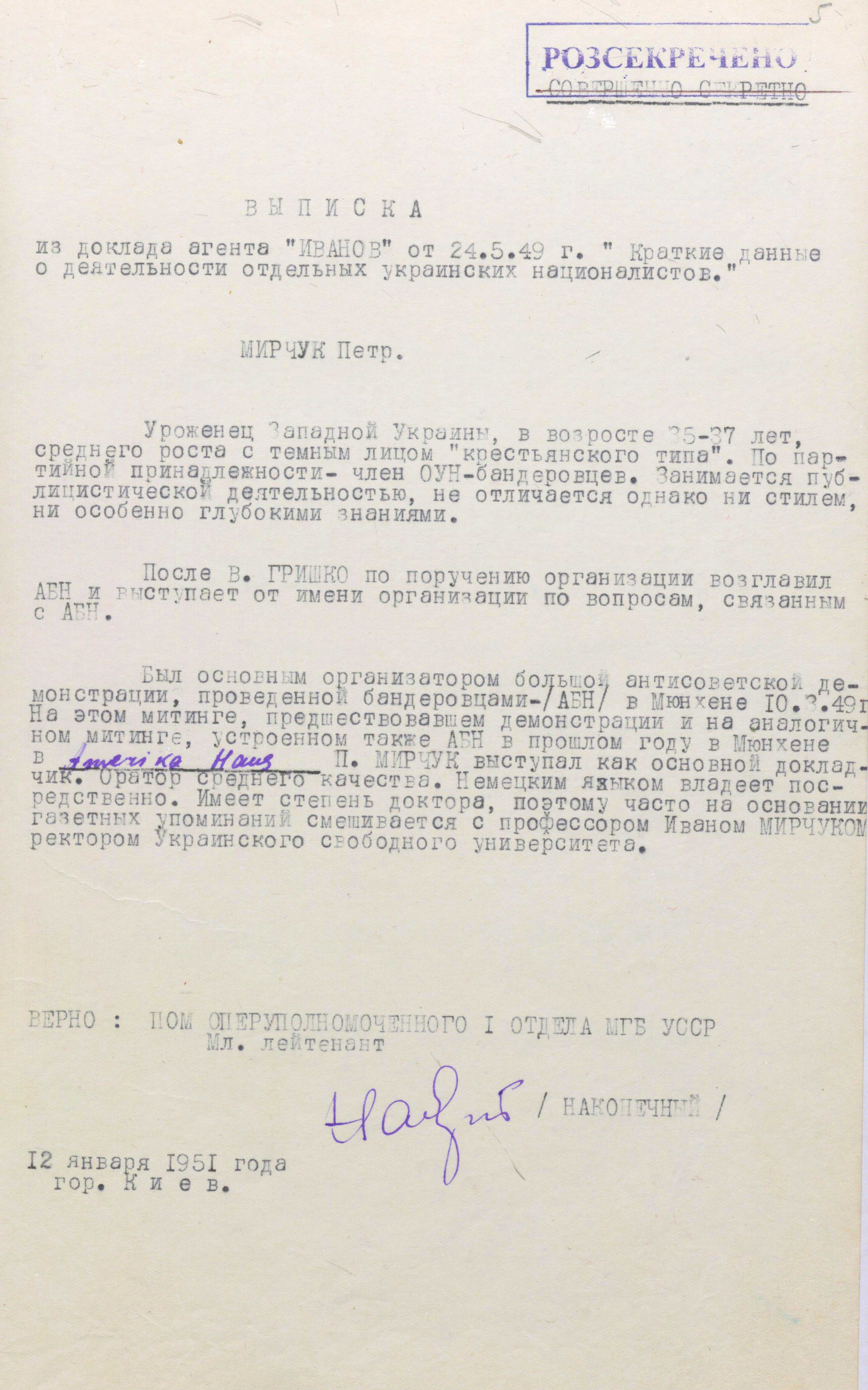 «Мірчук Петро. Уродженець Західної України, у віці 35–37 років, середнього зросту з темним обличчям «селянського типу». За партійною належністю – член ОУН-бандерівців. Займається публіцистичною діяльністю, однак не вирізняється ні стилем, ні особливими знаннями… Був головним організатором великої антирадянської демонстрації, проведеної бандерівцями (АБН) у Мюнхені 10.03.49 р. На цьому мітингу, який передував демонстрації, і на аналогічному мітингу, влаштованому також АБН у минулому році в Мюнхені в Amerika-Haus, П. Мірчук виступав як основний доповідач. Оратор середнього значення. Німецькою мовою володіє посередньо. Має ступінь доктора, тому часто на підставі згадувань у газетах його плутають з професором Іваном Мірчуком – ректором Українського вільного університету»