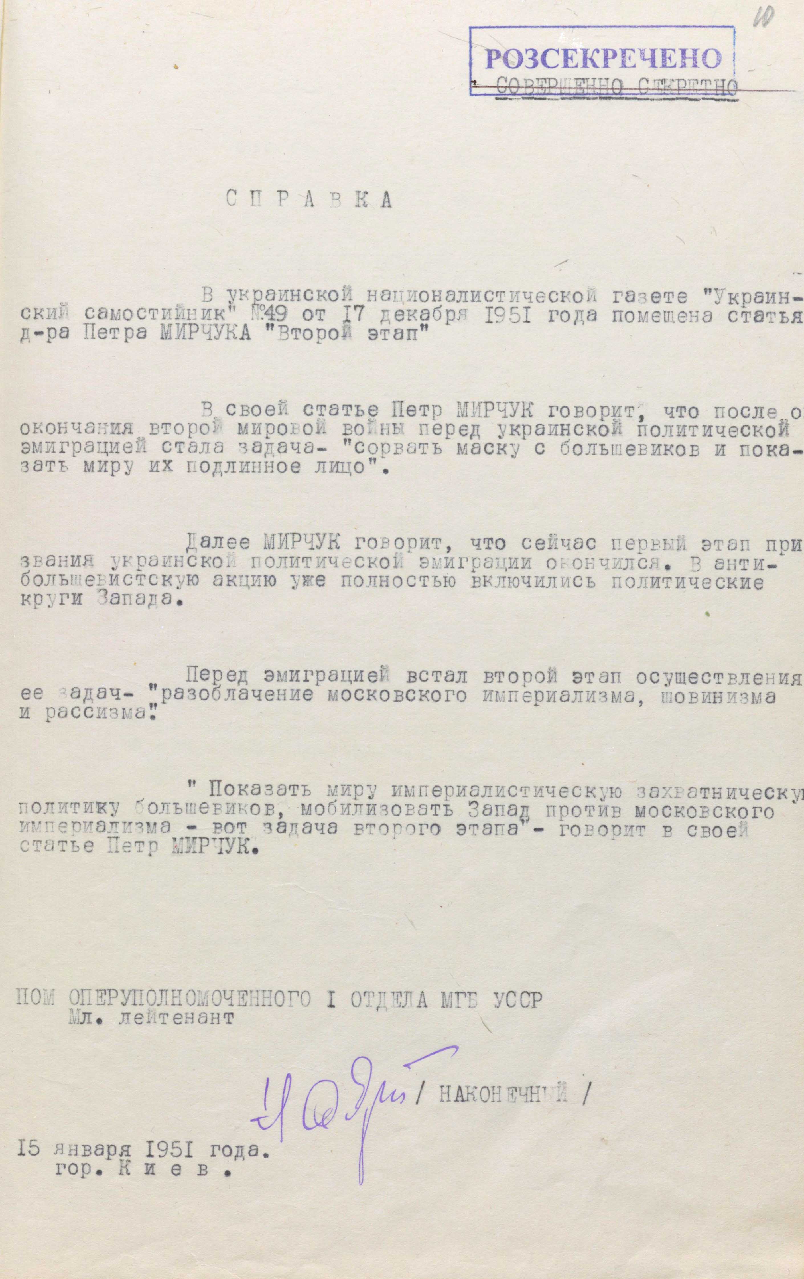 За тогочасною практикою в закордонних резидентурах кдб срср скуповували примірники цих та інших еміграційних газет, ретельно аналізували їхній зміст і за деякими публікаціями навіть заводили справи на авторів антирадянських статей. За часописами, які редагував П. Мірчук, так само пильно стежили. У одній із довідок аналізується його стаття під назвою «Другий етап» у газеті «Український самостійник» № 49 від 17 грудня 1949 року. У ній П. Мірчук зазначав, що після закінчення Другої світової війни перед українською політичною еміграцією постало завдання «зірвати маску з більшовиків і показати світові їхнє справжнє обличчя, … імперіалістичну загарбницьку політику, мобілізувати Захід проти московського імперіалізму».