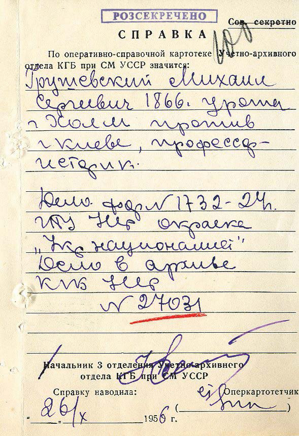 В одній із відповідей на запит зазначалося, що Грушевський Михайло Сергійович, 1866 року народження, уродженець м. Холм, жив у м. Києві, професор-історик. Проходив за справою-формуляром дпу усрр № 1732 за 1924 рік із забарвленням «Український націоналіст». Справа перебуває в архіві кдб урср, № 27031 (ГДА СЗР України. – Ф. 1. Спр. 6760. – Т. 1. – Арк. 100). В іншій ішлося про те, що він був заарештований дпу усрр за ст. 54–6 кримінального кодексу усрр, слідча справа без номера, рішення у справі немає, оскільки він під час слідства помер. Справа зберігається в архіві кдб урср за № 34404 (ГДА СЗР України. – Ф. 1. Спр. 6760. – Т. 1. – Арк. 99–99 зв.).