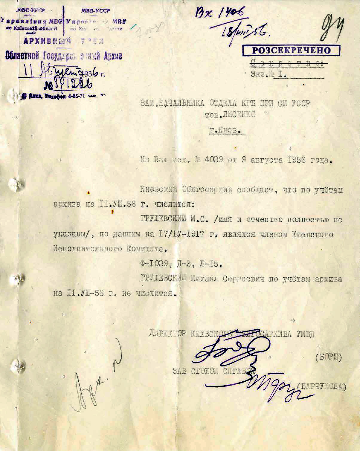 Водночас тоді ж, у серпні 1956 року, на адресу Центрального державного архіву жовтневої революції у Харкові, Київського обласного державного архіву, Архівного управління мвс урср та інших відомств надіслали запити з проханням повідомити, що відомо «про службову і громадську діяльність за 1931–34 рр. колишн. академіка – ідеолога націоналізму Грушевського Михайла Сергійовича, 1866 року народження, а також про обставини його смерті».
