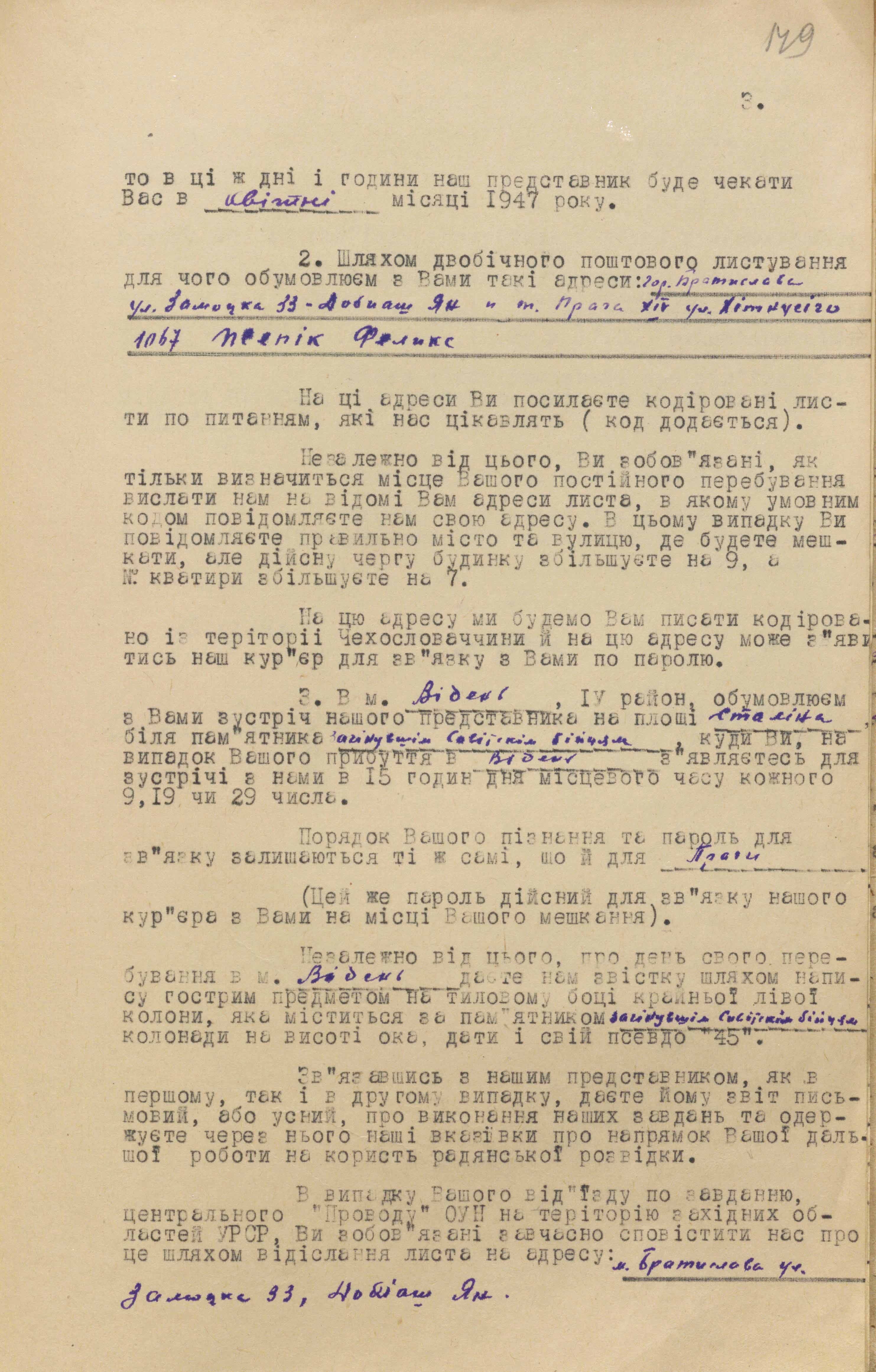 Перед виведенням за кордон із агентом обговорили способи зв’язку. Йому дали адреси поштових скриньок для кодованого листування у Празі й Братиславі. Передбачалося, що після узгодження дати, часу і місця на зустріч із ним виходитимуть працівники підрезидентур мдб урср «Вузол» і «Десна» відповідно у Празі та Відні. Перша явка була призначена в Празі на 9 березня 1947 року.