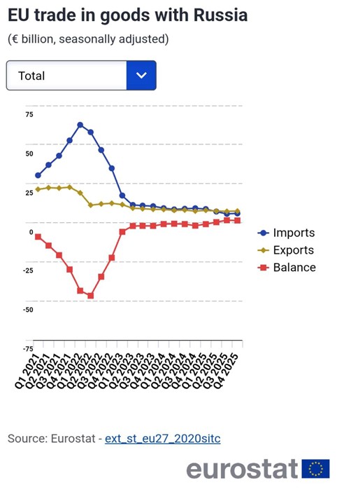 За період із першого кварталу 2022 року по четвертий квартал 2025 року експорт ЄС до рф зменшився на 61%, тоді як імпорт із рф обвалився на 90%. Частка росії у структурі зовнішніх поставок Євросоюзу скоротилася з 3,2% до 1,2%, а в імпорті — з 9,2% до 1,0%. Таким чином, росія фактично втратила статус одного з ключових торговельних партнерів об’єднаної Європи.